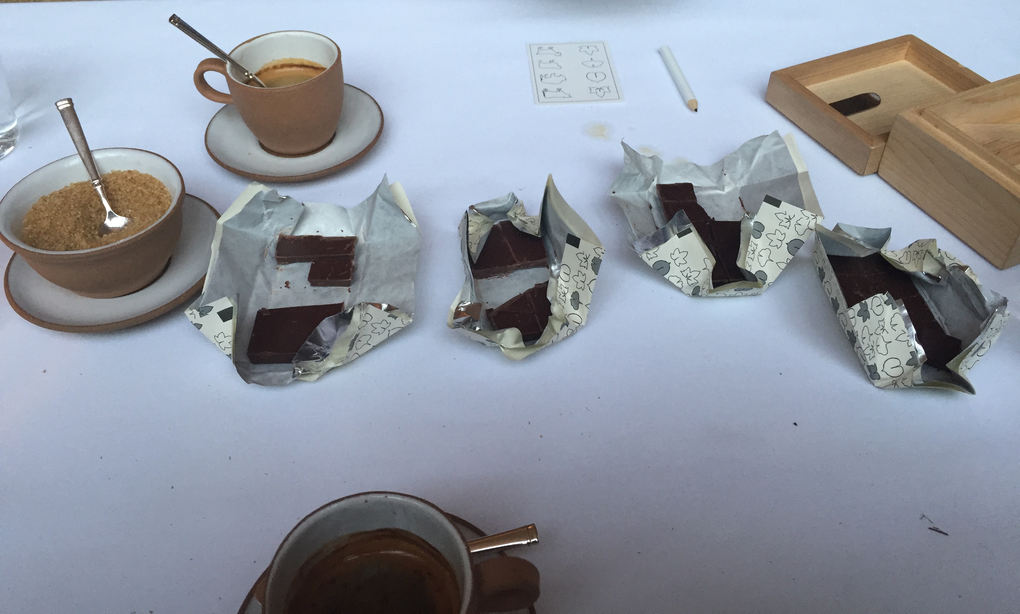 Schokoladen aus Milch vier verschiedener Tiere. Man musste raten, welche Schokolade von welcher Milch stammte.