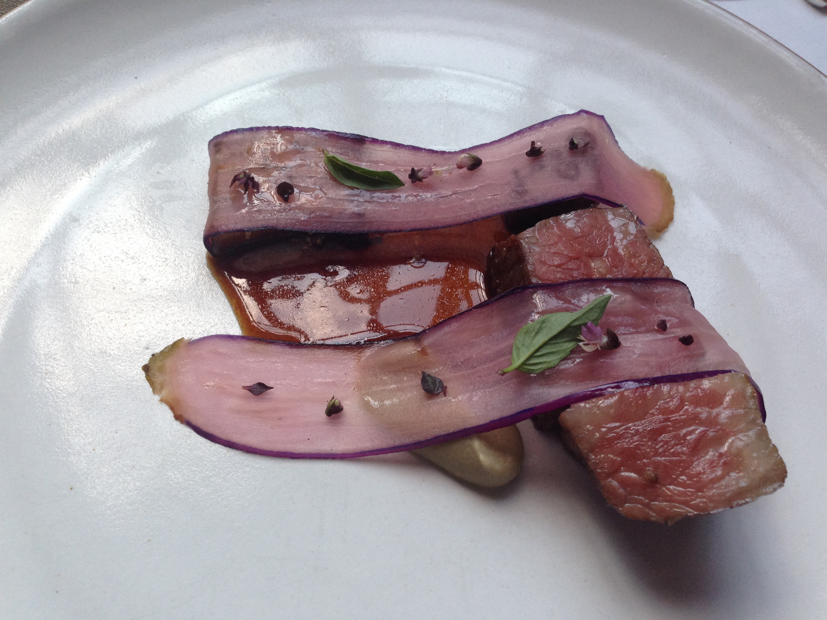 Trocken-gereiftes Ribeye mit Aubergine und Brühe