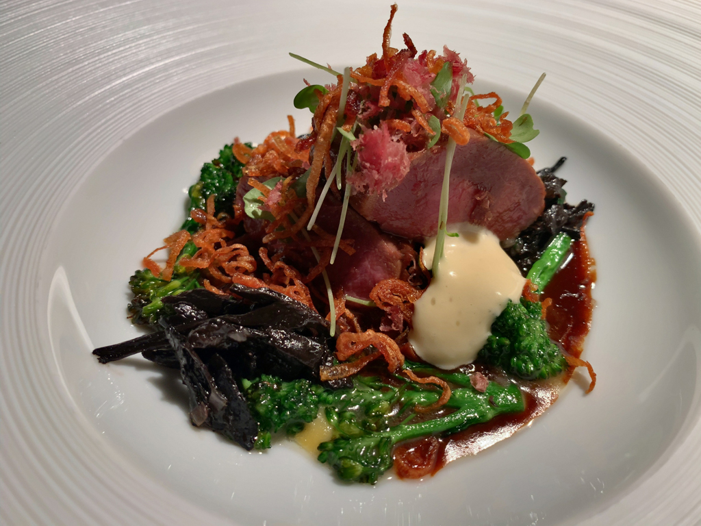 Nun folgte die gebratene Entenleber, die von einem Kürbissalat bedeckt war. Umgeben war die Leber, die eine schön knusprige Kruste (Panko?) hatte, von einem gelben Thai-Curry-Sud. Am Tisch wurde Kaffir Limette darüber gerieben. Die Qualität der Leber war gut, bis auf eine dünne Sehne, die ich aus der Leber herausgearbeitet hatte, bevor diese den Weg in den Mund fand. Kann vorkommen. Wie der Kabeljau im Restaurant Aqua war dies etwas schwierig zu essen, da der Kürbissalat gerollt in dünnen zusammenhängenden Streifen kompakt auf der Leber thronte. Dafür gäbe es zwei Lösungen: kleinteiliger anrichten, d.h. Kürbisstreifen vorgeschnitten aufsetzen, oder dem Besteck ein wirklich scharfes Messer hinzufügen.
