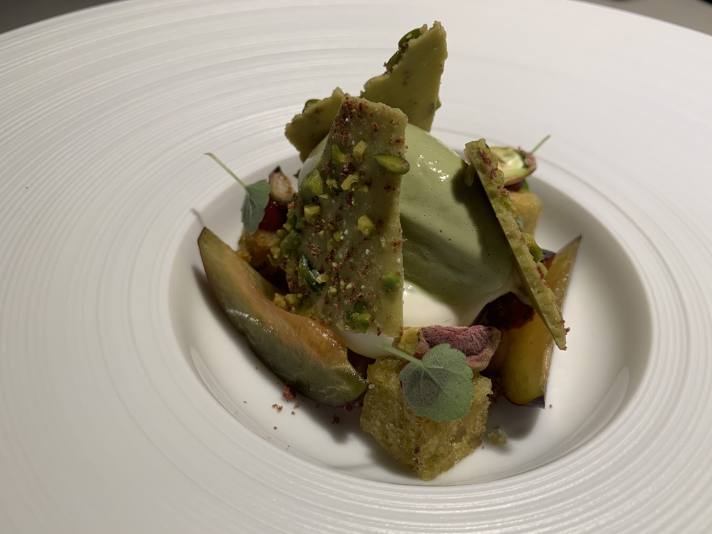 Ich habe mich dann doch noch überzeugen lassen, ein Dessert zu nehmen und zwar Spalten der Bühler Zwetschge, Schokoladenganache am Boden des Tellers, darauf ein Schaum vom griechischen Joghurt und eine Pistazien-Eiscrème. Begleitet wurde es noch von Würfeln Pistazienkuchen und dreieckigen Abschnitten heller Pistazienschokolade. Dies war ein wohlschmeckendes Dessert. Ich hätte die Zwetschgen sogar weggelassen, die übrigen Komponenten machten daraus schon ein sehr gutes Dessert.