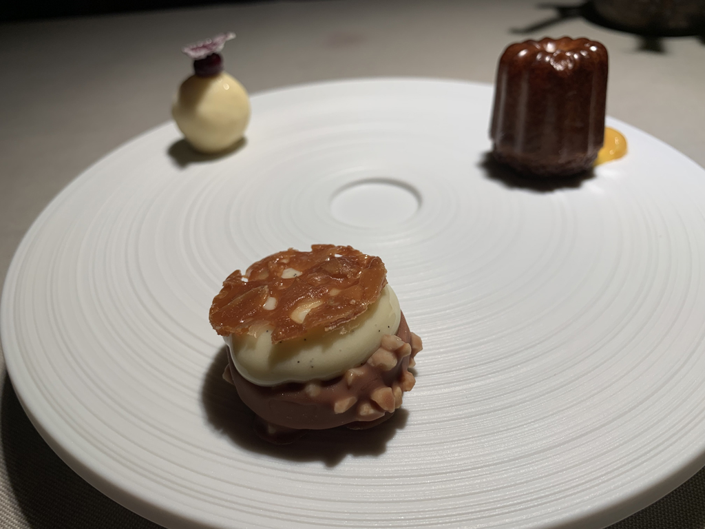 Der Canelé, in dem Vanille aus dem traditionellen Rezept durch Tonkabohne ersetzt war, schmeckte sehr gut. Untendrunter war noch etwas Passionsfruchtcrème.