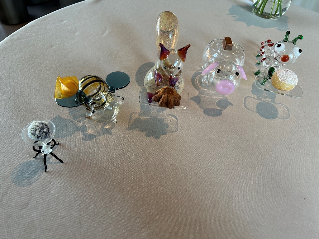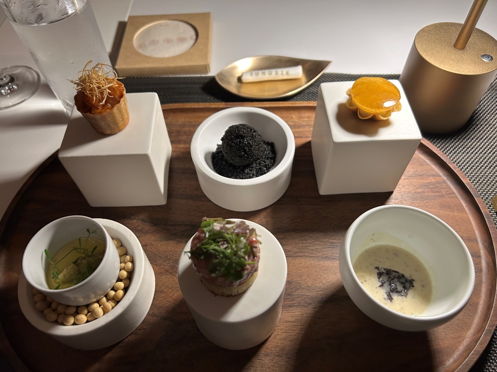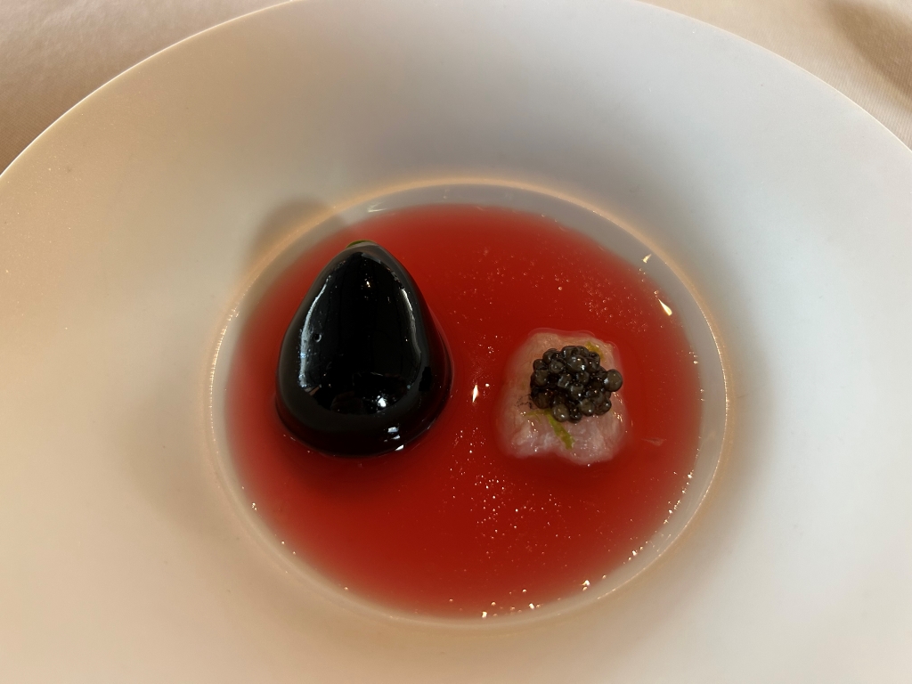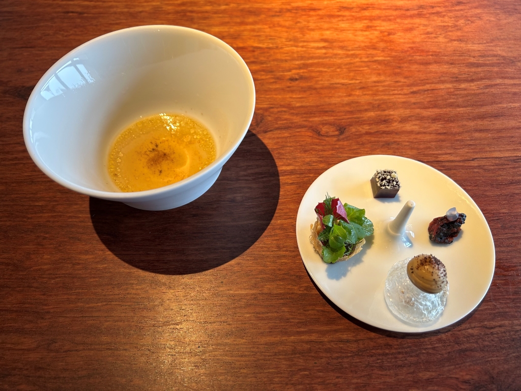 Die Einstimmungen bilden die 5 Geschmacksrichtungen teils subtil aber treffend ab. Die rote Beete wird als Gelwürfel dargeboten. Die Tomate ist mariniert, angetrocknet und hat Kombu- Gel obenauf. Auf dem Kristallbrot befindet sich Kohlcrème und Shiitakepulver. Beim Salat hat man Radicchio verwendet, um das Bittere zu betonen. Gouda, Alge und Thymian-Butter als einzige Änderung zum Sommer wurden für eine Brühe benutzt.