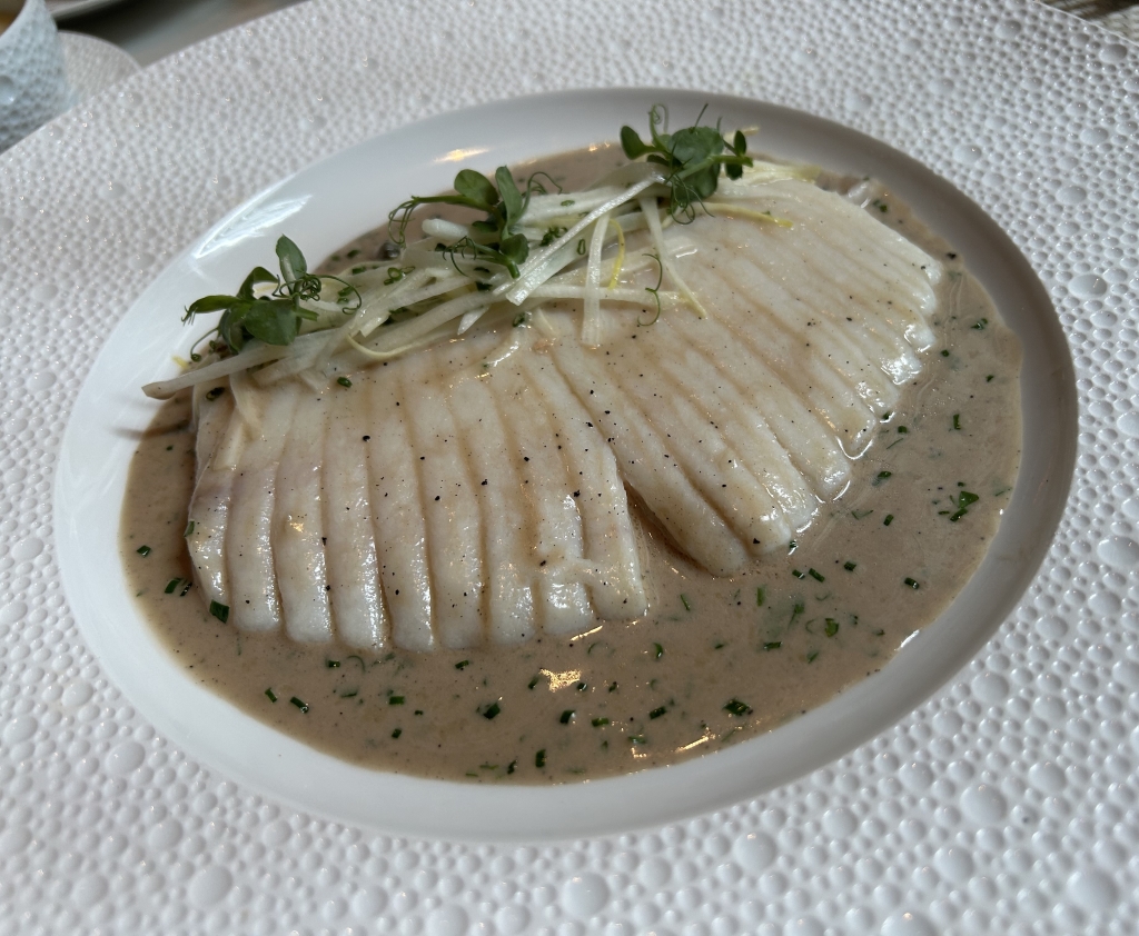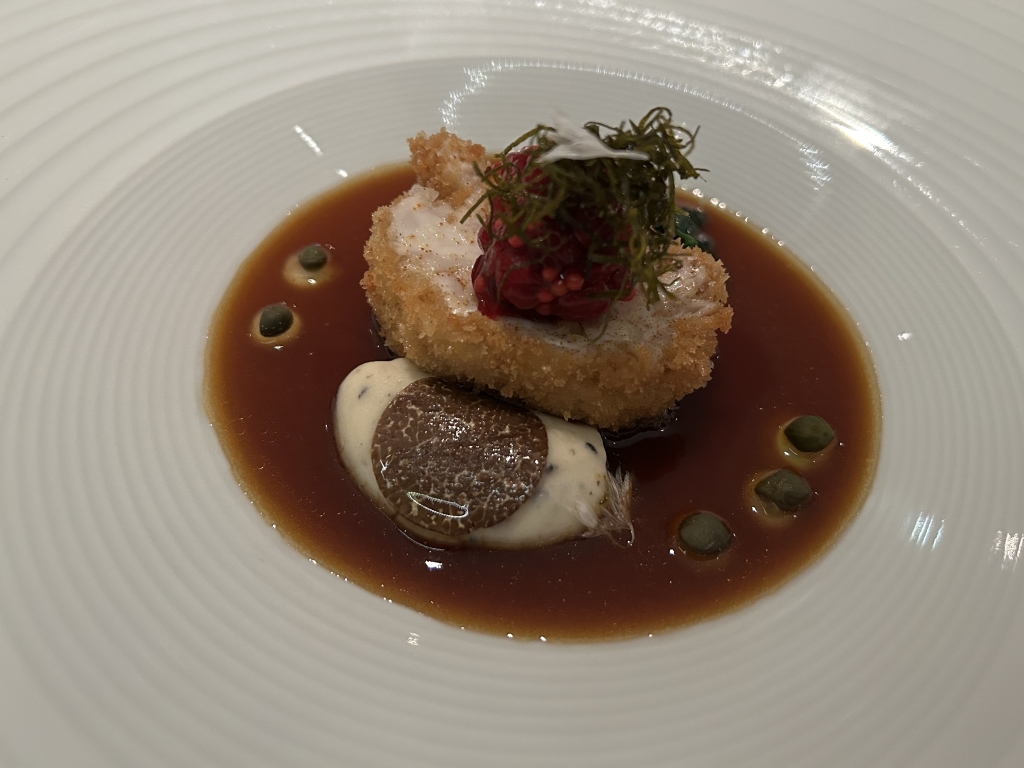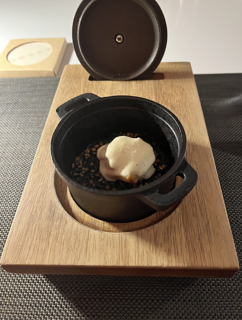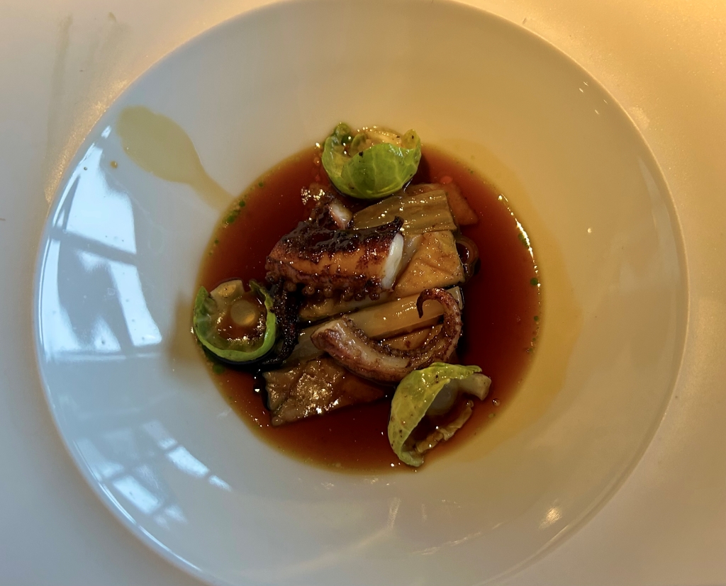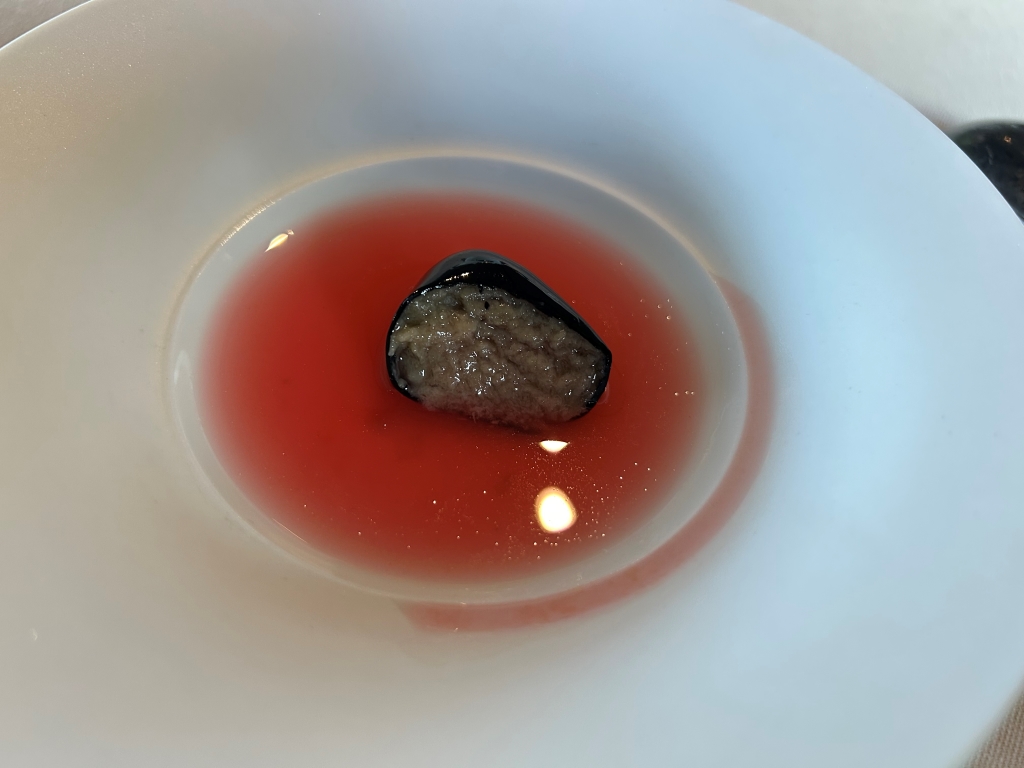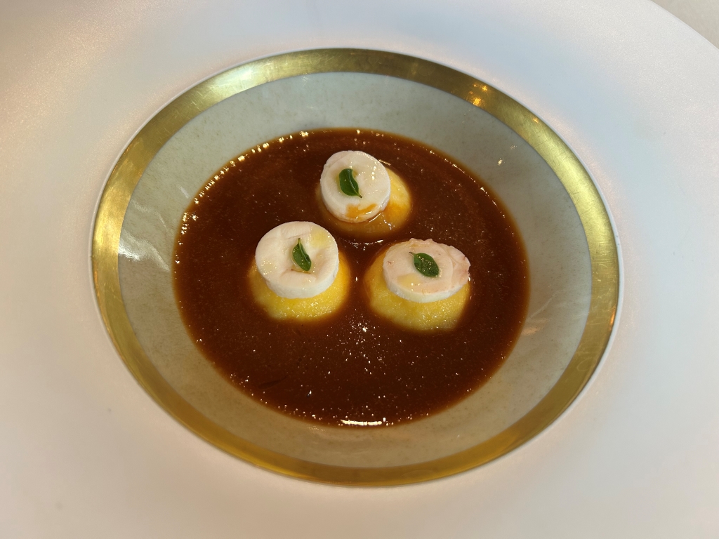 Da war er wieder, der Teller mit ordentlich Wumms. Letztes Mal waren es die Bohnen, hier nun gegrillte Stücke vom Kalmar mit Rosenkohl und einer sehr intensiven Consommé vom Rind. Der Teller zeichnete sich durch eine interessante Textur der Hauptzutat und ordentlich Umami aus.
