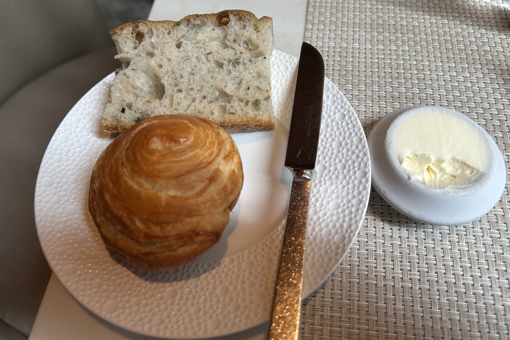 Schnittlauch-, Rosmarin- und Chili-Öl, aufgeschlagene Joghurtbutter und Brot. Wie immer gut.