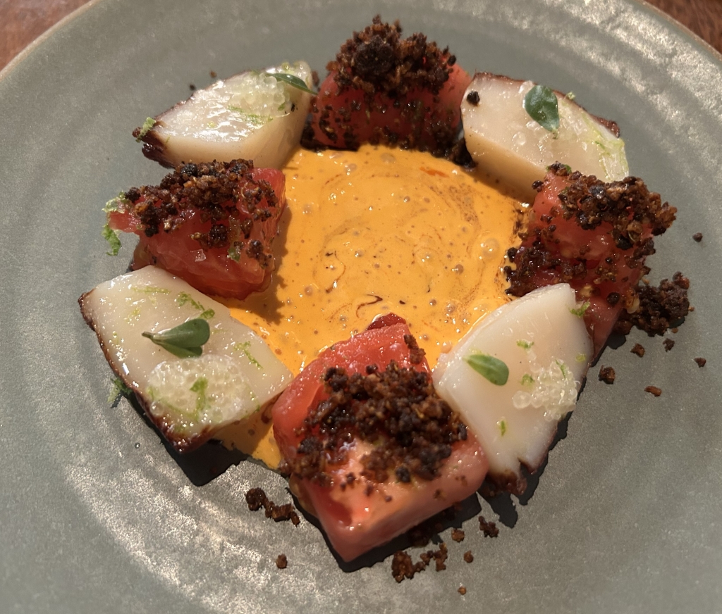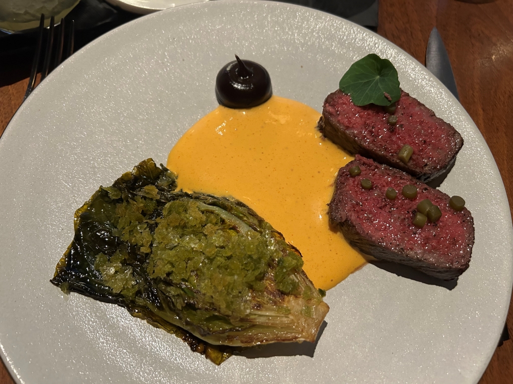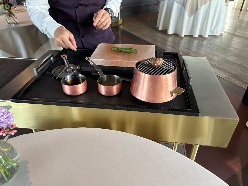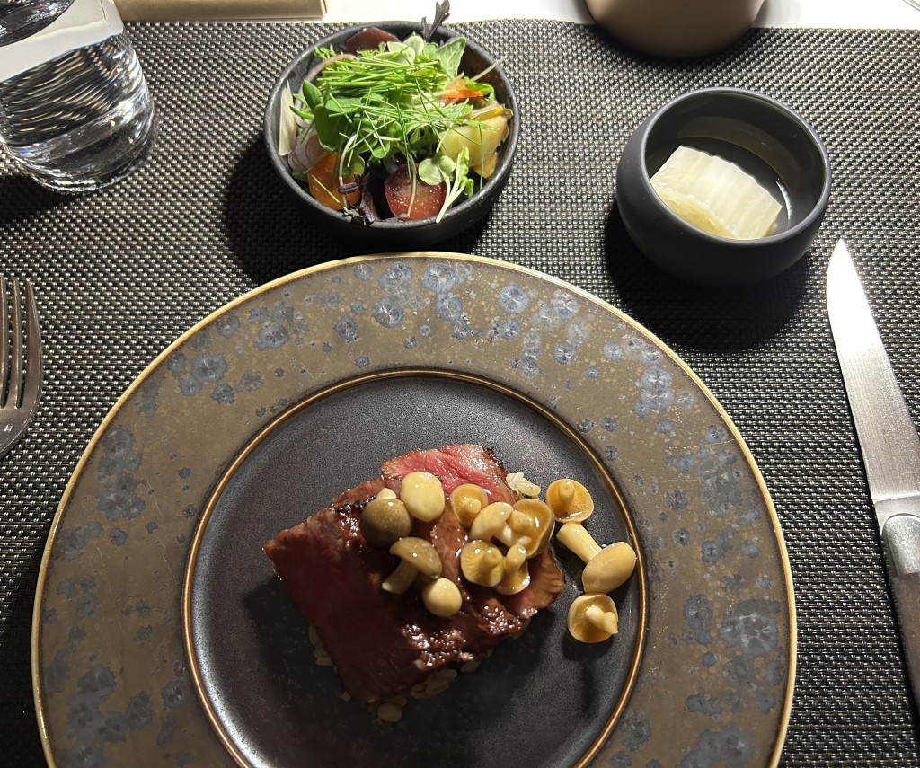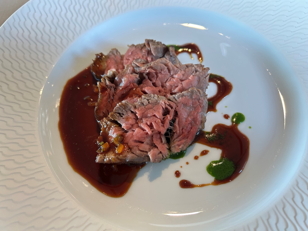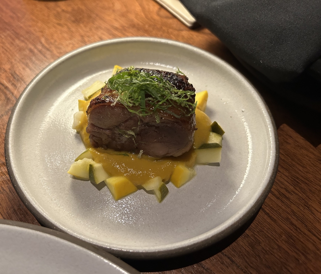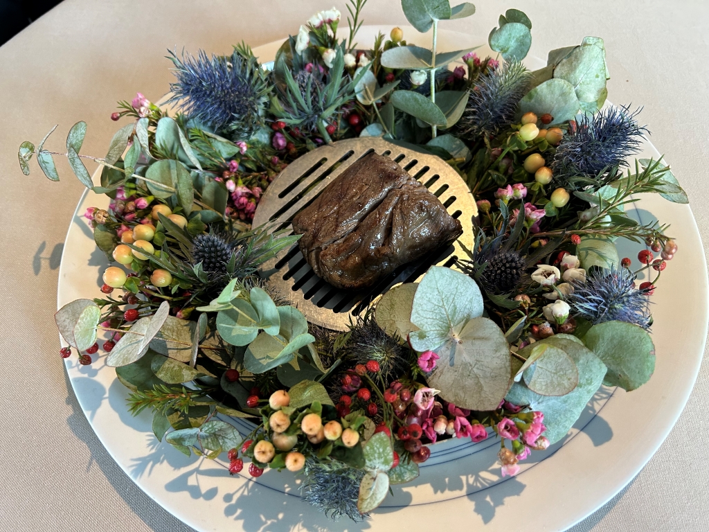 Ich konnte in der Küche sehen, wie das Stück auf dem Binchotan-Grill langsam von oben nach unten wanderte, also immer grösserer Hitze ausgesetzt wurde. Das resultierte dann in schönen Grillaromen. Texturell war das Stück etwas fester als bei einer sanften Zubereitung im Ofen, nicht unangenehm.