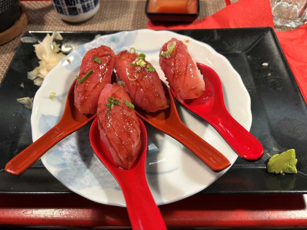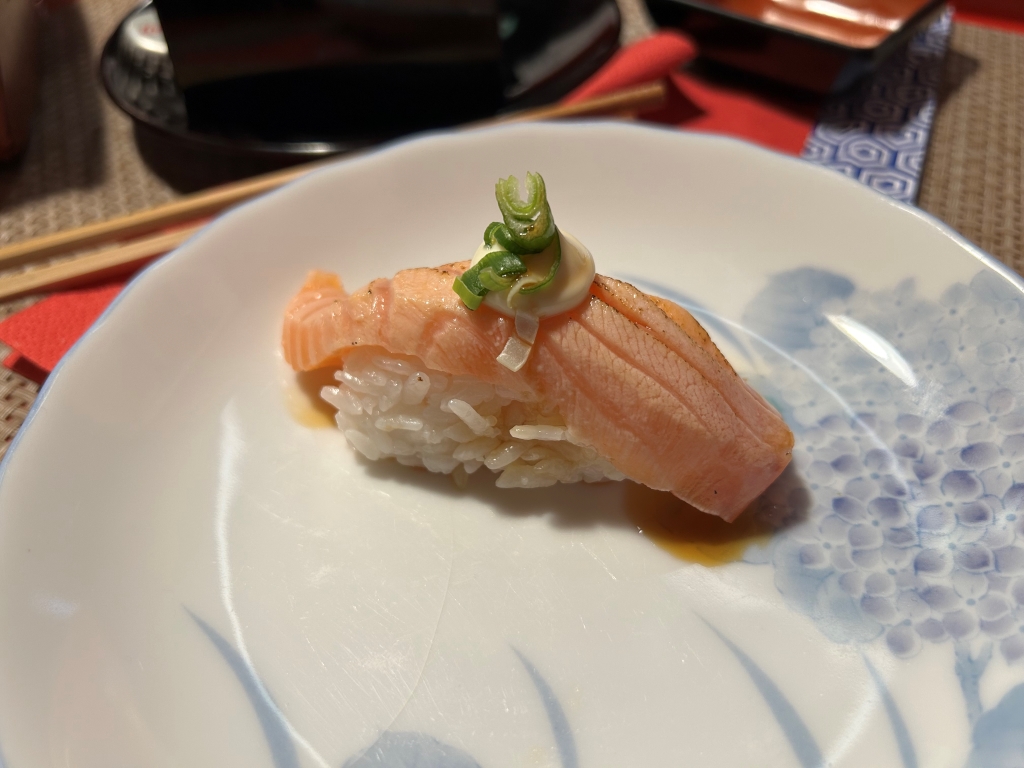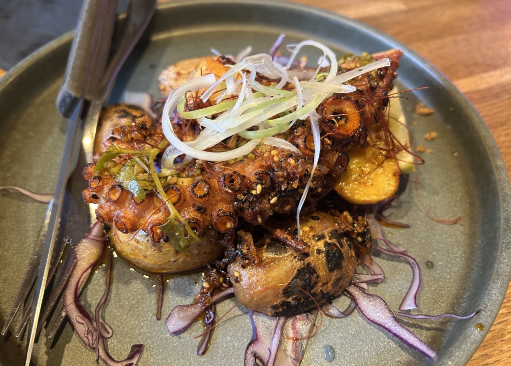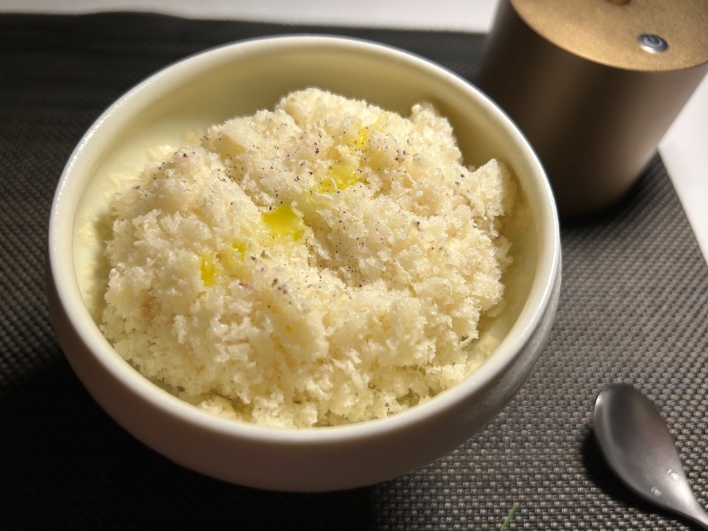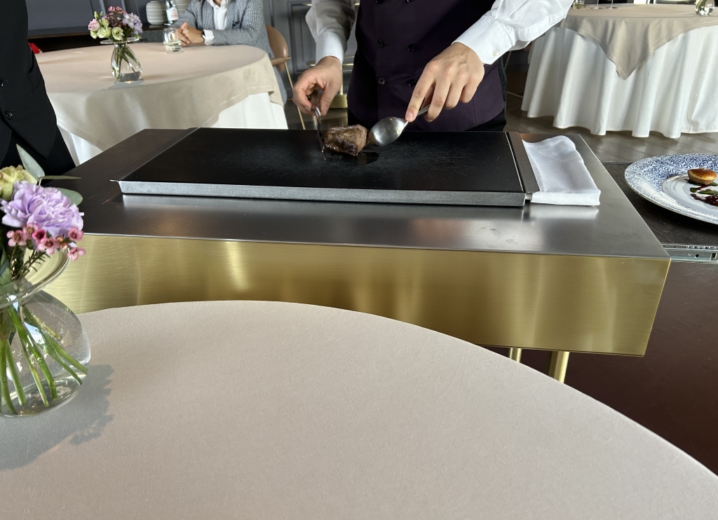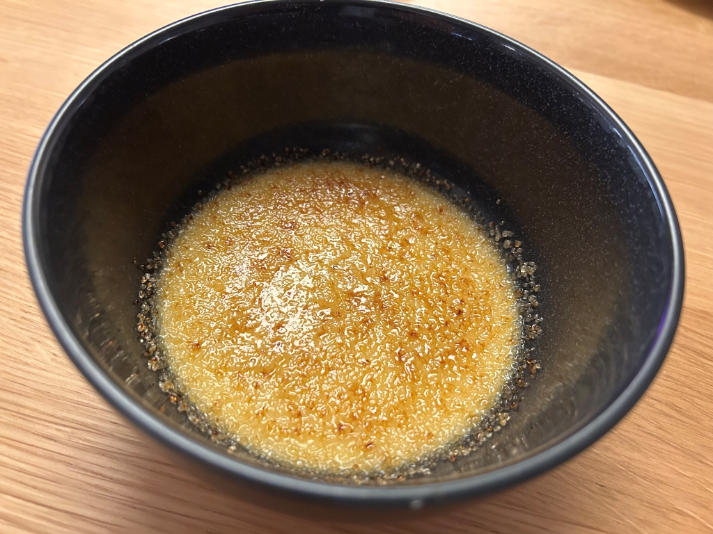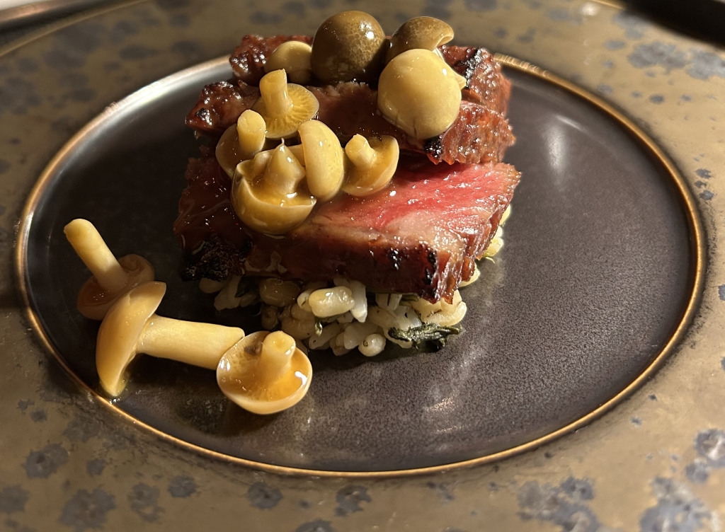 Ich konnte in der Küche sehen, wie das Stück auf dem Binchotan-Grill langsam von oben nach unten wanderte, also immer grösserer Hitze ausgesetzt wurde. Das resultierte dann in schönen Grillaromen. Texturell war das Stück etwas fester als bei einer sanften Zubereitung im Ofen, nicht unangenehm.