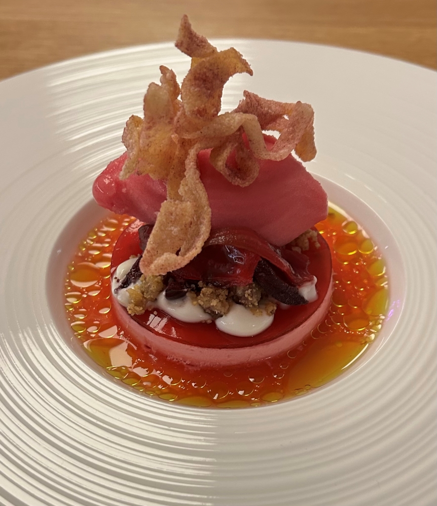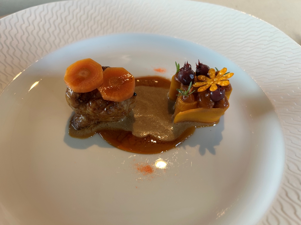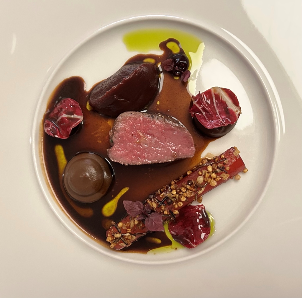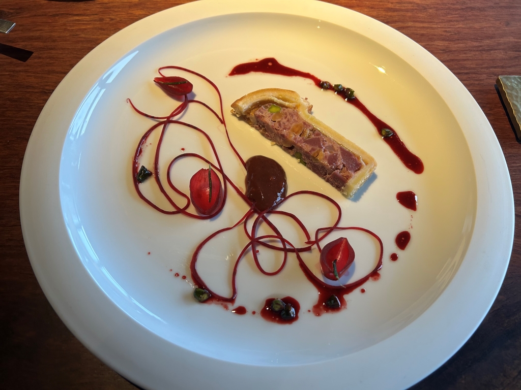 Eingelegte rote Zwiebel, rote Beete-Schnüre, geräucherte Pistazien und eine rote Beete–Rose- Wacholder-Vinaigrette komplettierten dieses Gericht. Die Pastete war handwerklich einwandfrei umgesetzt und die Sauce Cumberland passte sehr gut dazu.