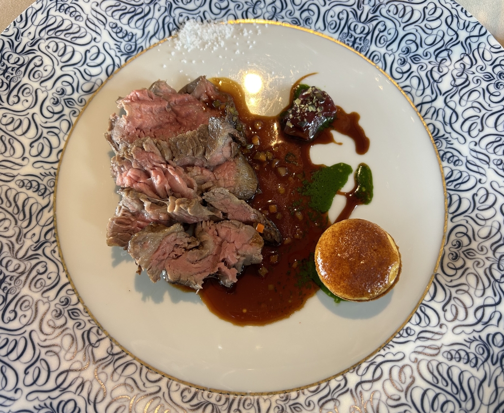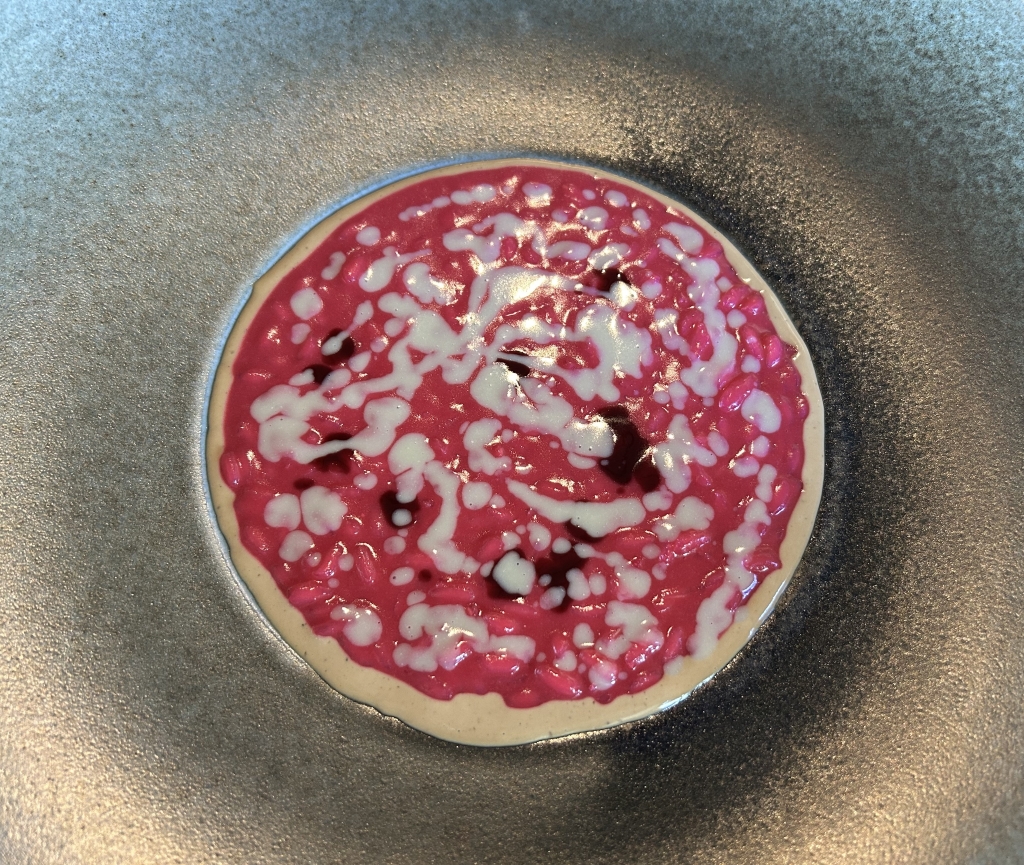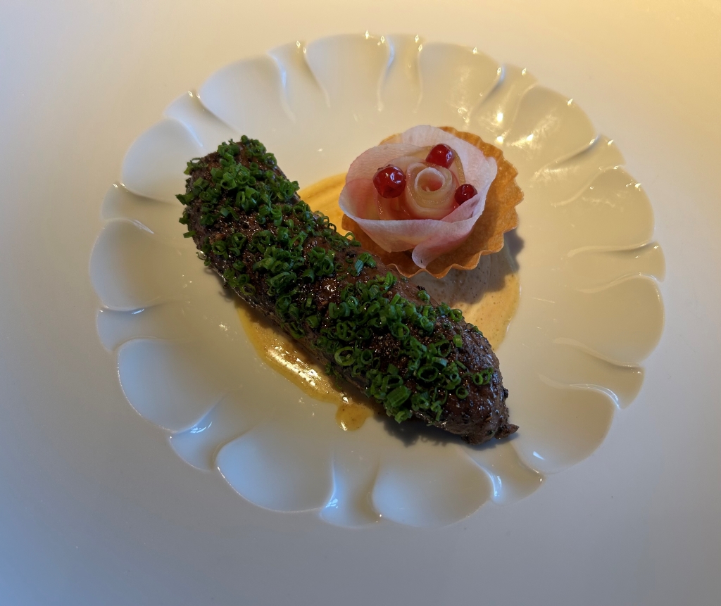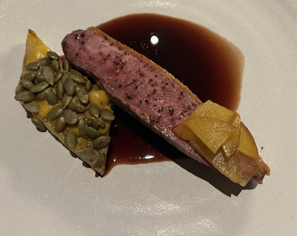 Eingelegte rote Zwiebel, rote Beete-Schnüre, geräucherte Pistazien und eine rote Beete–Rose- Wacholder-Vinaigrette komplettierten dieses Gericht. Die Pastete war handwerklich einwandfrei umgesetzt und die Sauce Cumberland passte sehr gut dazu.