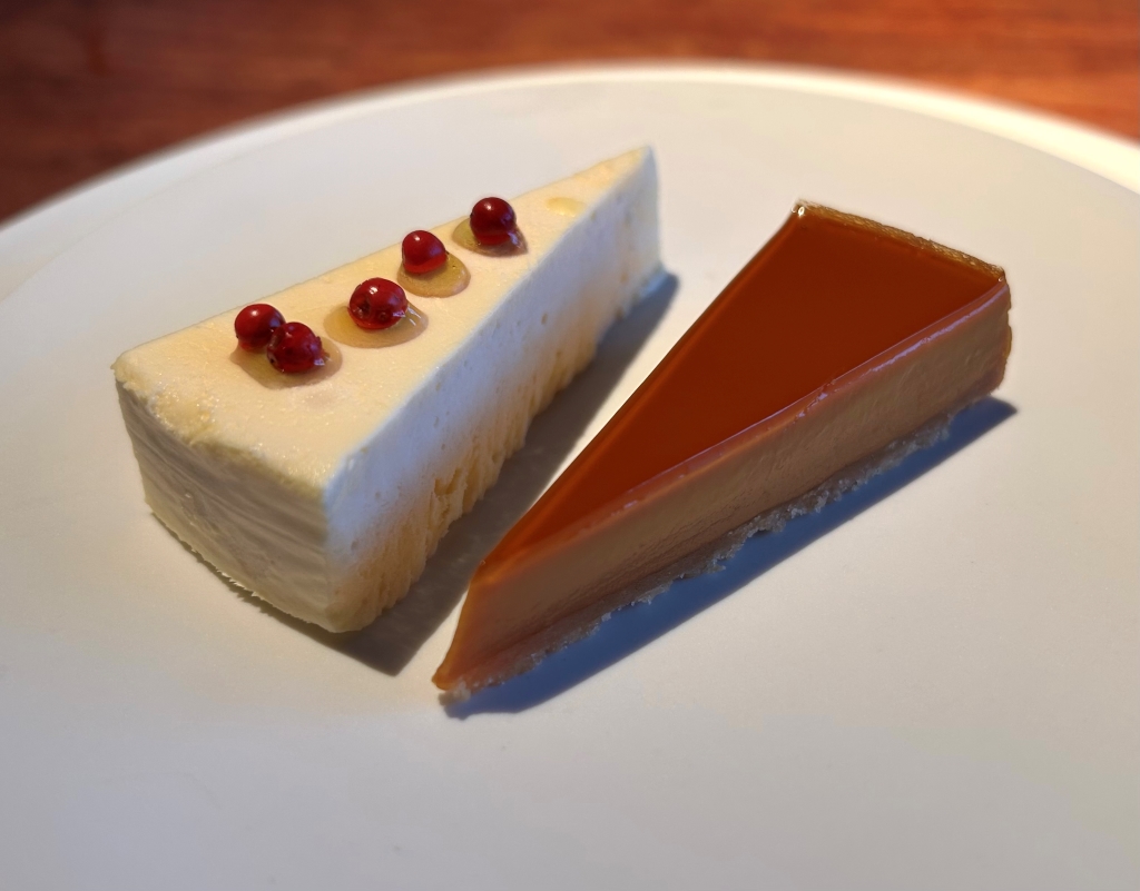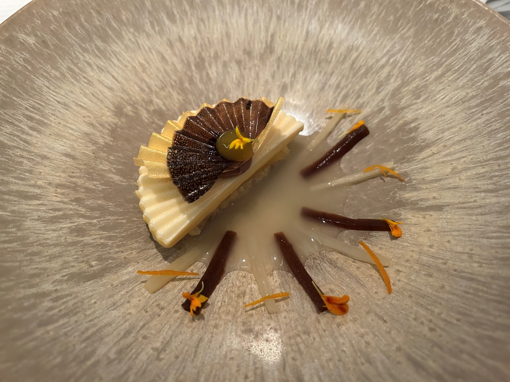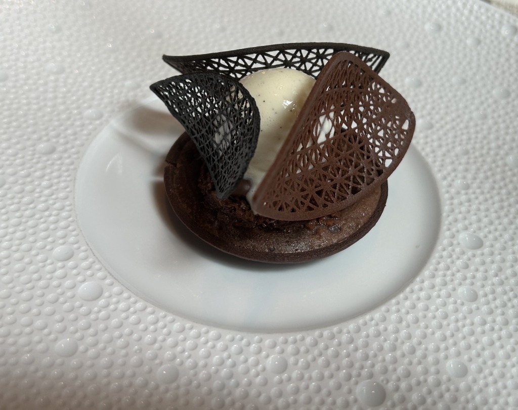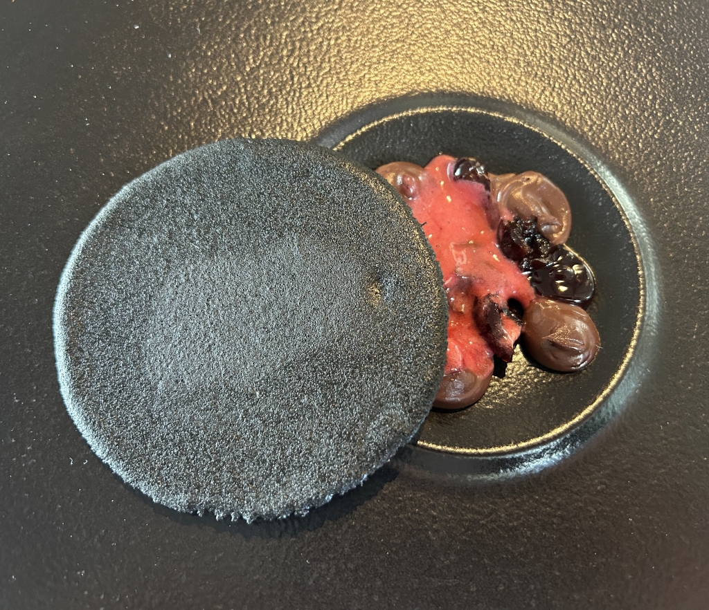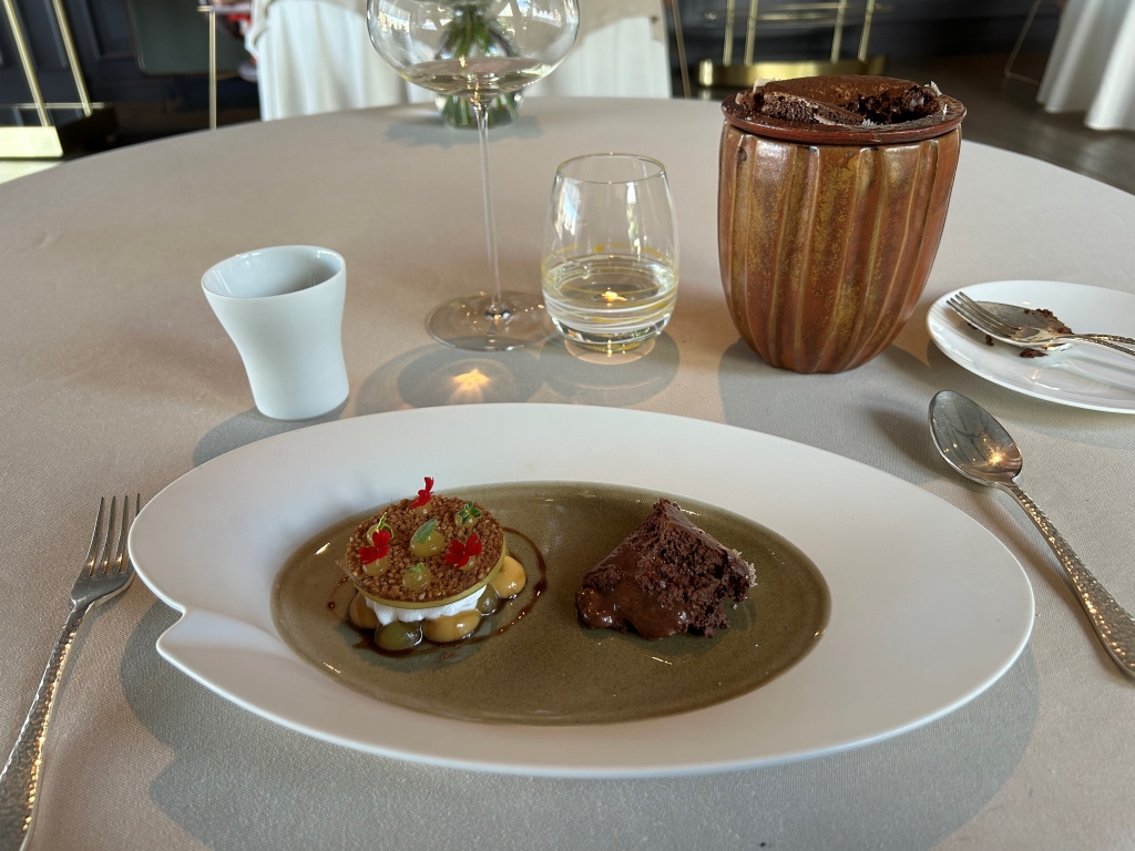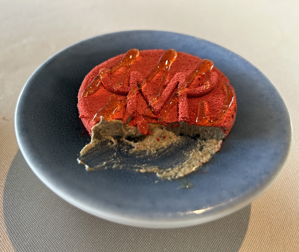 Auf dem Teller befand sich eine Karamelltarte bedeckt mit einem Gelee, das mit Soja-Sauce zubereitet wurde. Salzkaramell einmal anders. Daneben war ein Olivenöl-Parfait mit rotem Pfeffer platziert. Dabei war der Olivengeschmack nicht dominant. Ein hervorragendes Dessert!