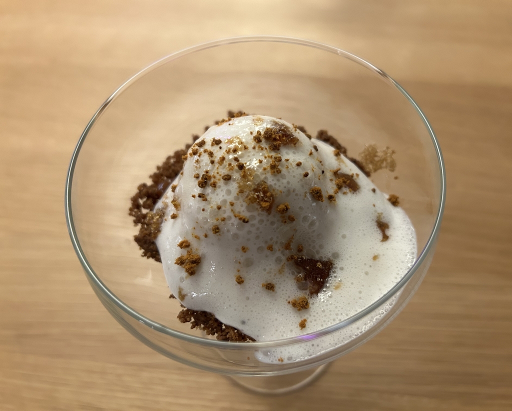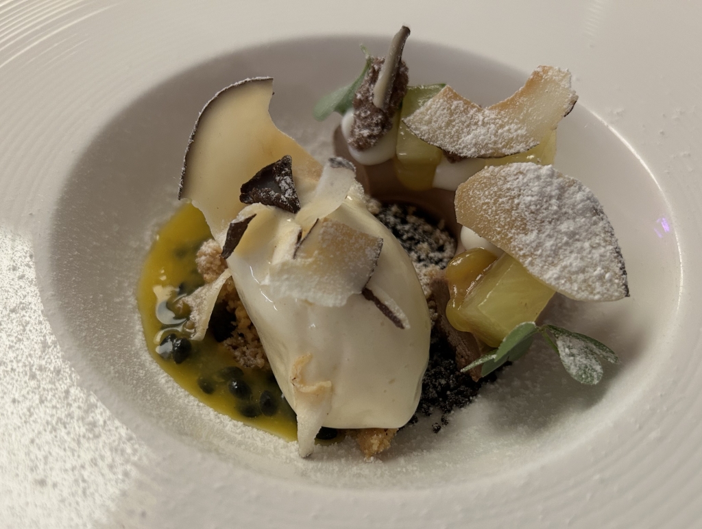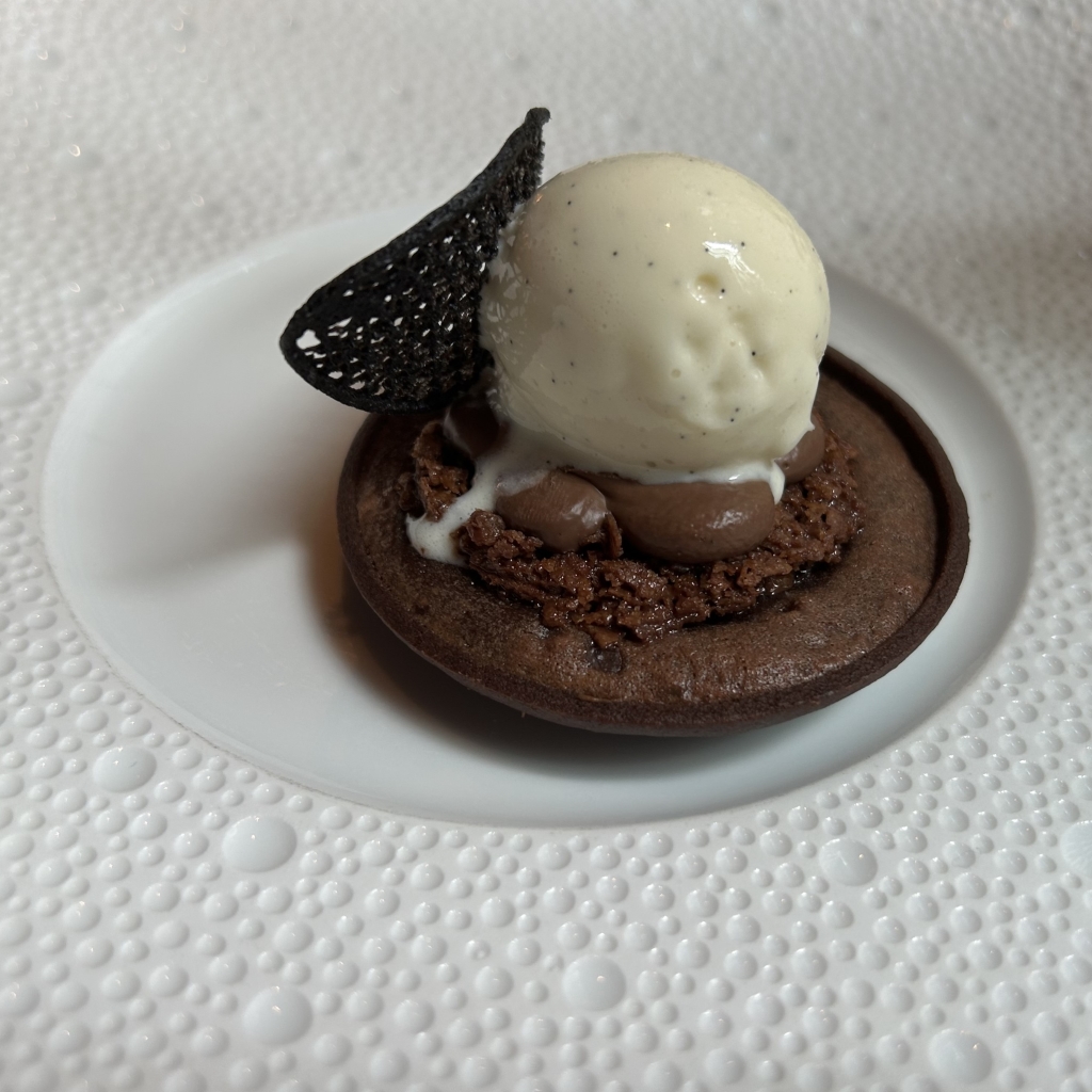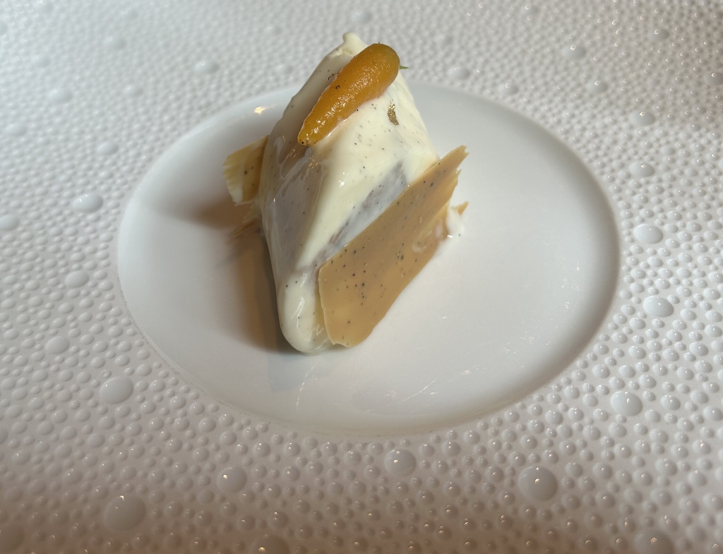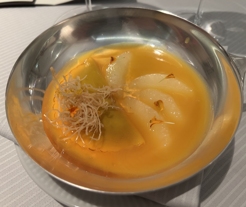 Auf dem Teller befand sich eine Karamelltarte bedeckt mit einem Gelee, das mit Soja-Sauce zubereitet wurde. Salzkaramell einmal anders. Daneben war ein Olivenöl-Parfait mit rotem Pfeffer platziert. Dabei war der Olivengeschmack nicht dominant. Ein hervorragendes Dessert!