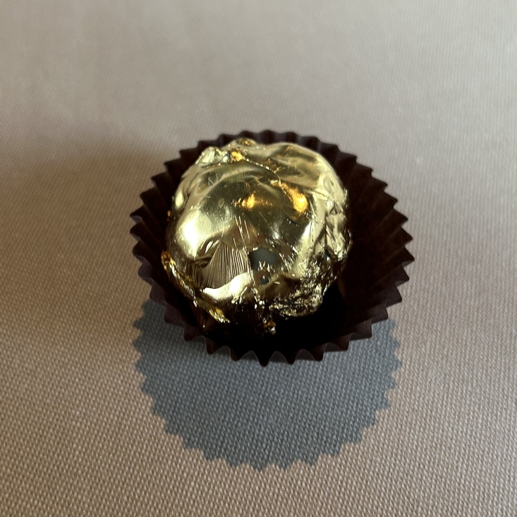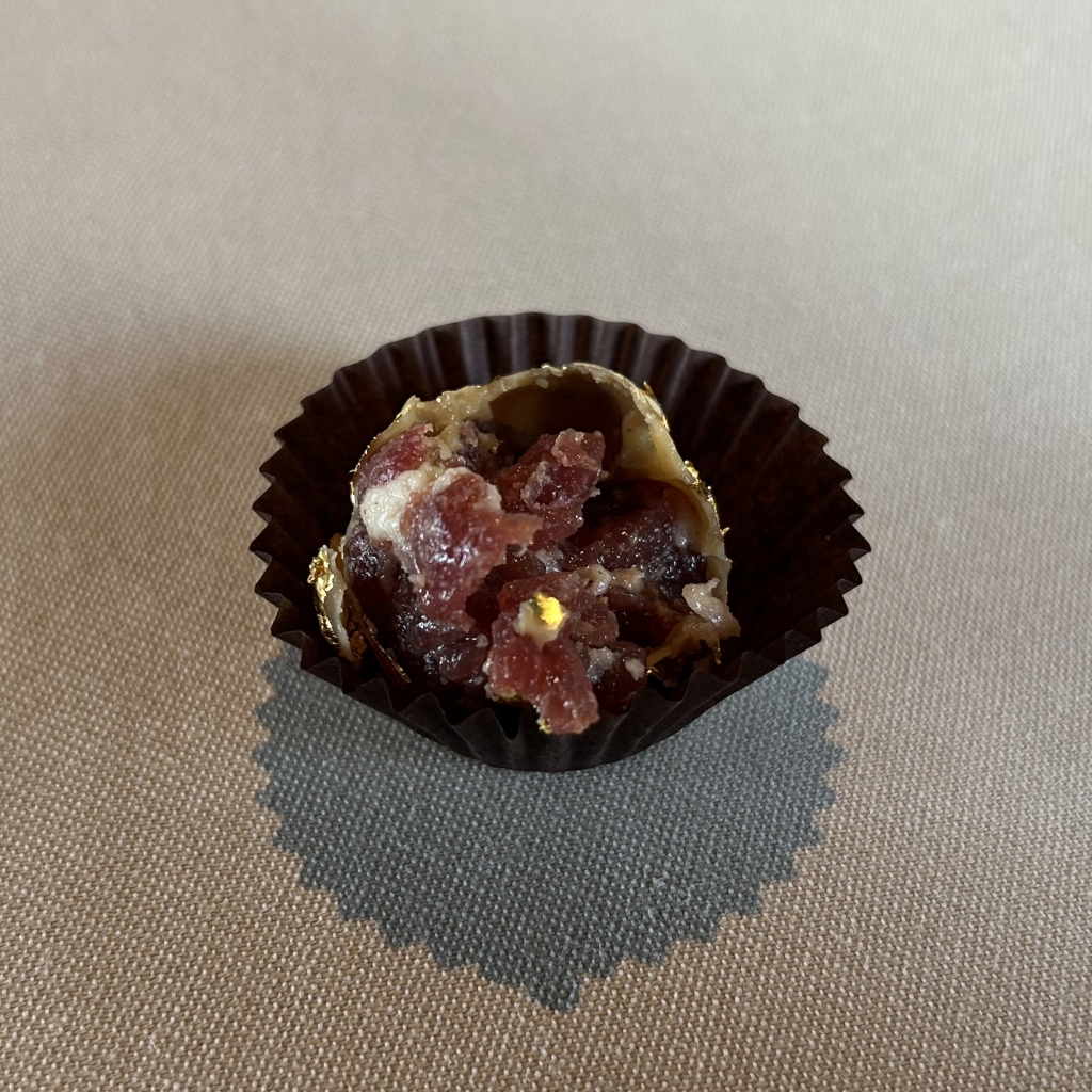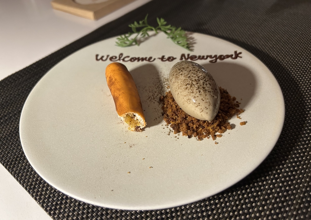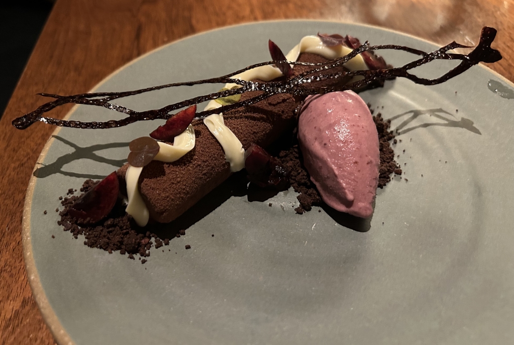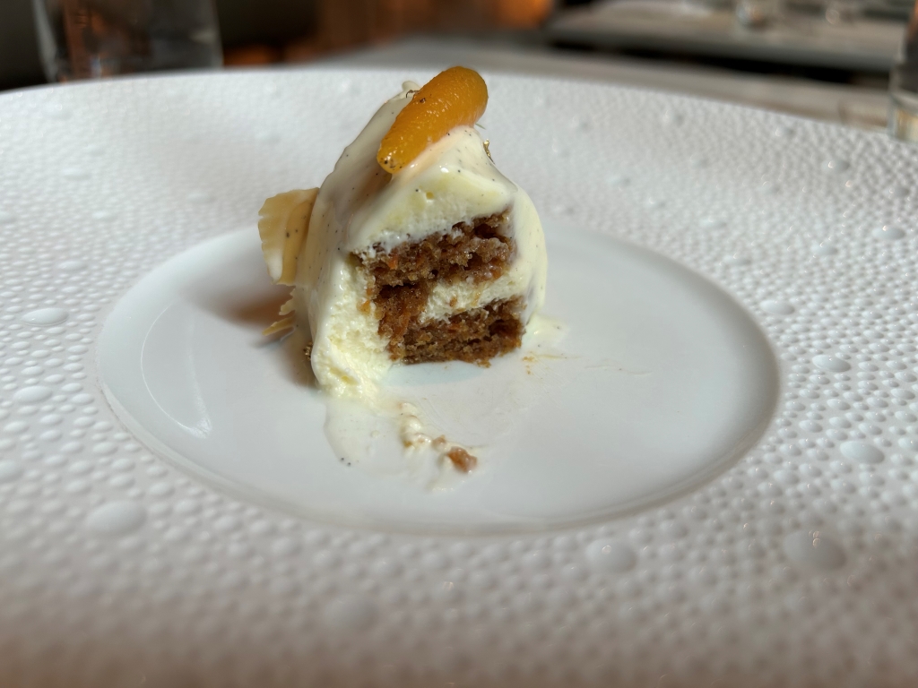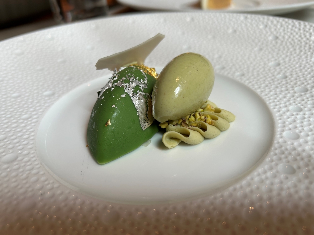 Auf dem Teller befand sich eine Karamelltarte bedeckt mit einem Gelee, das mit Soja-Sauce zubereitet wurde. Salzkaramell einmal anders. Daneben war ein Olivenöl-Parfait mit rotem Pfeffer platziert. Dabei war der Olivengeschmack nicht dominant. Ein hervorragendes Dessert!