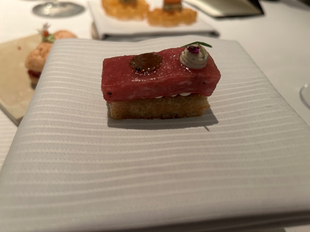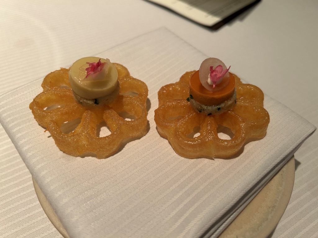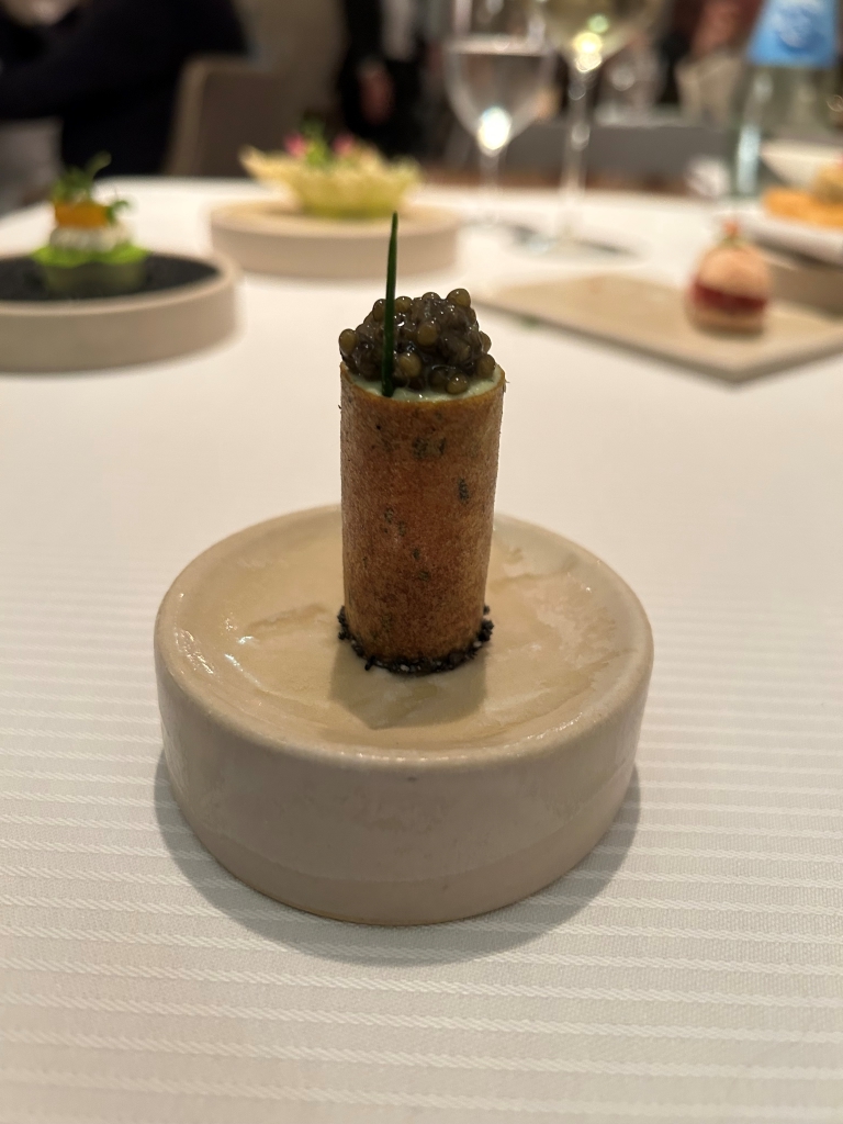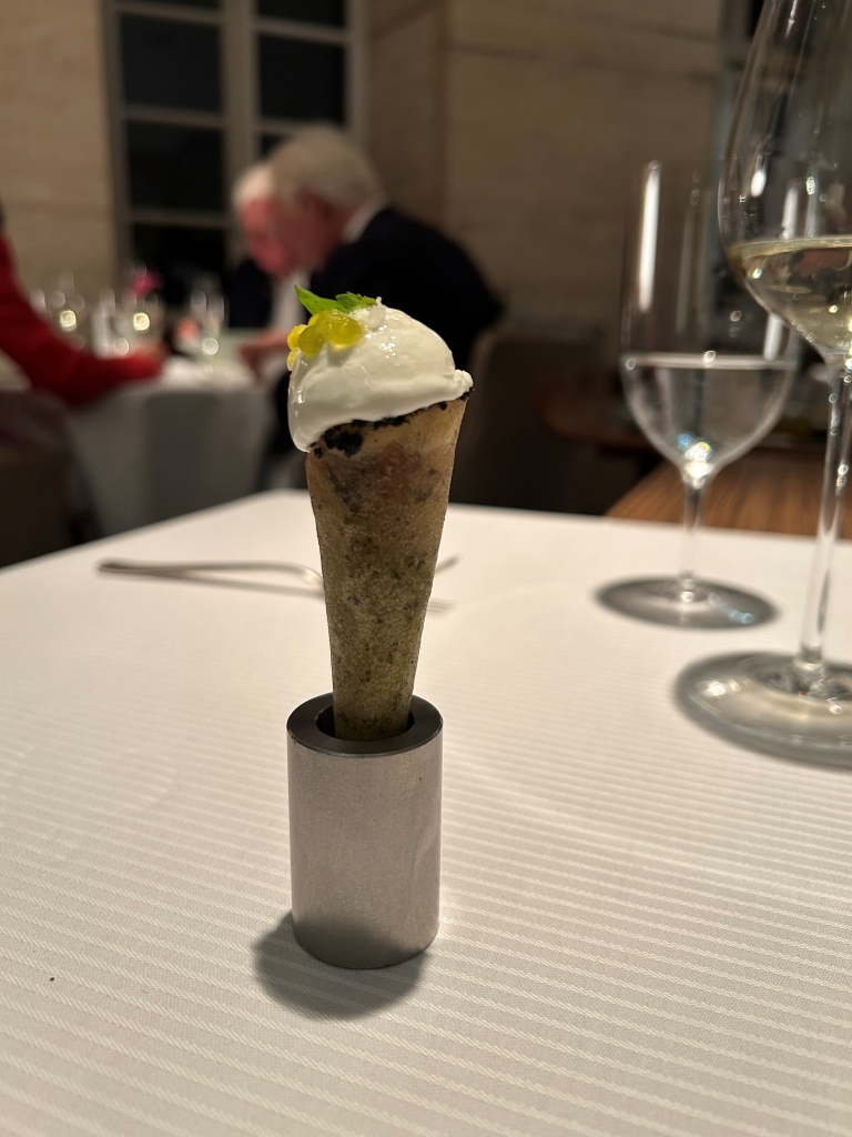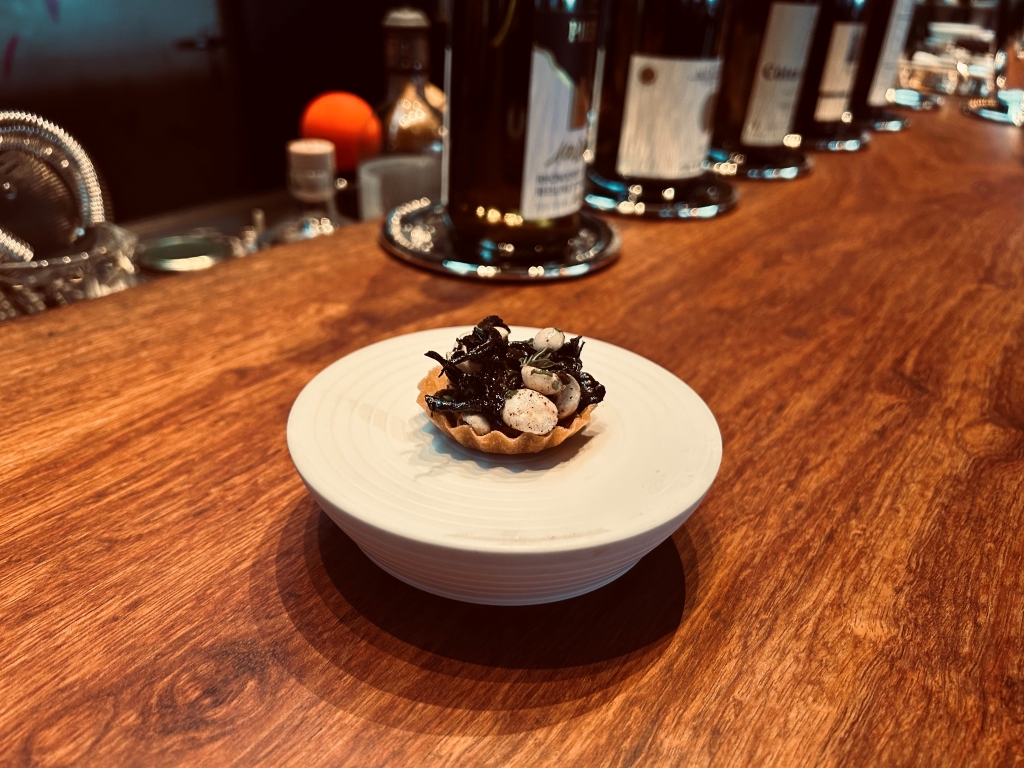An der Showbar wird ein sehr guter Pilzhappen serviert. Dieser bestand aus einem knusprigen Tartelette gefüllt mit Kohlcrème, darauf eingelegte Totentrompeten und Buchenpilze. Das ist ein sehr schöner kleiner Snack mit viel Umami.