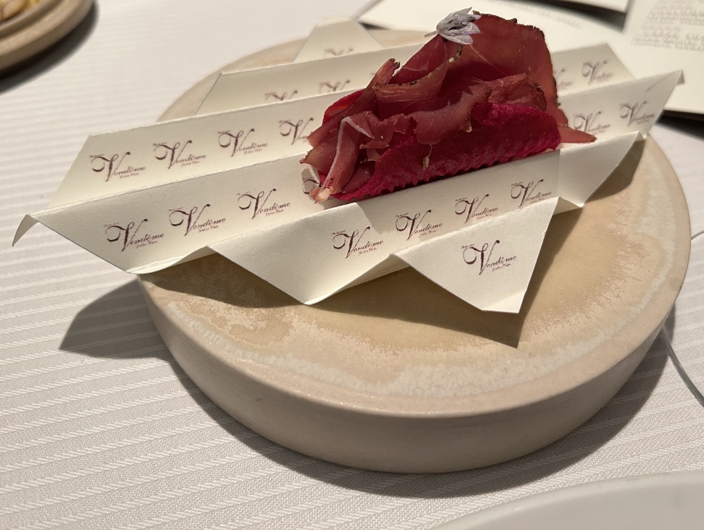Das Menü, welches hinterher ausgedruckt mitgegeben wurde, war diesmal reduzierter. Meine Notizen erlauben mir aber, den Besuch detailliert genug wiederzugeben. Die Weinbegleitung, die aufgeführt ist, enthielt dieses Mal Informationen über die Geschmacksrichtung der Weine, die ich in den Bildunterschriften wiedergegeben habe.