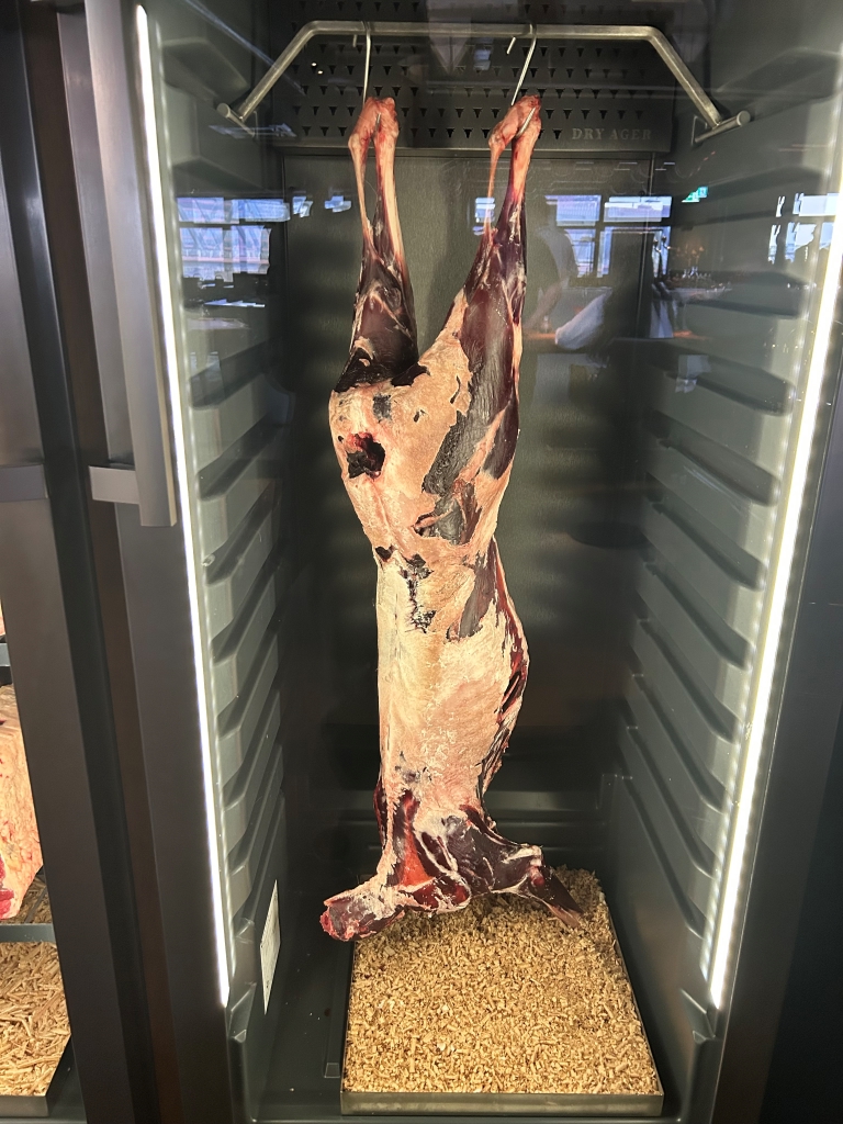 Dazu gehört im Reifeschrank das ganze aus der Decke geschlagene Stück Damwild aus der Gegend bei Kiel. Dies demonstriert auch sehr gut die Nachhaltigkeit, die hier gelebt wird. Es wird alles vom Tier verarbeitet. Das bedeutet auch, dass bei den edlen Fleischstücken nicht jeder Gast dasselbe erhalten kann. Das 100/200 ist mit einem grünen Michelin-Kleeblatt ausgezeichnet.