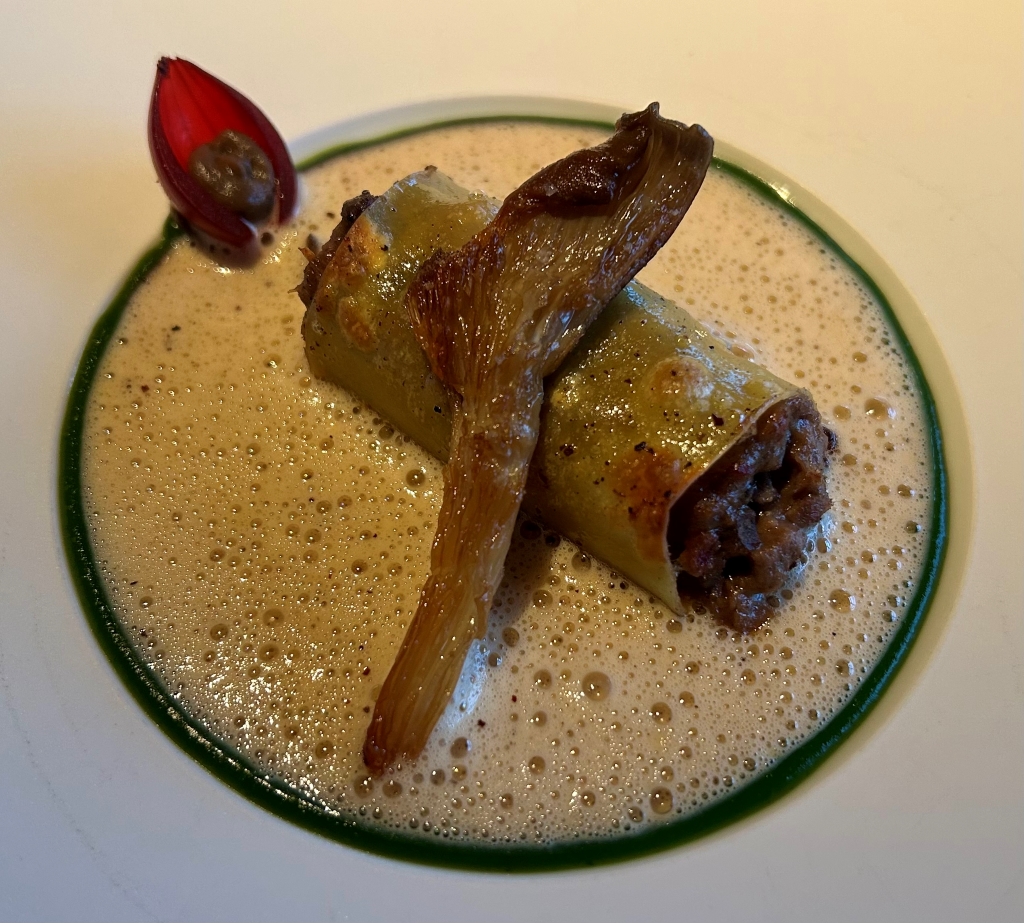 Hinter dem etwas zweideutigen Namen dieses Gangs verbarg sich ein Wildragout-Cannelloni. Innerhalb eines Petersiliencrème-Rings umgab die gefüllte Pasta-Röhre ein Spitzkohl- Schinkenfonds. Zudem befanden sich noch ein gebratener Pilz und eine marinierte Zwiebelschale mit einer Speck-Pilz-Crème auf dem Teller. Das schmeckte sehr gut.