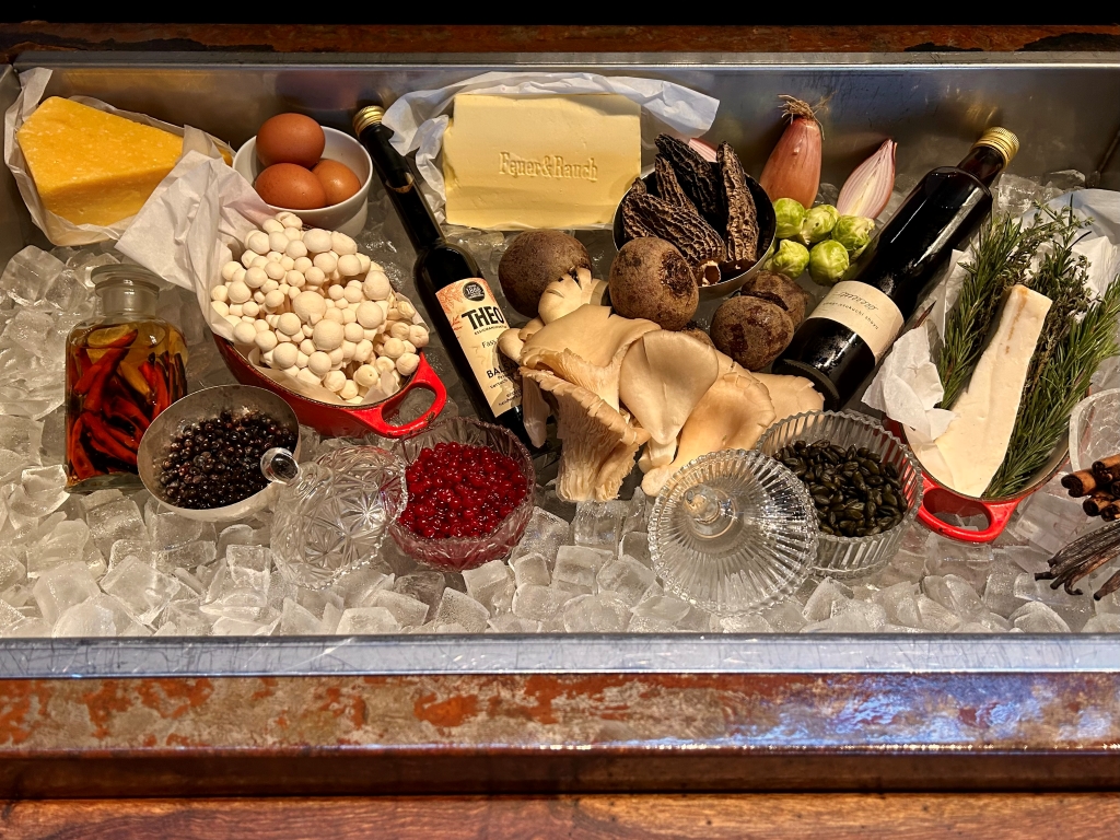 Schaubar: eingelegte Chili, geräucherter Wacholder, roter Pfeffer, geräucherte Pistazien, Lardo, Thymian, Zimt, Vanille, Sojasauce, Rote Beete, Rosenkohl, Morchel, Buchenpilze, Butter, Eier, gereifter Gouda, Balsamico.
