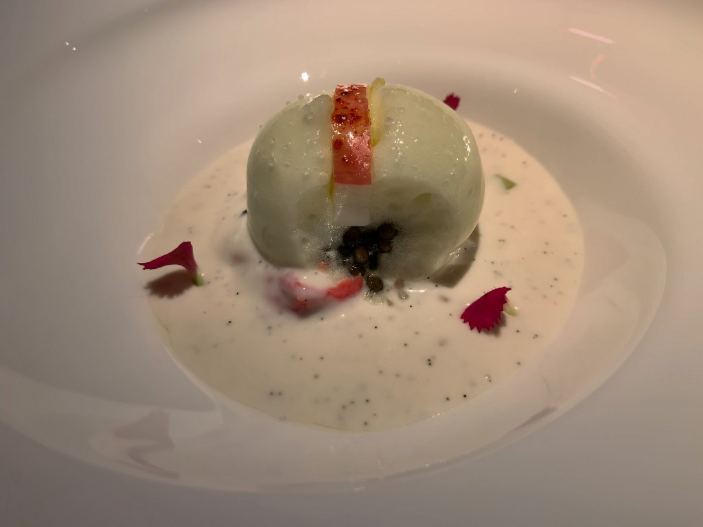 This was fantastic: The mild lemon taste of the sphere combined very well with the sweet king crab, the caviar added sea and salty taste and the celery vanilla cream rounded all up. And not to forget about the crustacean jelly at the bottom…