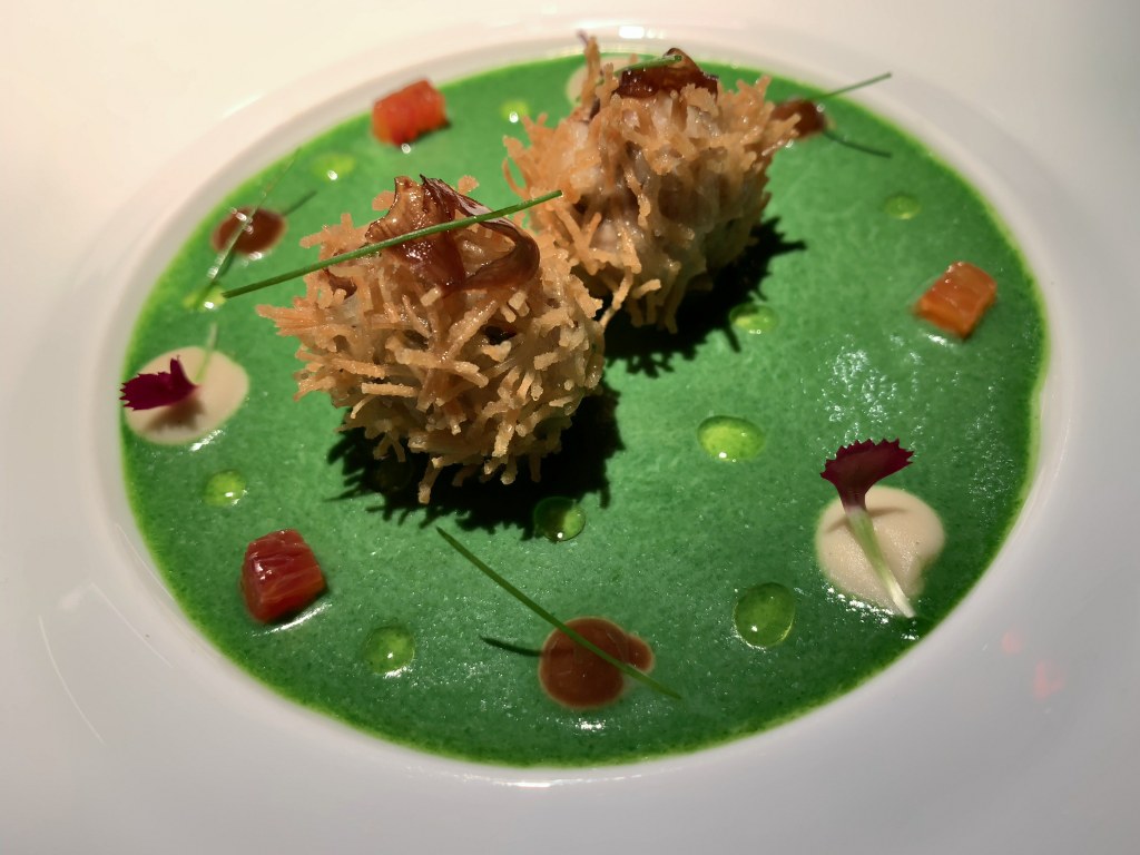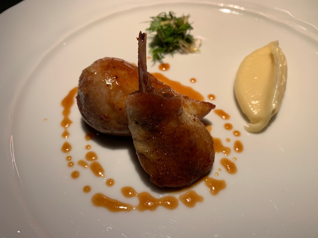 This dinner I composed again from the à la Carte menu. With it, I had a glass of white wine 2017 Sauvignon Blanc, Ch. Roquefort, Bordeaux. I ordered “Le cuisses de grenouille” and “Le quail” from the tasting portions menu.