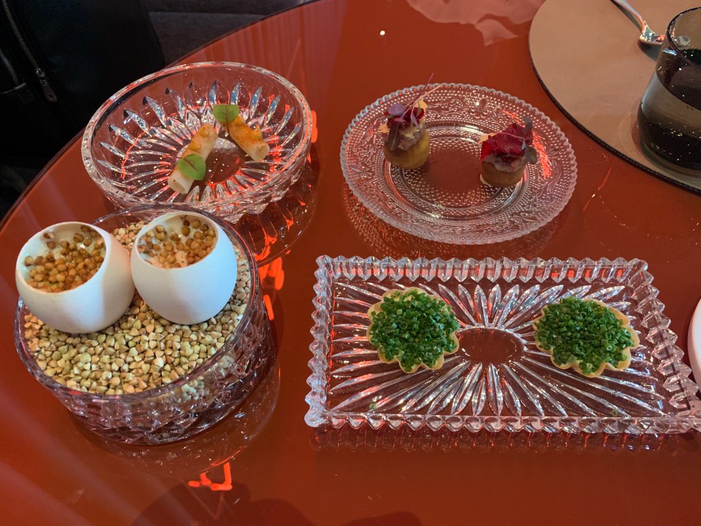 Im Trendviertel Prenzlauer Berg gelegen, ist das Restaurant relativ klein mit 8 Tischen, die an diesem Abend alle besetzt waren. Angeboten wird hier von Montag bis Freitag ein Sechsgangmenü. Im Unterschied zum auf der Website publizierten Menü, gab es Goldforelle statt Stör, Wagyu aus Nordfriesland statt welches mit der Bewertung A5 aus Kagoshima, Japan und ein anderes Dessert.