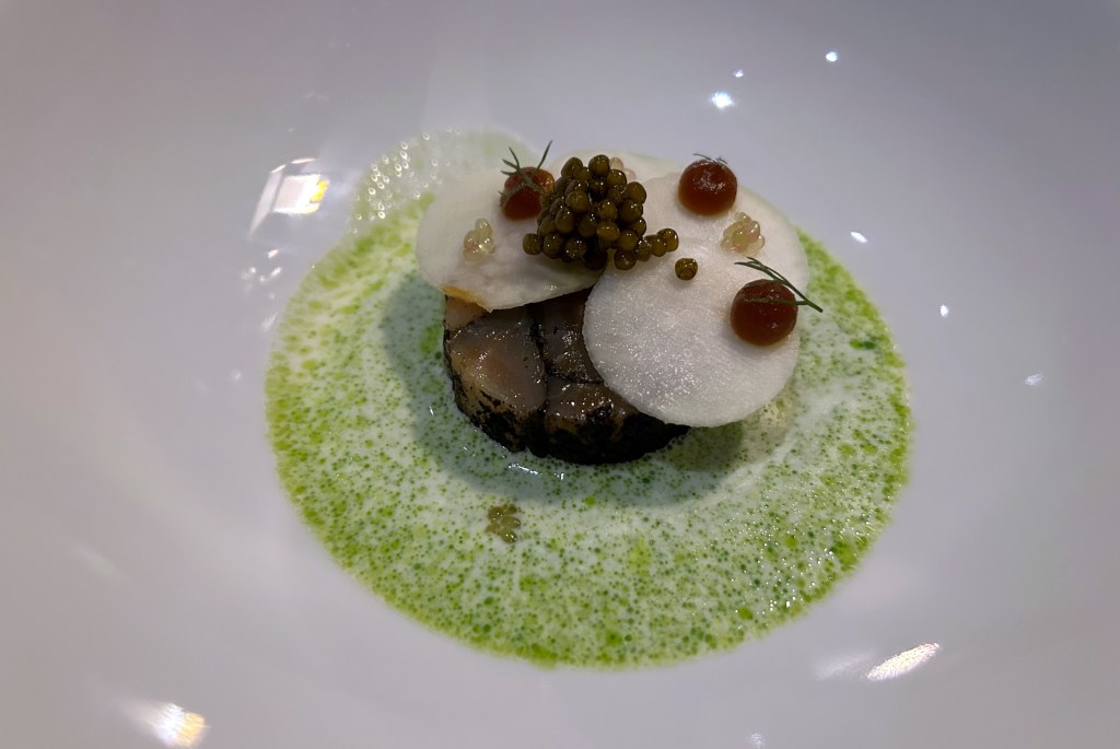 In Alba-Öl konfierter Kabeljau, pikant angemachter Spitzkohl, Mayonnaise, ausgebackene krosse Haut, Hummerbisque mit Zitronengras.