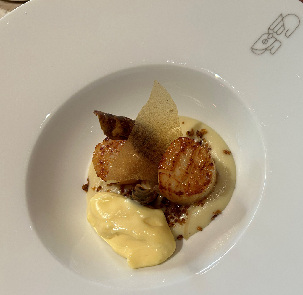 Auch wenn die Portionsgrösse des nachfolgenden Hauptgerichts für zwei Personen gedacht ist, bat ich noch um eine kleine Portion der Jakobsmuschel. Diese wurde mit einer Variation von Topinambur serviert: Pürée, Chip, Crunch und die frittierte Schale. Aus der kleinen Saucière am Tisch gab es noch eine Champagner-Hollandaise. Die zwei Nüsse von der Jakobsmuschel waren von perfekter Qualität und Garung. Es gibt nichts, was ich an diesem Gericht auszusetzen hätte, im Gegenteil…