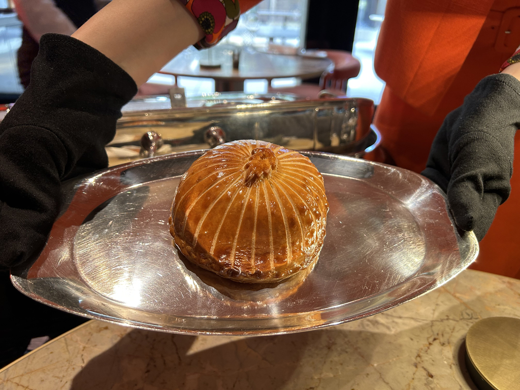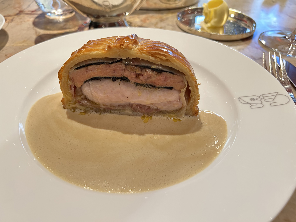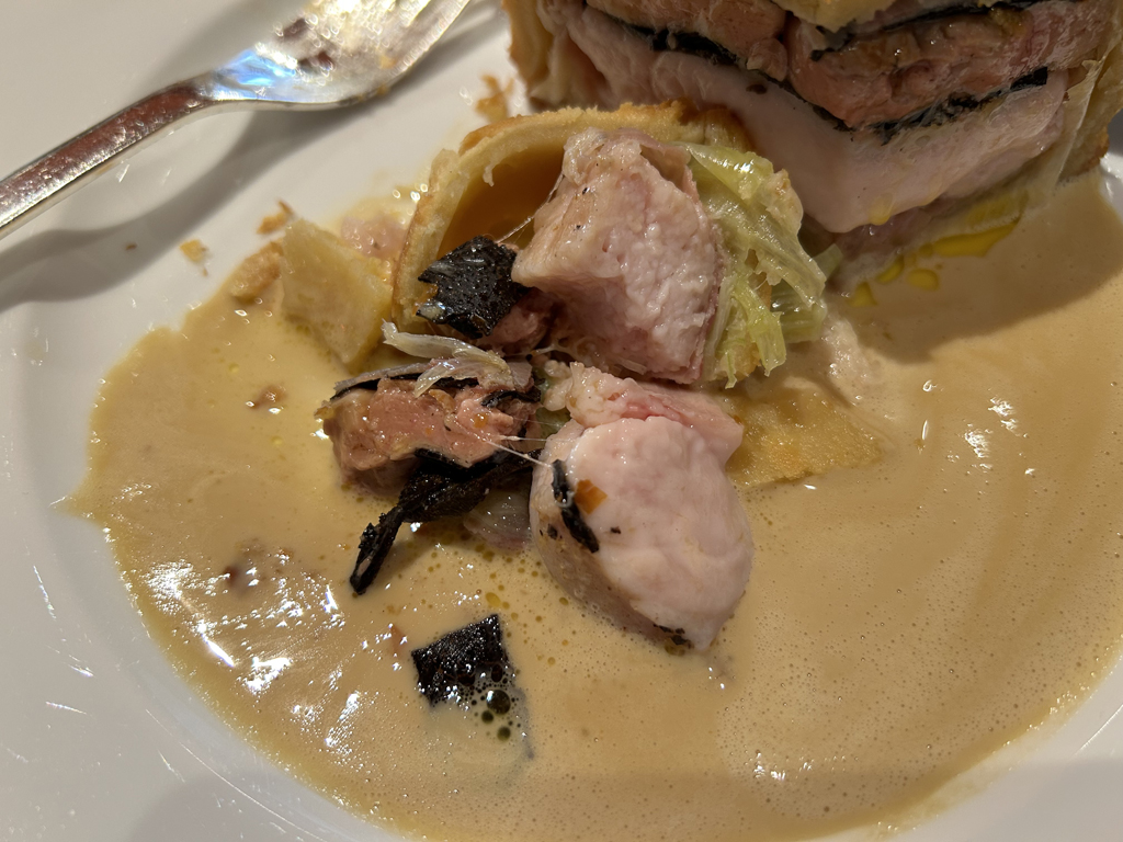 Da war es also. Im Einzelnen handelt es sich um eine Pastete mit Spitzkohl?-Boden gefüllt mit Kalbsbries unten und Entenleber oben, umwickelt mit hauchdünnem Schinken, einer dünnen Schicht schwarze Wintertrüffel unter und über der Entenleber. Dazu wird eine grandiose Albuféra-Sauce serviert, eine Geflügelrahmsauce normalerweise auf Basis von Geflügelbrühe, Crème Fraîche, Butter und Paprika et Voilà. Im Unterschied zum Originalrezept wird kein Strudelteig mehr verwendet, sondern ein französischer Pastetenteig.