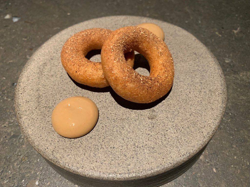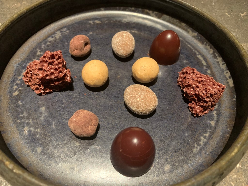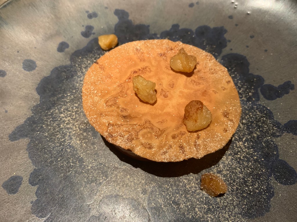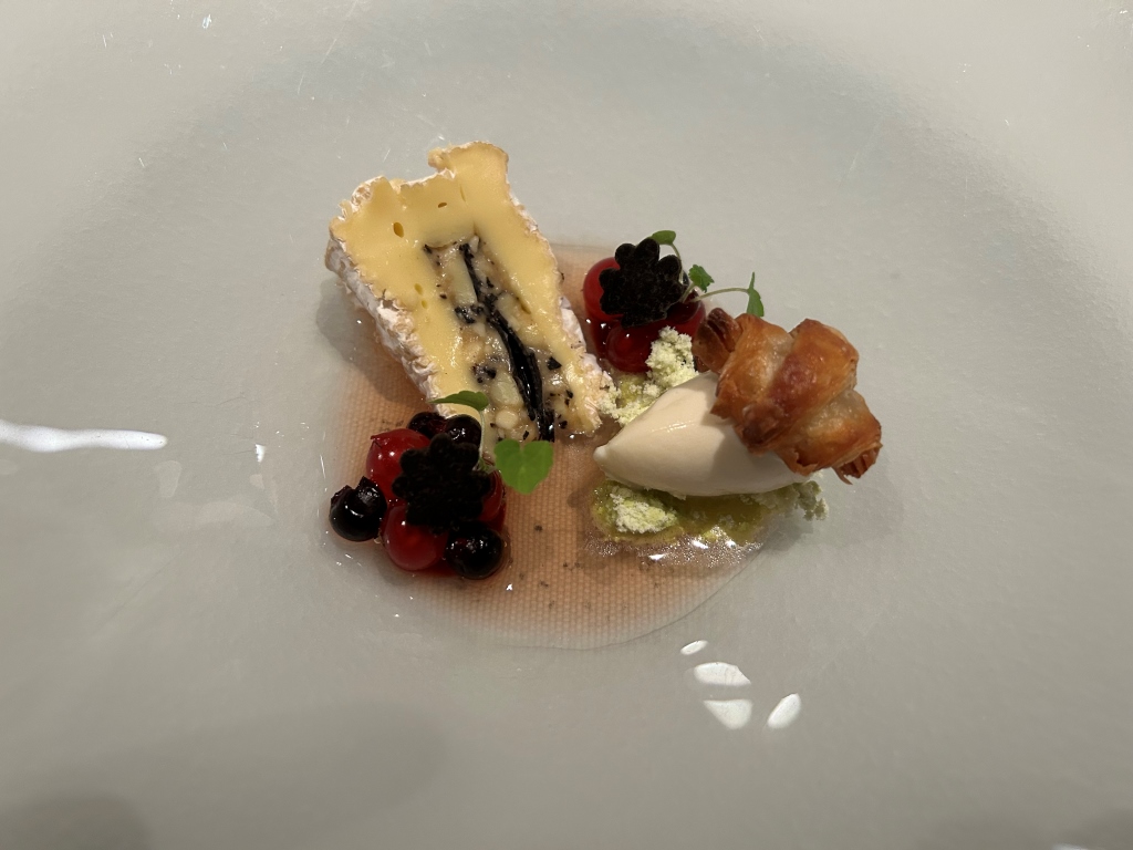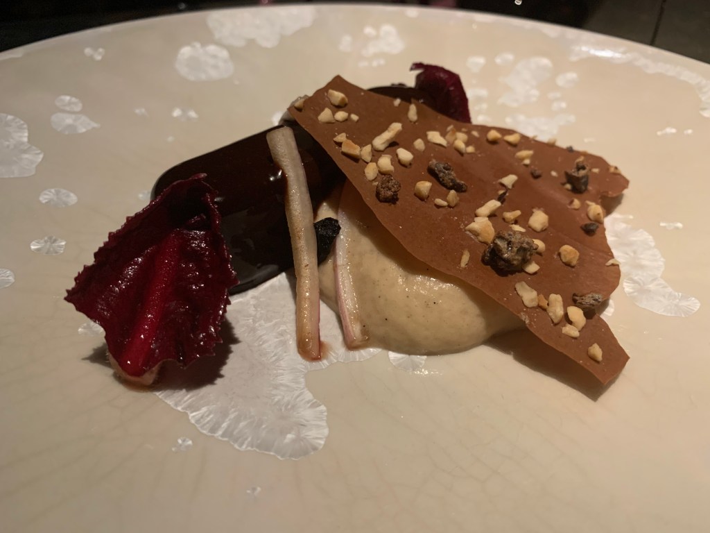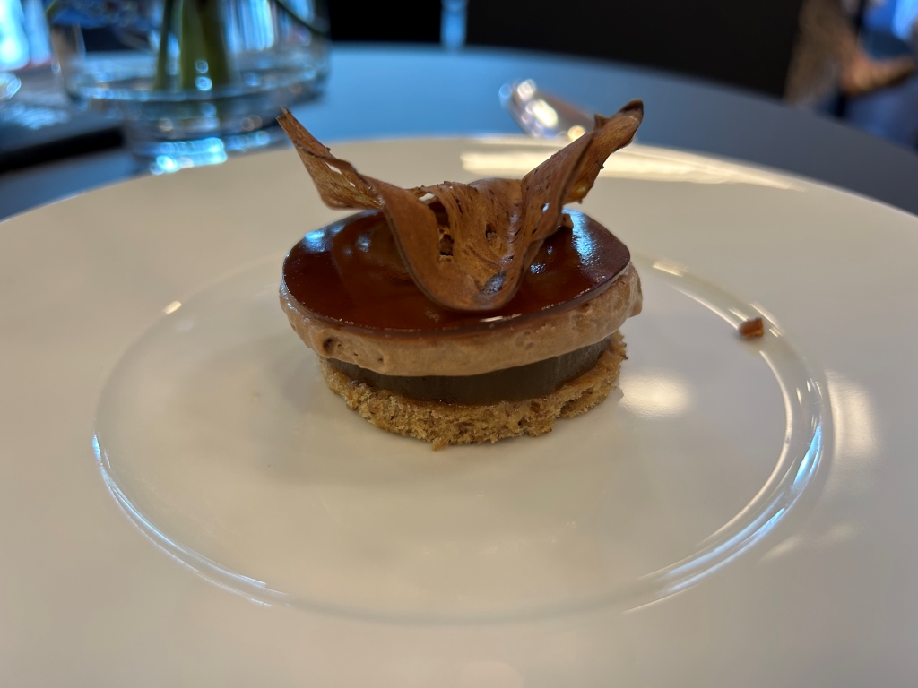 The dessert consisted of a dulce de leche ice cream on a disk of parfait made with the French cheese Fourme d’Ambert. Besides was a sablé filled with different preparations of pear such as candied, as gel, natural, crème and some Fourme d’Ambert chips. This was a nice not too sweet dessert. Pear and cheese are anyway often a winner combination.