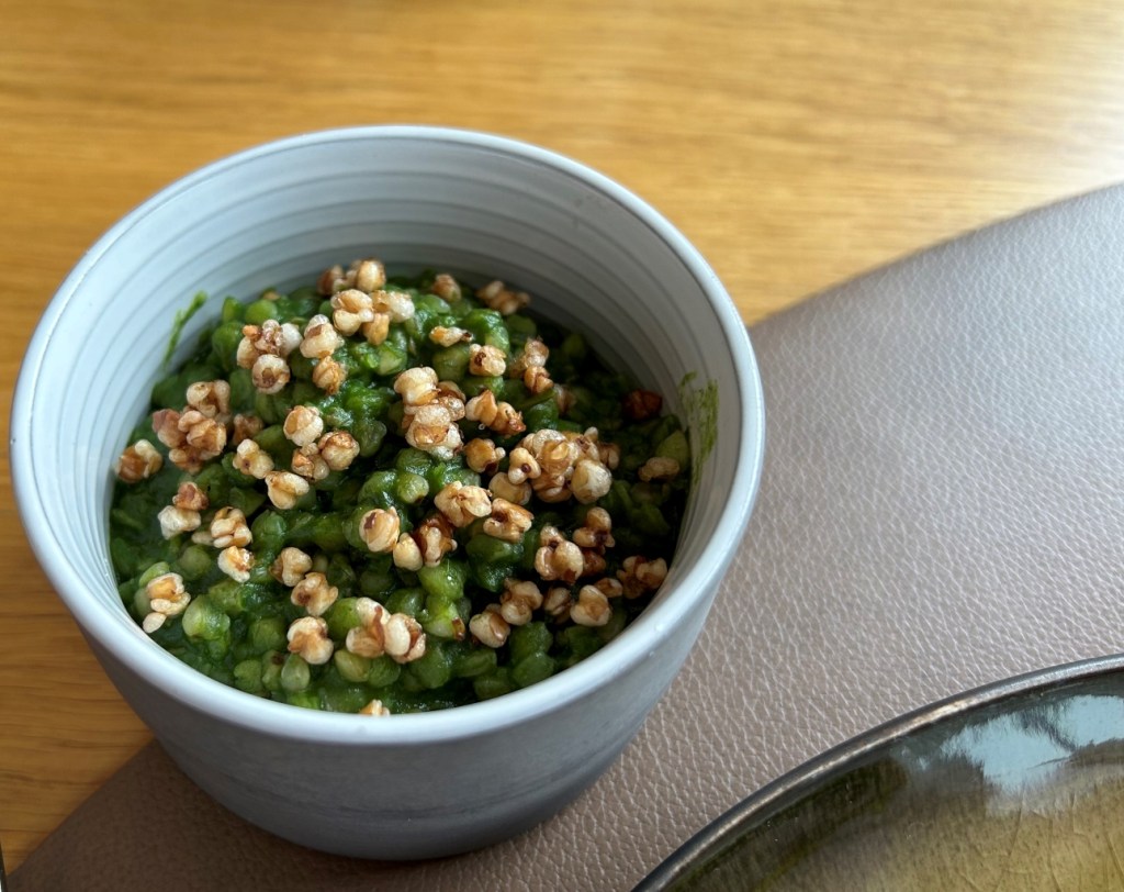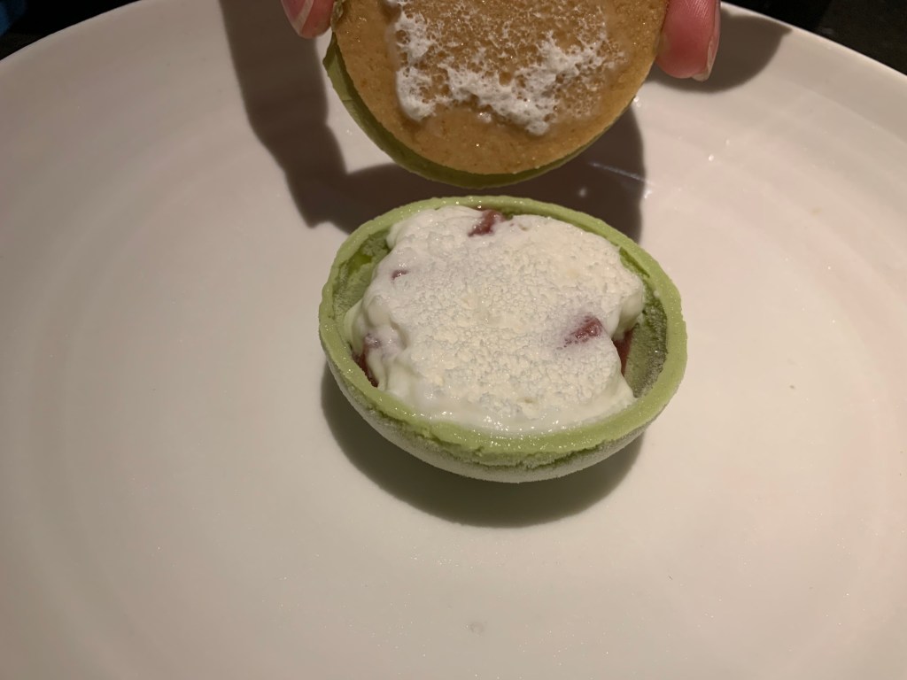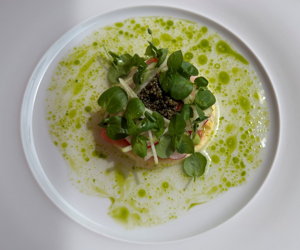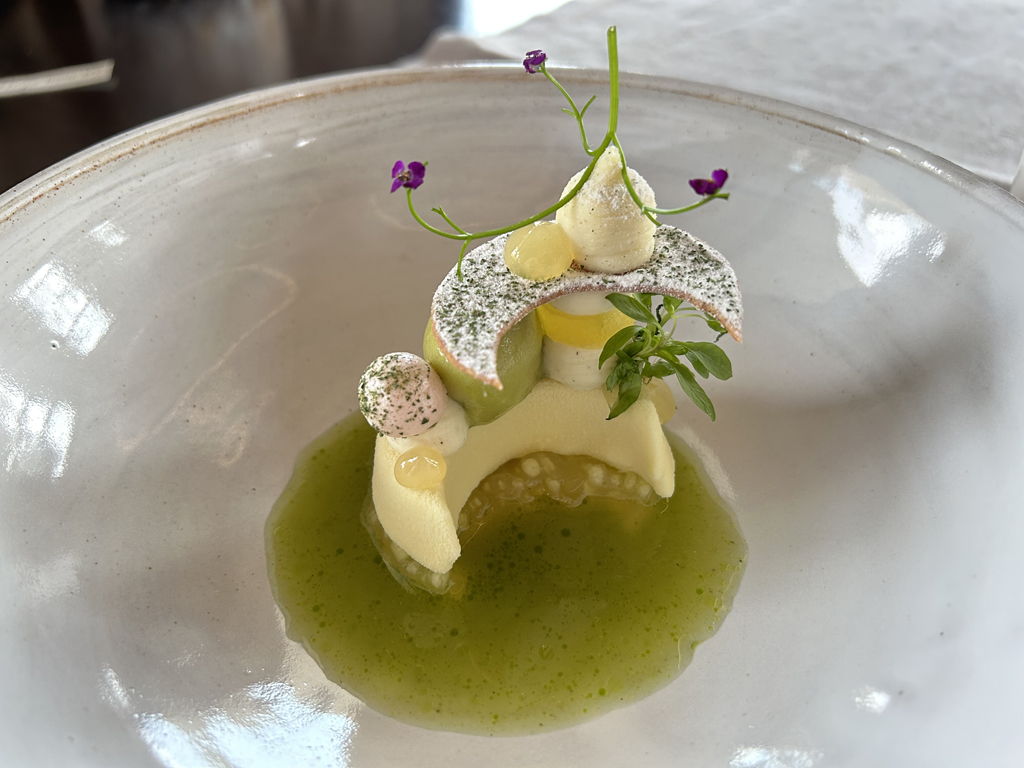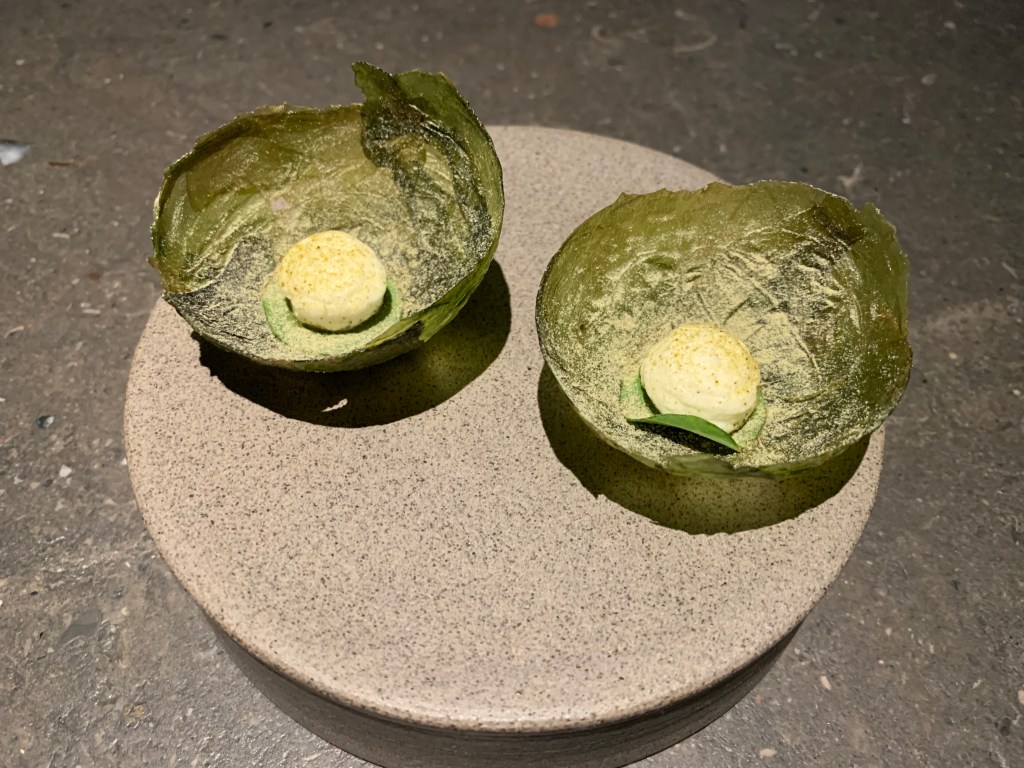 – a green algae wall cylinder filled with broccoli, pistachio and passionfruit crème,