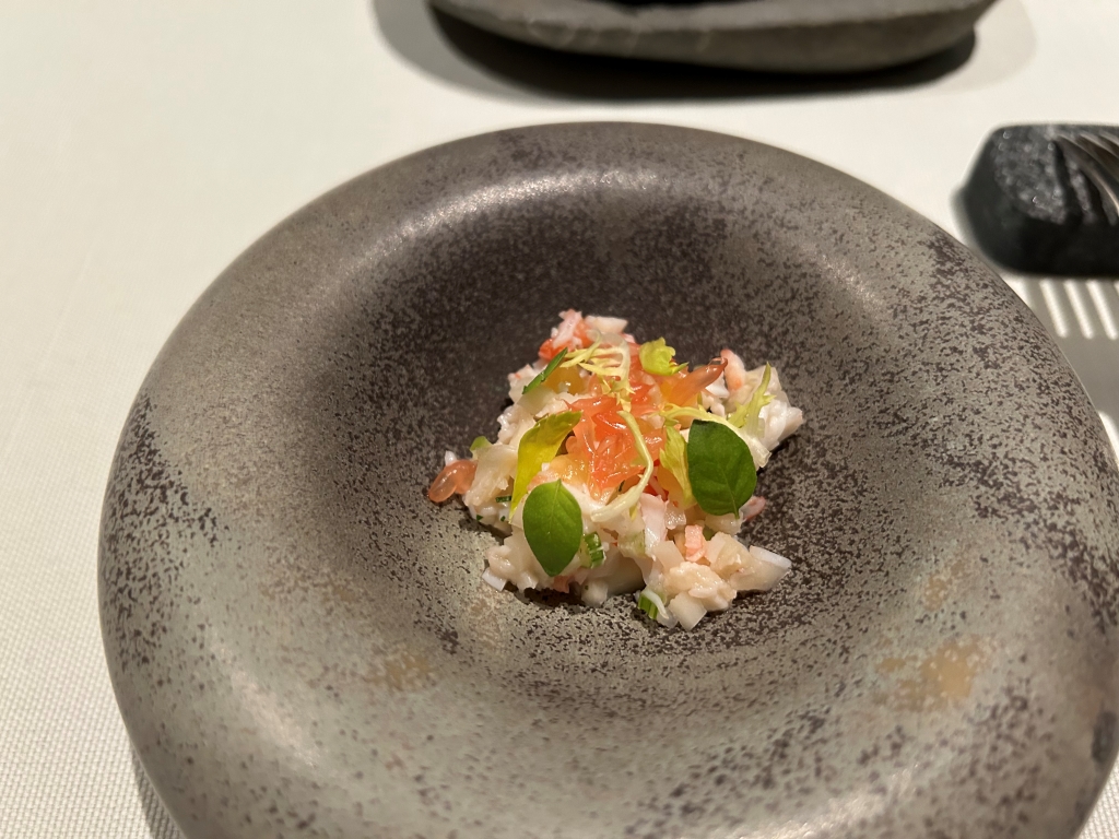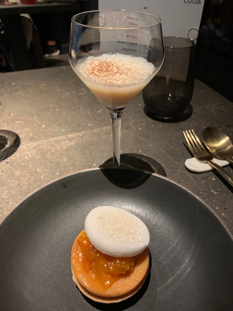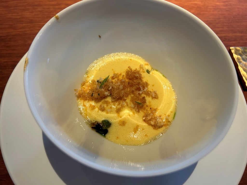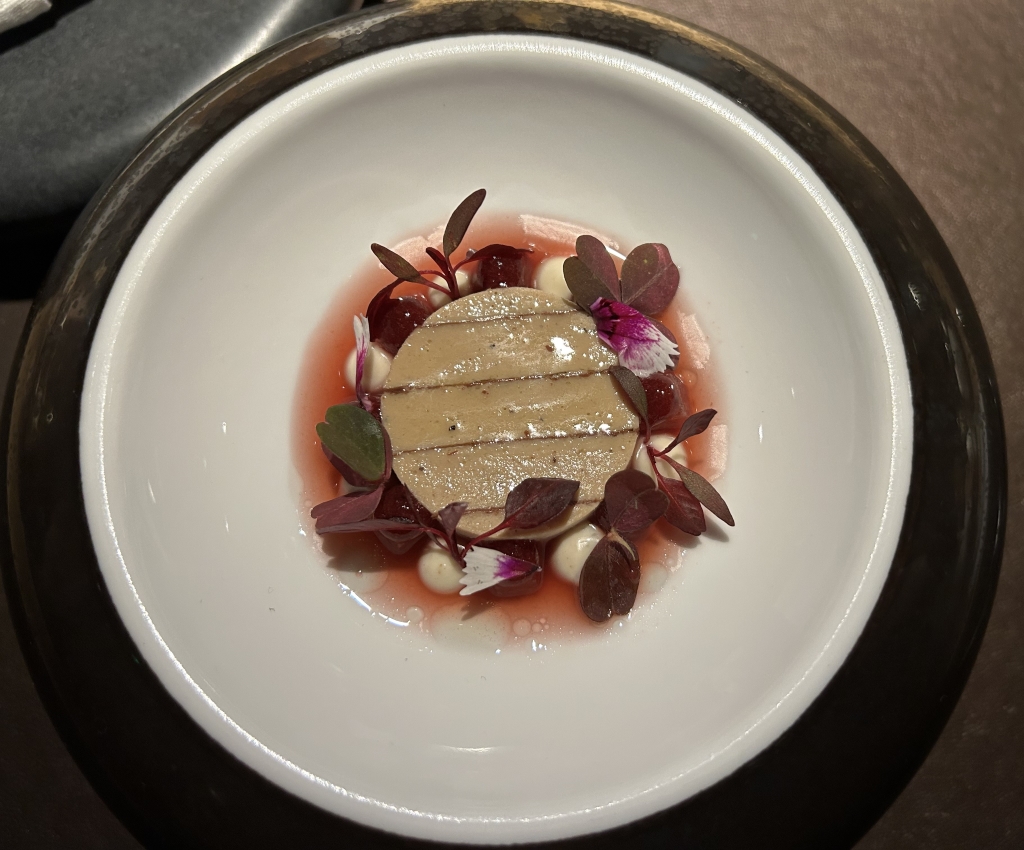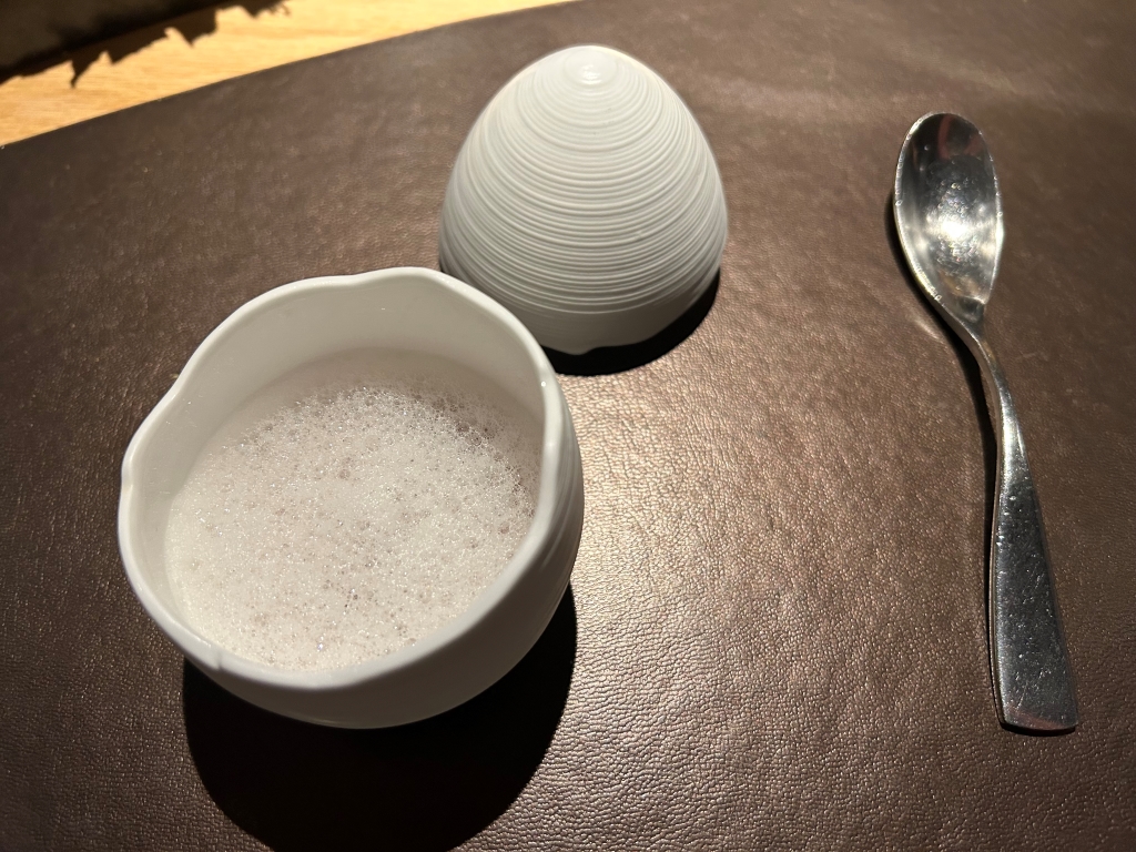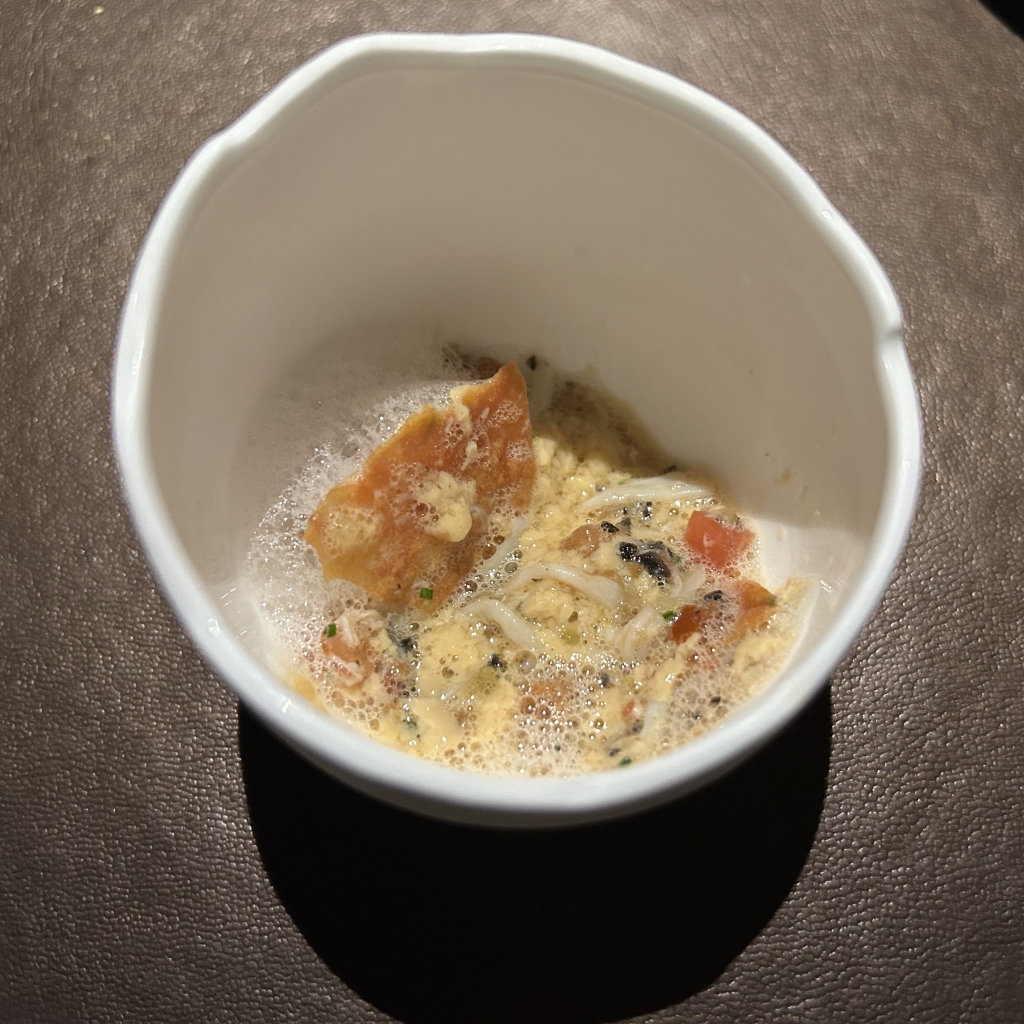 A Foie Gras preparation, crabmeat, a tomato chip on the bottom of the bowl were overlaid with a white tomato foam. Nice delicious little preparation with tastes between umami by tomato and Foie and sweetness of the crab.