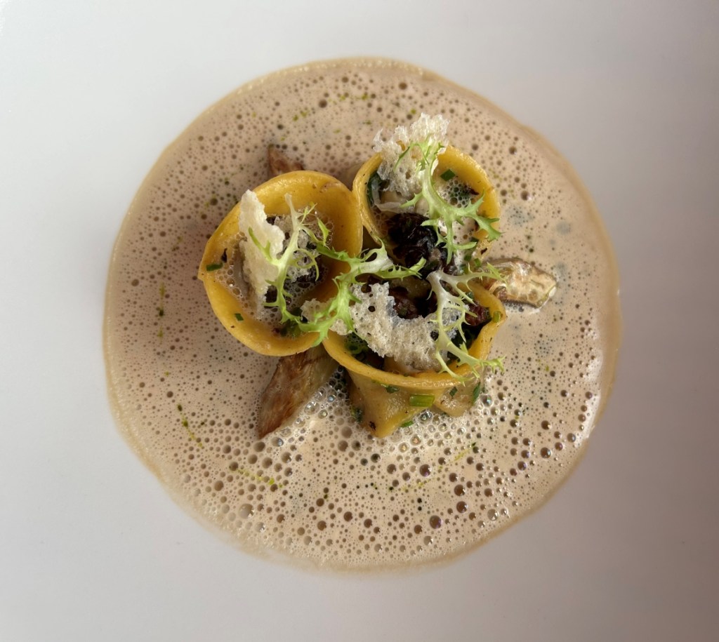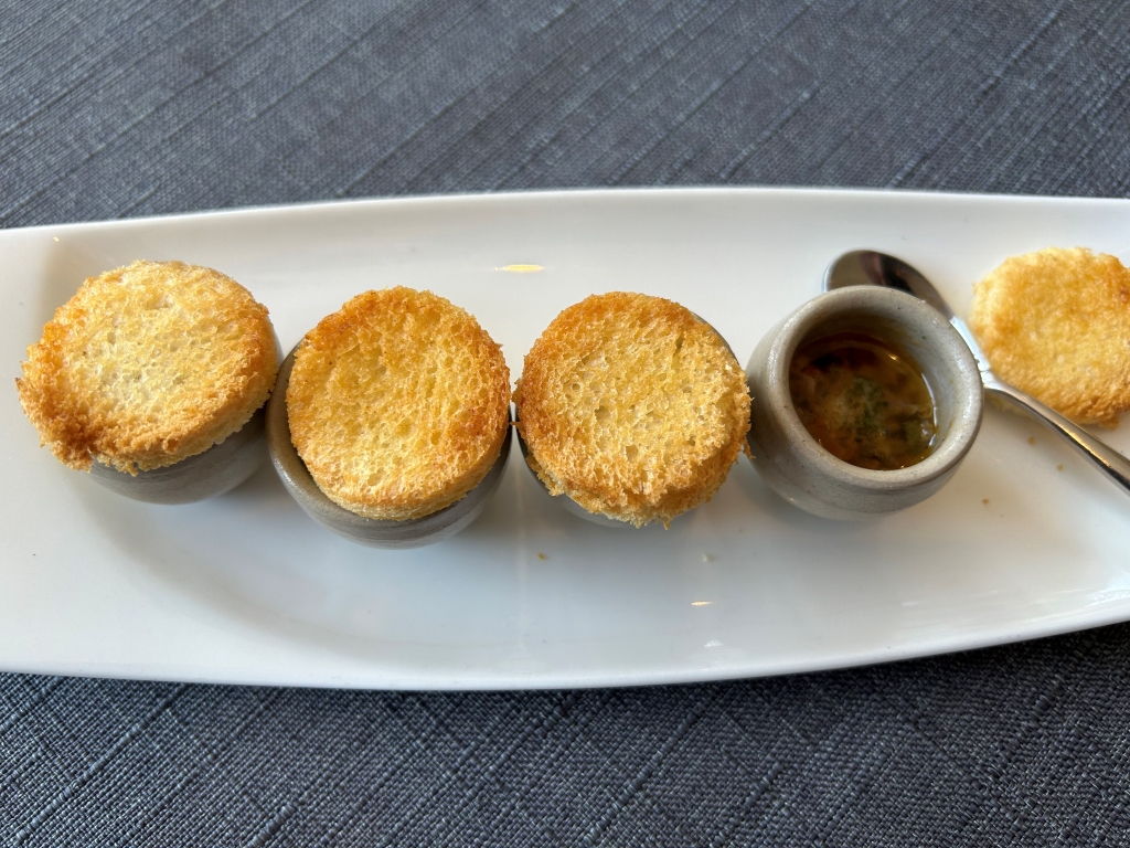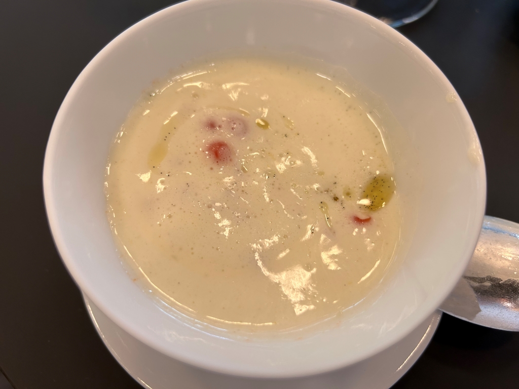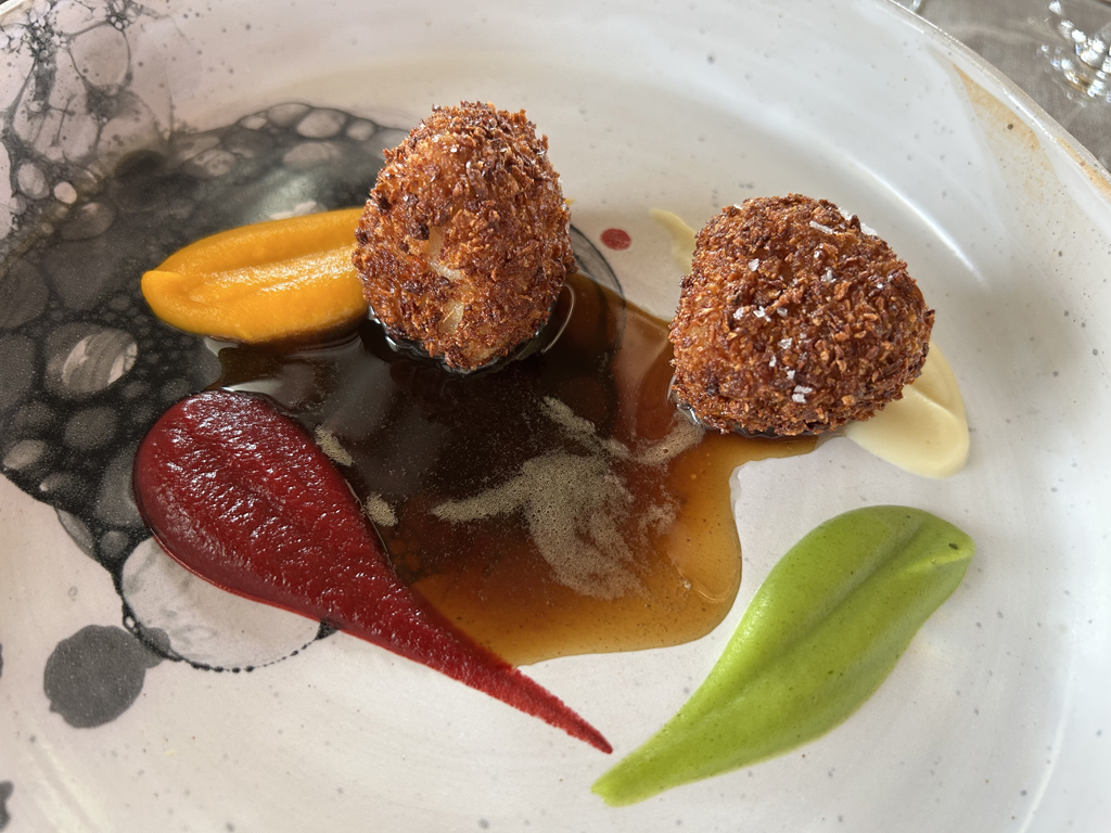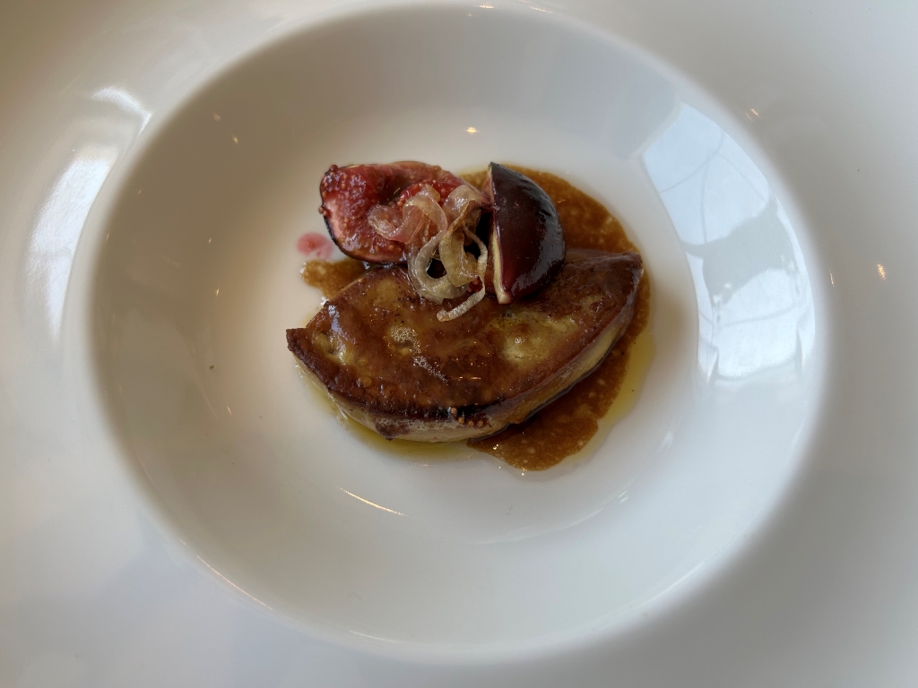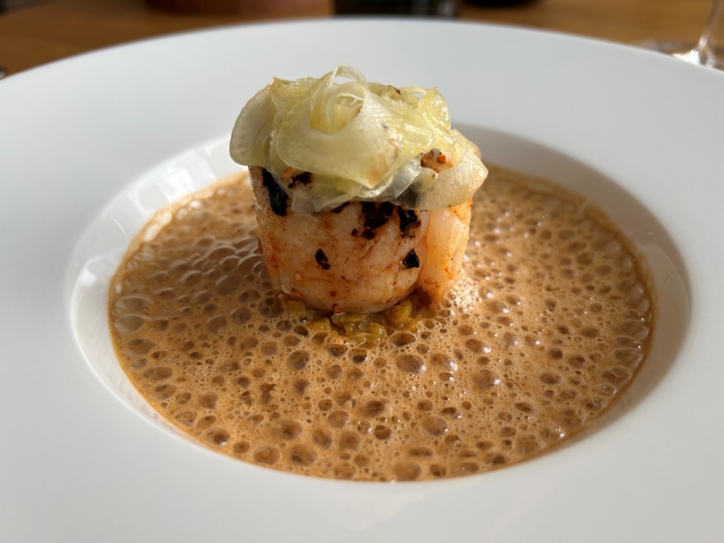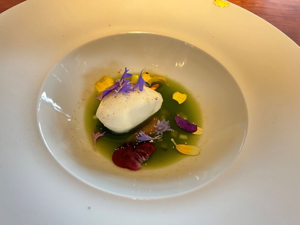 A Foie Gras preparation, crabmeat, a tomato chip on the bottom of the bowl were overlaid with a white tomato foam. Nice delicious little preparation with tastes between umami by tomato and Foie and sweetness of the crab.
