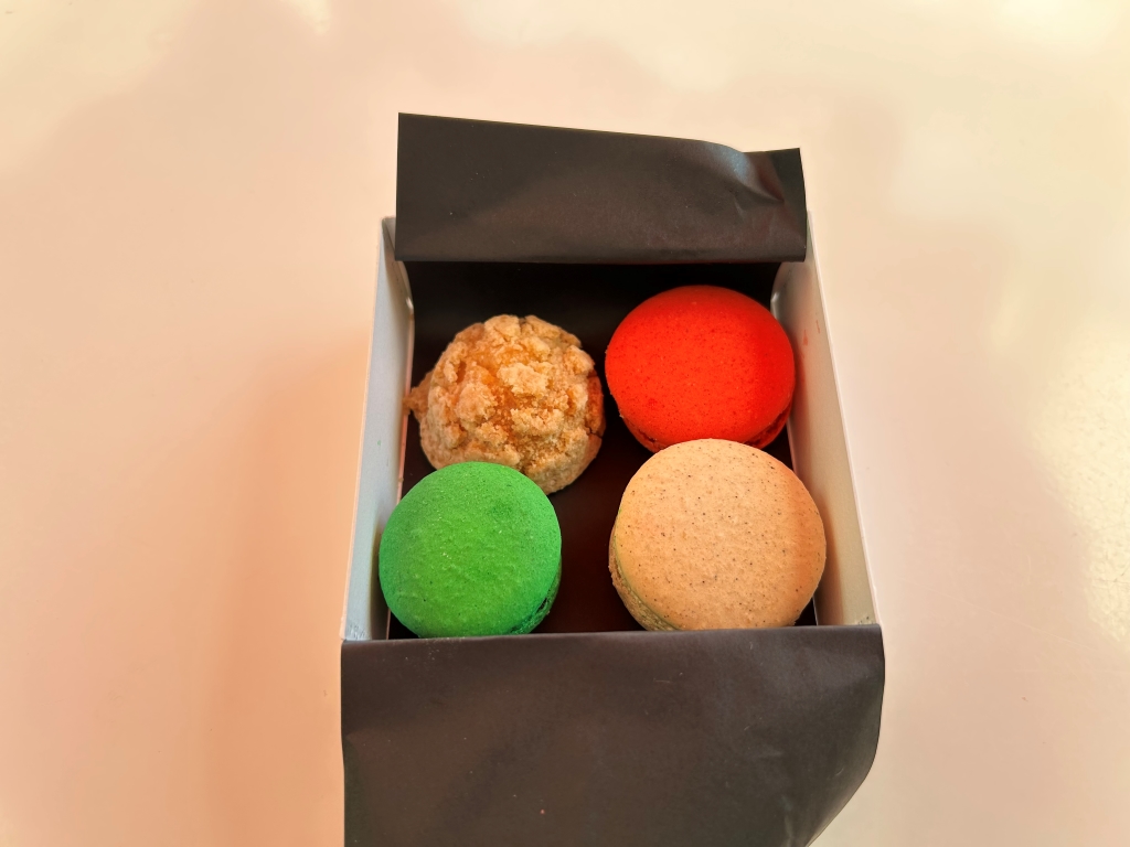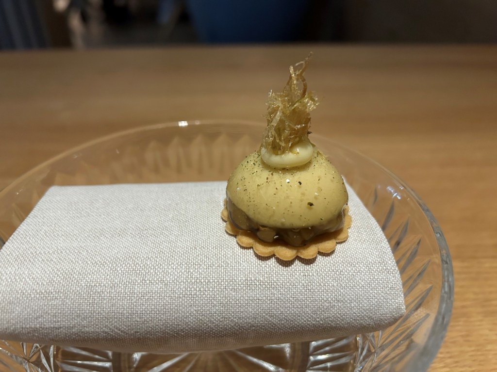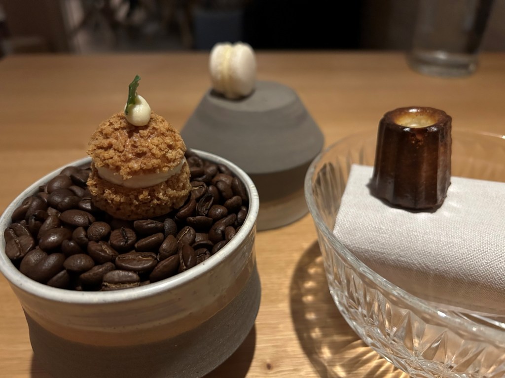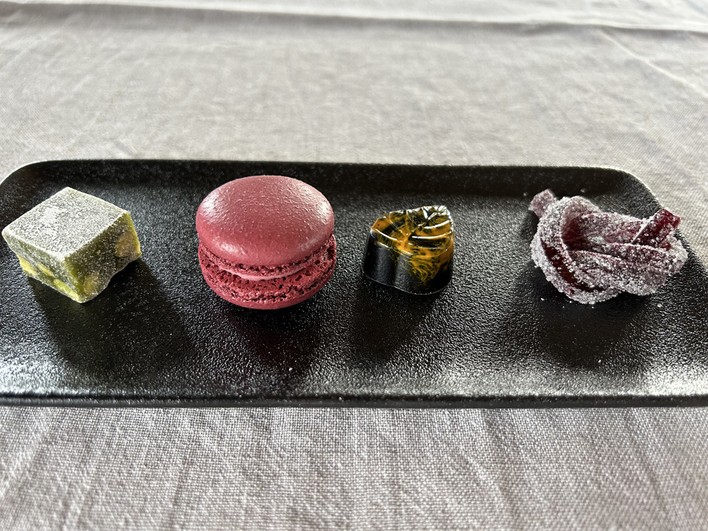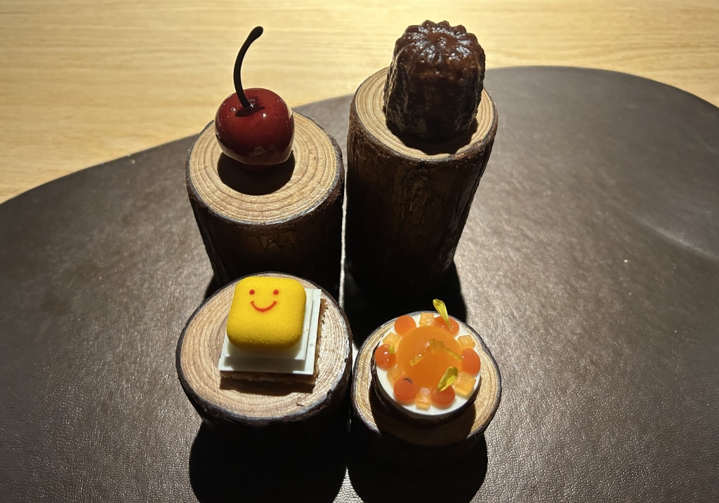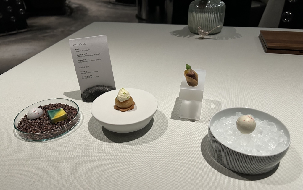 From high to low podests it was a standard canelé, a black forest rearrangement without Kirschwasser in form of a cherry with cherry jelly and chocolate mousse, A coco almond passionfruit praline and a lemon curd Grand Marnier Baba with candied oranges. All four I liked very much.