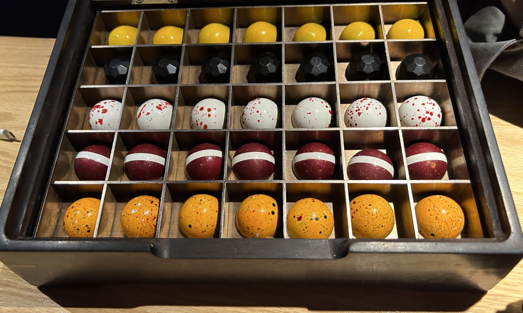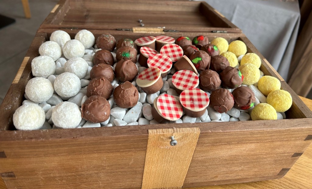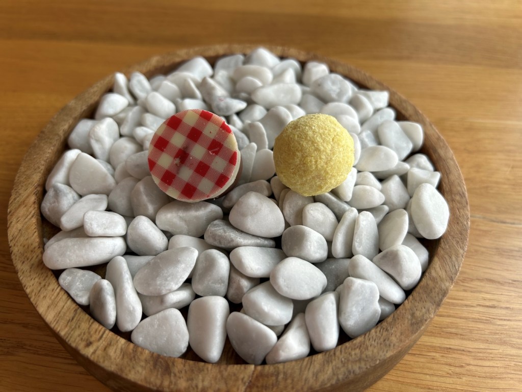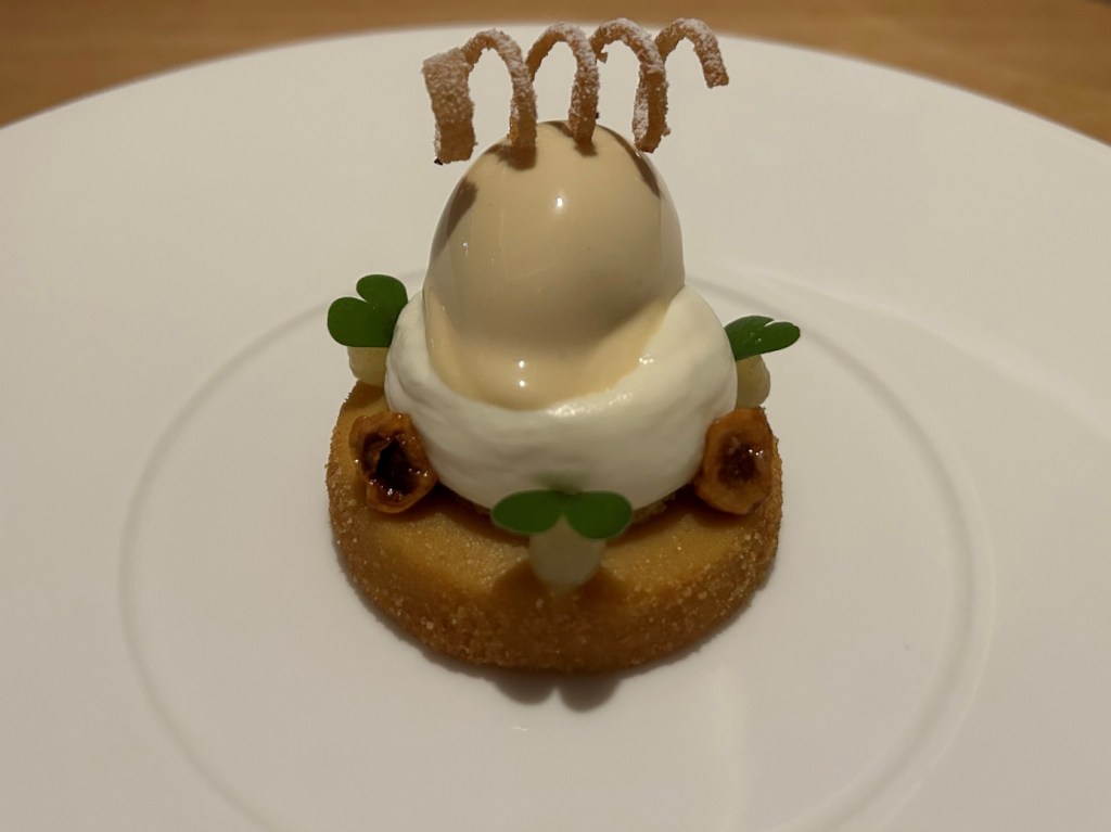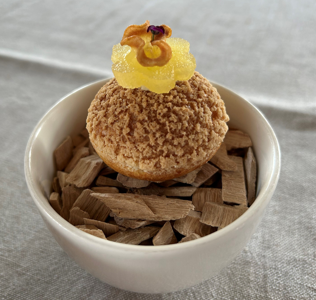 From high to low podests it was a standard canelé, a black forest rearrangement without Kirschwasser in form of a cherry with cherry jelly and chocolate mousse, A coco almond passionfruit praline and a lemon curd Grand Marnier Baba with candied oranges. All four I liked very much.