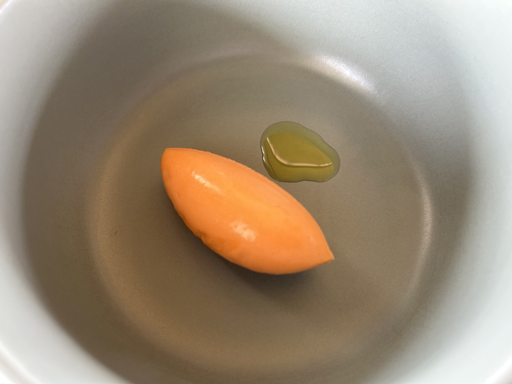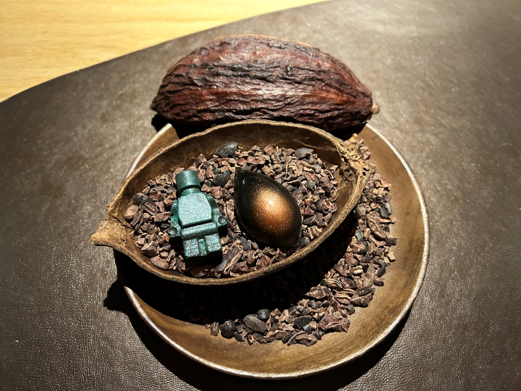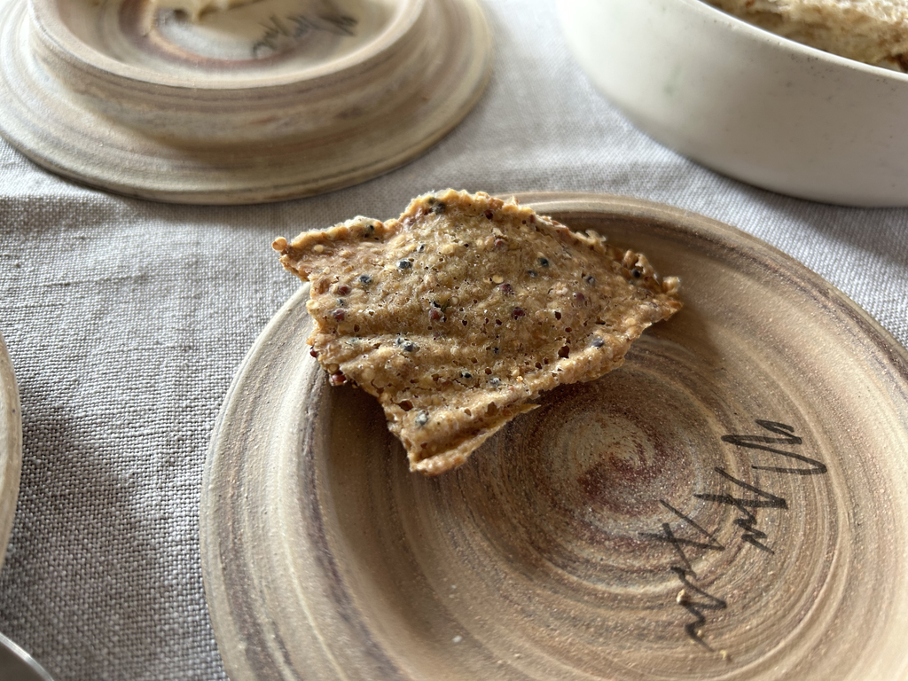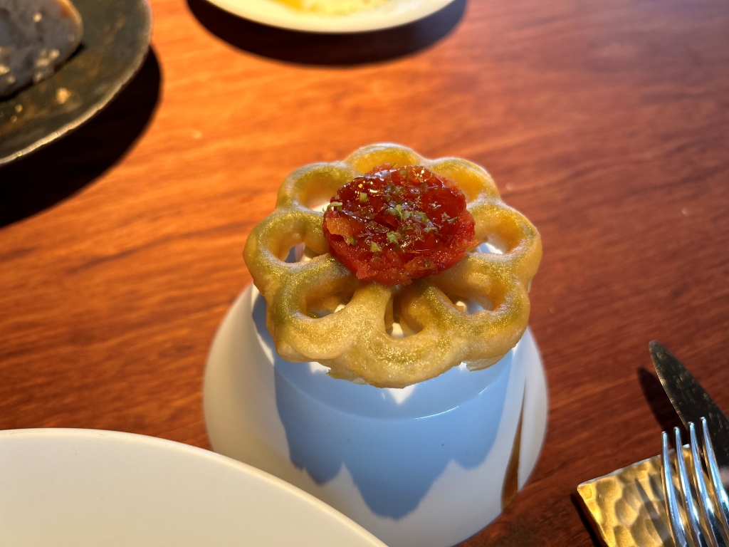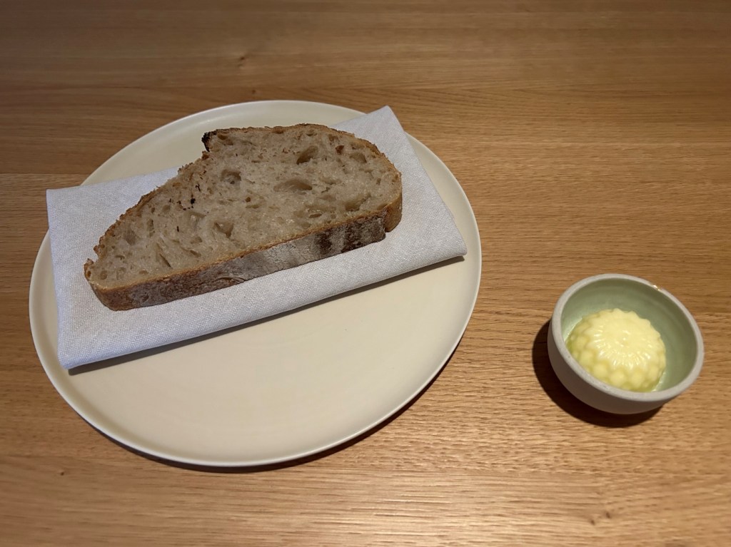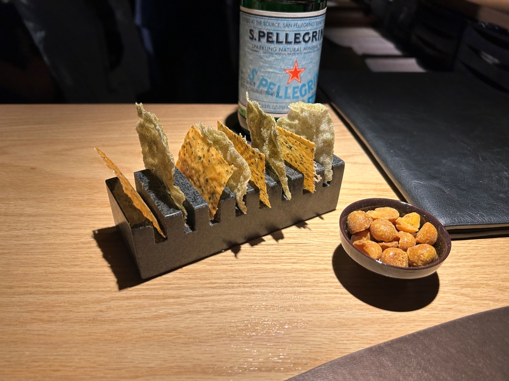 The restaurant, run by German Stefan Stiller, who has a second two Michelin Macaron restaurant of the same name in Gangzhou as well as two other restaurants in Shanghai and Gangzhou, respectively, is not exactly on a street where you would expect to find such a restaurant. Finally, at the end of a dead end road, the glow of a red sign, which could be a Michelin badge, pointed the way. After ringing the bell next to the door, I am one of the first guests to enter the dining room, where a kitchen counter with seating for 20 people is grouped in a U-shape around the kitchen. There are also two booths, each seating 4 people, and an event location nearby, as indicated by the various trays of food being carried out through the entrance. The restaurant will be fully booked tonight. The patron is on site, checking occasionally preparations and crossing off the outgoing dishes on the receipts of the individual groups of guests next to the pass. As I greet the restaurant team with a clear “Good Evening” and a “Guten Abend”, the patron greets me personally. After clarifying the water issue, wafer- thin bread crackers and caramelized peanuts are placed in front of me.