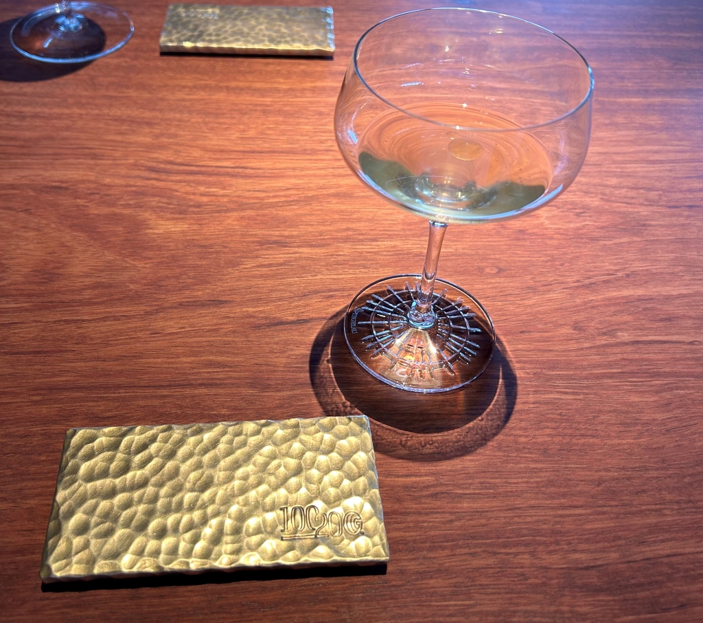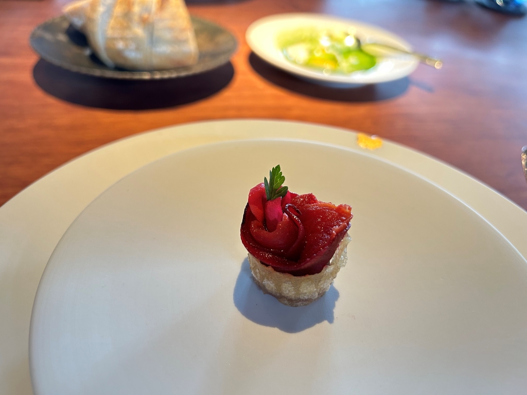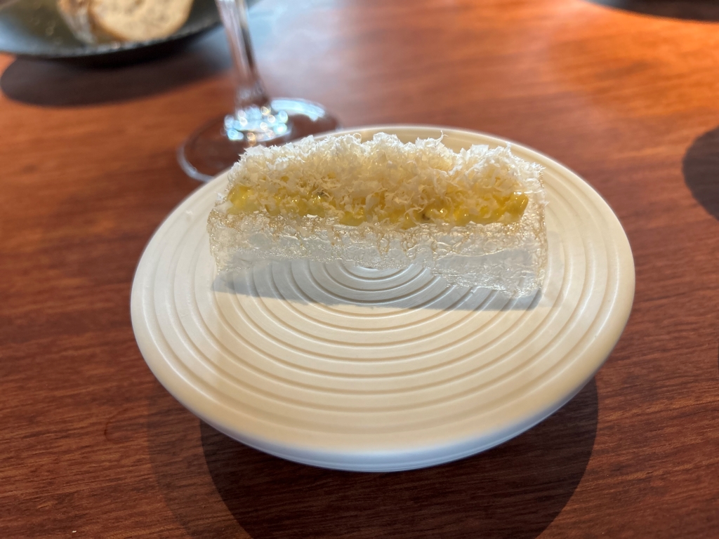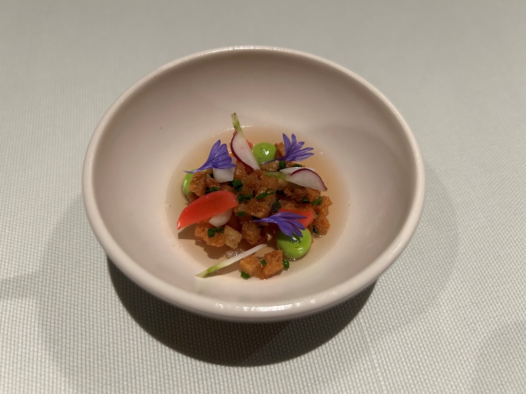 When I did my reservation, more than two month ago a payoff of RMB 2000 was already booked from my credit card. The starting point of the menu is the 8-course core menu, with various salty and sweet snacks before and after the main dishes, which changes every 6-8 weeks to reflect the seasons. In addition to the core menu, they also offer two supplemental selections: Taian Table’s signature dishes from past menus, as well as limited-time seasonal specials. The guest selects two or four dishes from these classics and specials to add to the core menu, and customizes the dinner according to appetite, diet and personal preference. The end price of the menu depends then from the number of additional courses selected. Until the day of my visit, menu No. 42 was displayed on the website, but I already suspected it, on the evening menu no 43 was handed-out to me. From another review, I knew already that the classic lamb should be good and for the second additional course, my choice fluctuated between the new seasonal specialty veal tatar and the king crab. I wanted to limit my wine consumption and decided as a start beginning with the first courses for a glass of 2021 Domaine Fouassier, Sancerre, Sauvignon Blanc, Loire Valley | France