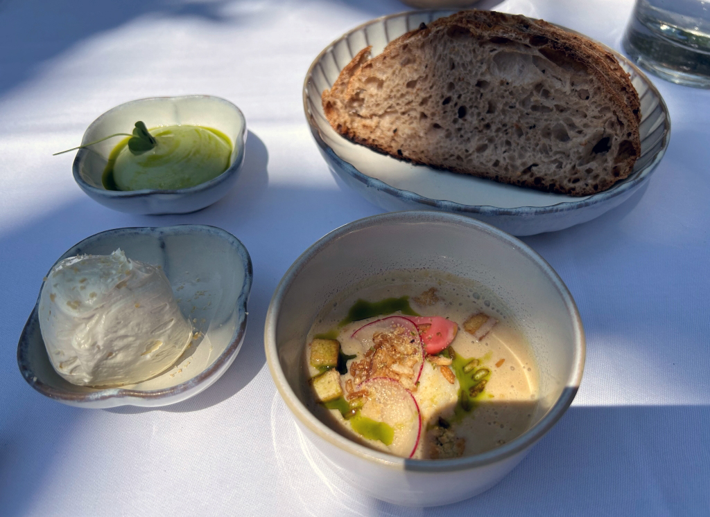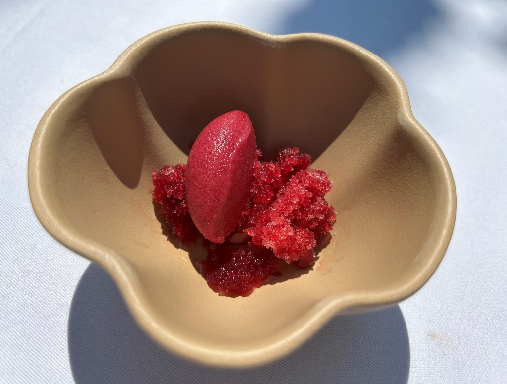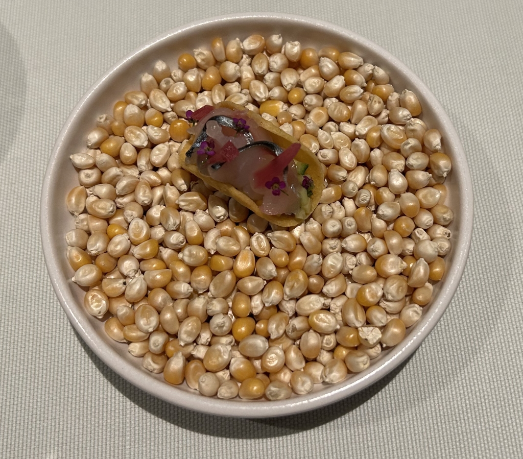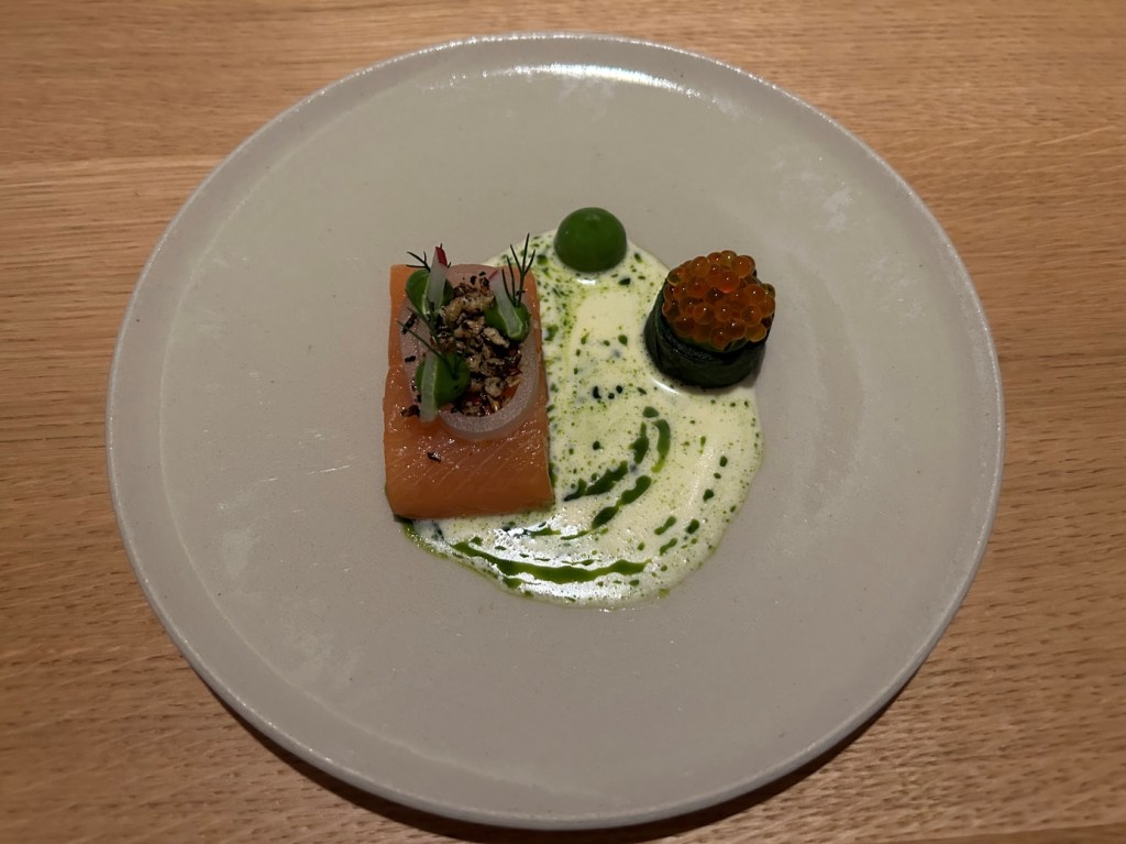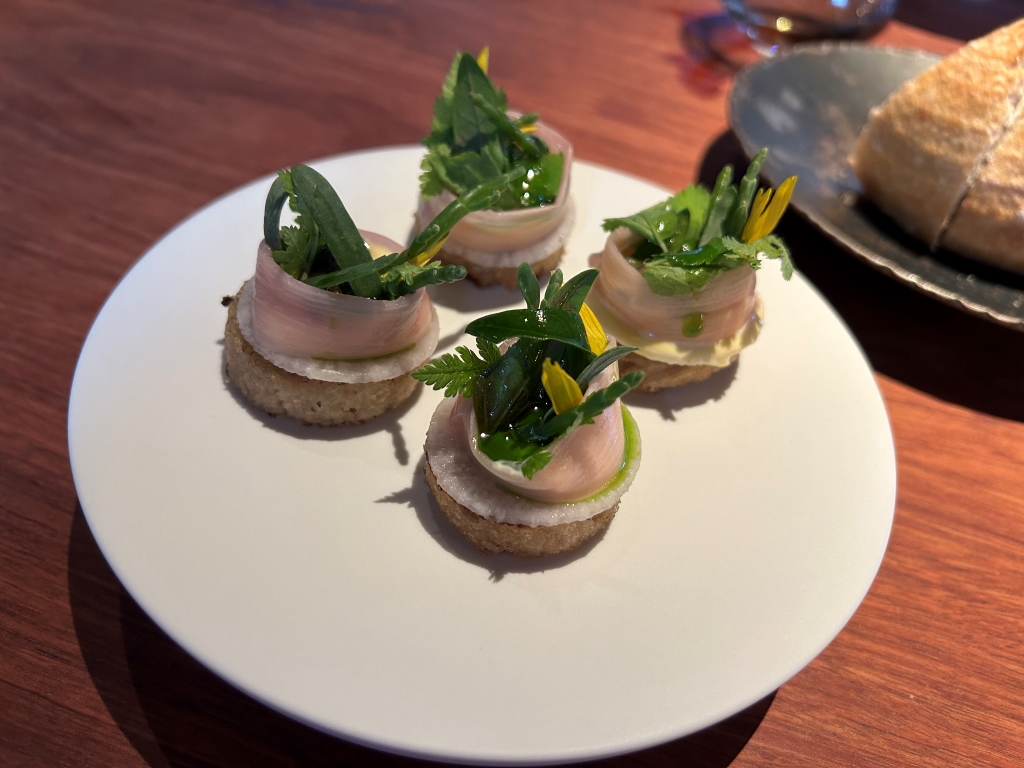 When I did my reservation, more than two month ago a payoff of RMB 2000 was already booked from my credit card. The starting point of the menu is the 8-course core menu, with various salty and sweet snacks before and after the main dishes, which changes every 6-8 weeks to reflect the seasons. In addition to the core menu, they also offer two supplemental selections: Taian Table’s signature dishes from past menus, as well as limited-time seasonal specials. The guest selects two or four dishes from these classics and specials to add to the core menu, and customizes the dinner according to appetite, diet and personal preference. The end price of the menu depends then from the number of additional courses selected. Until the day of my visit, menu No. 42 was displayed on the website, but I already suspected it, on the evening menu no 43 was handed-out to me. From another review, I knew already that the classic lamb should be good and for the second additional course, my choice fluctuated between the new seasonal specialty veal tatar and the king crab. I wanted to limit my wine consumption and decided as a start beginning with the first courses for a glass of 2021 Domaine Fouassier, Sancerre, Sauvignon Blanc, Loire Valley | France