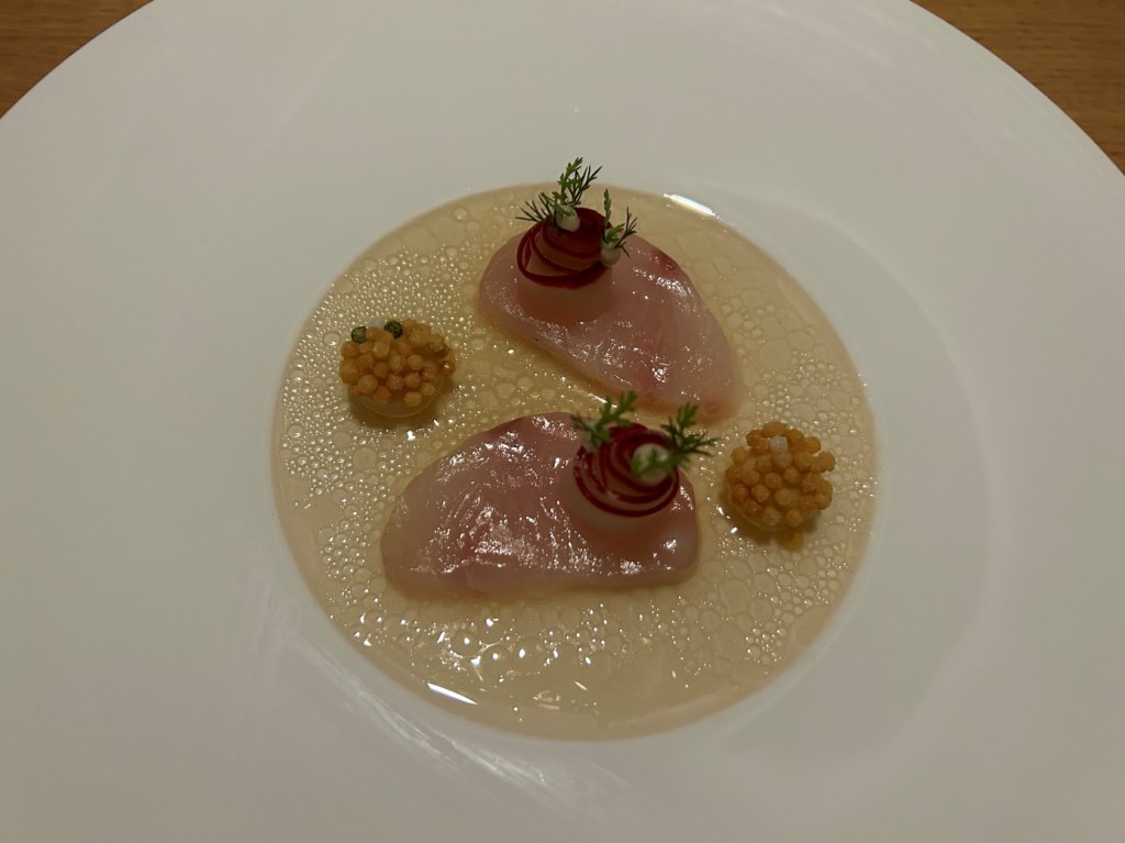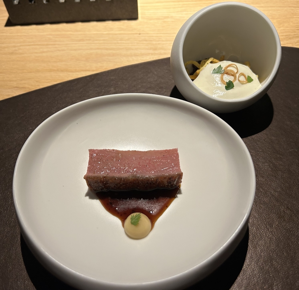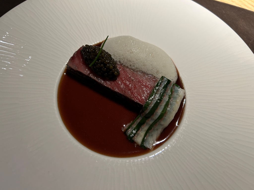 This piece of wagyu of the highest quality A5 was the first of its kind that tasted for me according to enthusiastic descriptions in other reviews. With its high evenly distributed fat content it melted literally in the mouth. Responsible for it is the right preparation applied here. The sirloin was short-grilled from both sides for a couple of 10 seconds on a charcoal grill at around 450 °C. It was served with a smoked eel (unagi = fresh water eel) carpaccio, a spoonful of caviar, an eel foam and a mild sauerkraut below the foam. The sauerkraut did not pair well with the wagyu. I ate it separately. All other components in combination were fantastic.