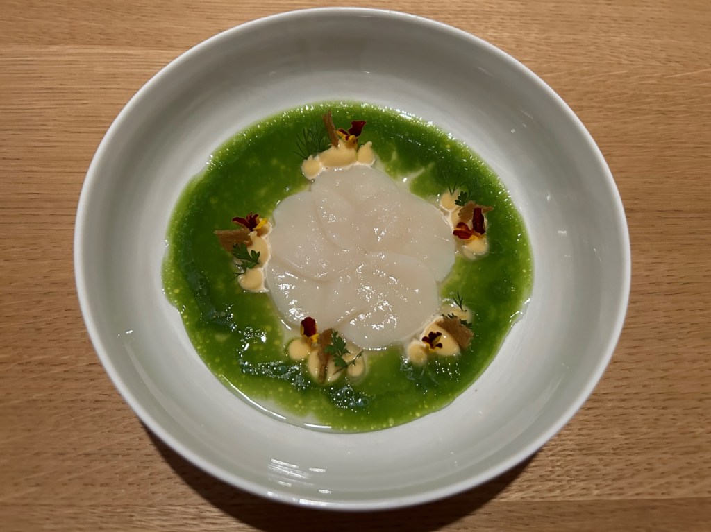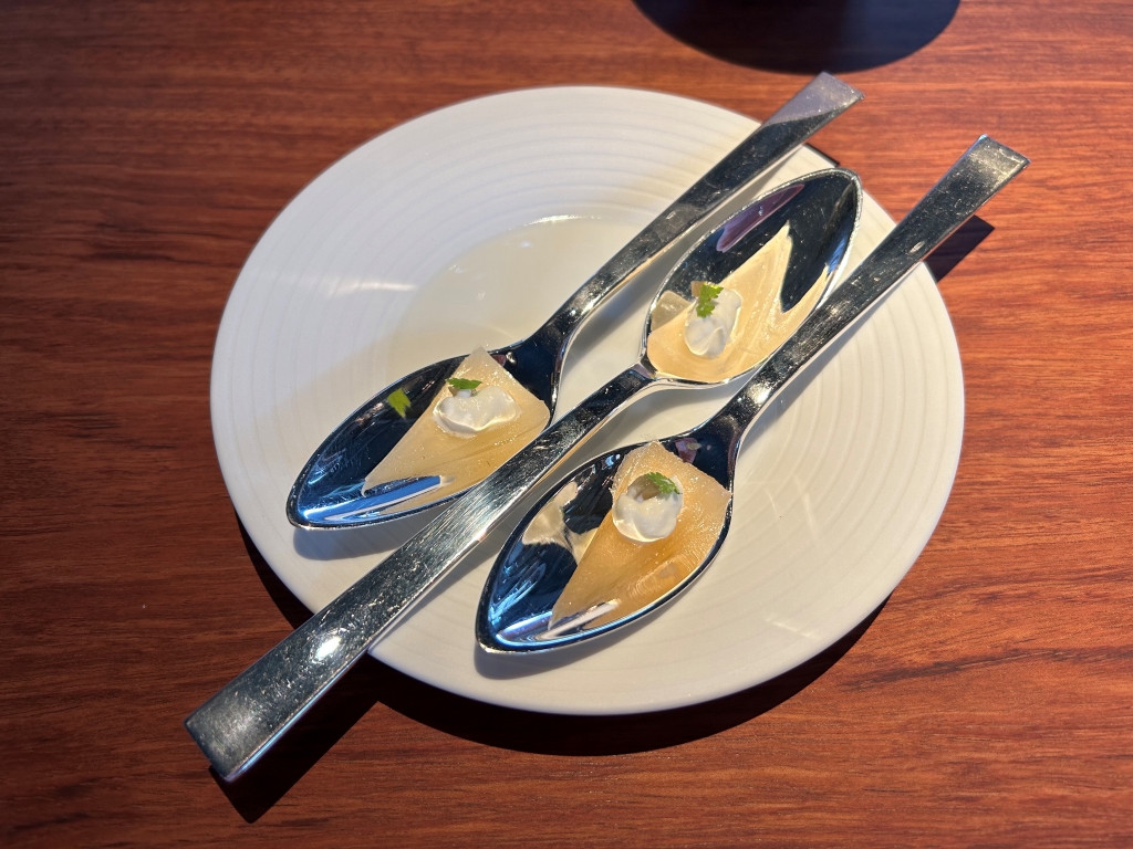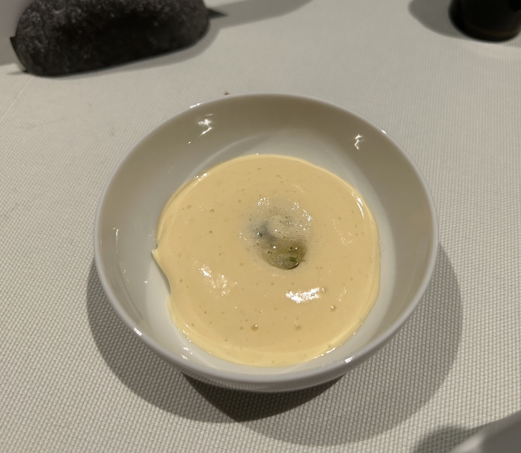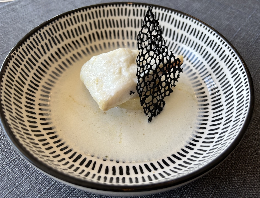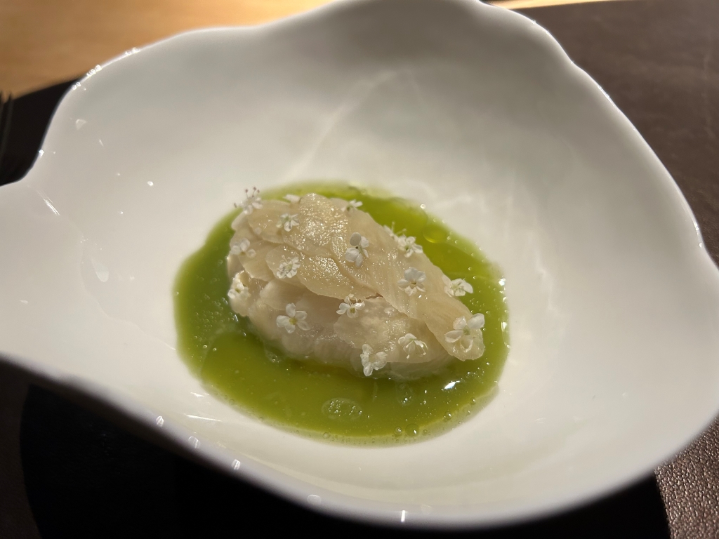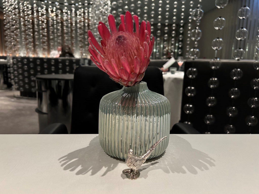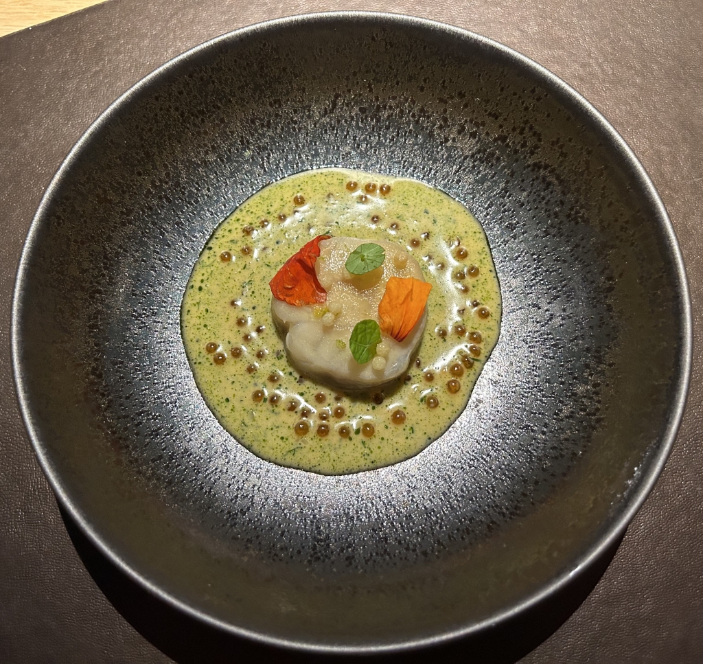 The restaurant is full in the meantime. Some may describe the atmosphere as vibrant, some others maybe simply as noisy. The kitchen noise, the talking guests, phone calls and music in the background contribute to this. Guests were mainly Chinese, three including me looked European. Chinese guests are different from western fine diners. They become impatient if they do not get the next course after 10 minutes. They have no problem with using their telephone at the table. One guest was told by the service to stop phoning several times. It was uncomfortable for the service and they saw that I was dissatisfied with this but they could not help. As a compensation, I got another generously filled glass of the Sancerre.