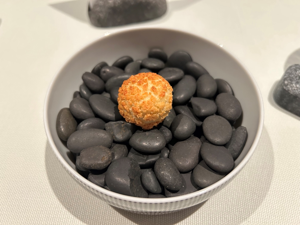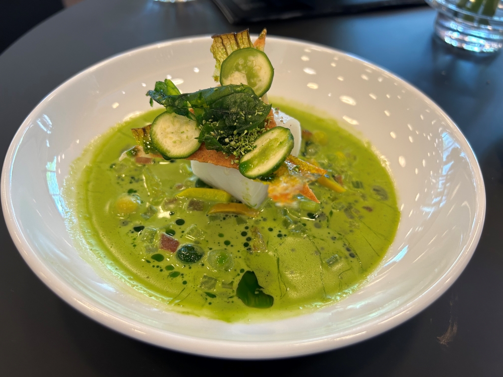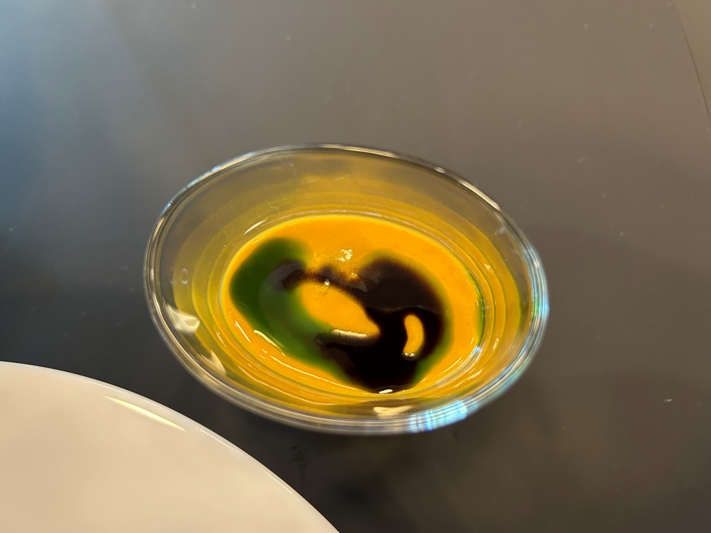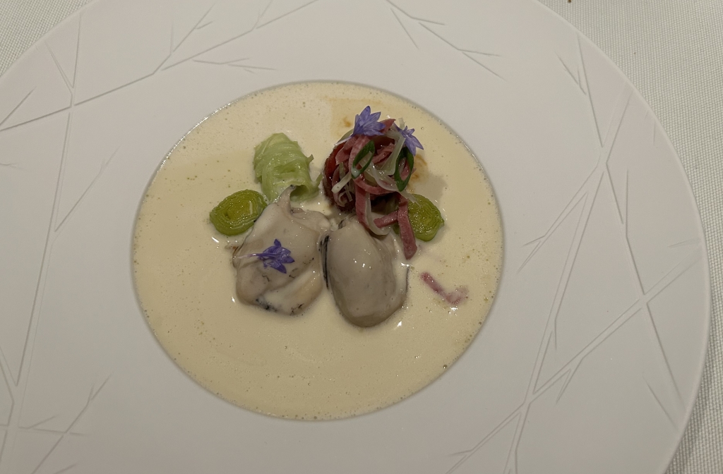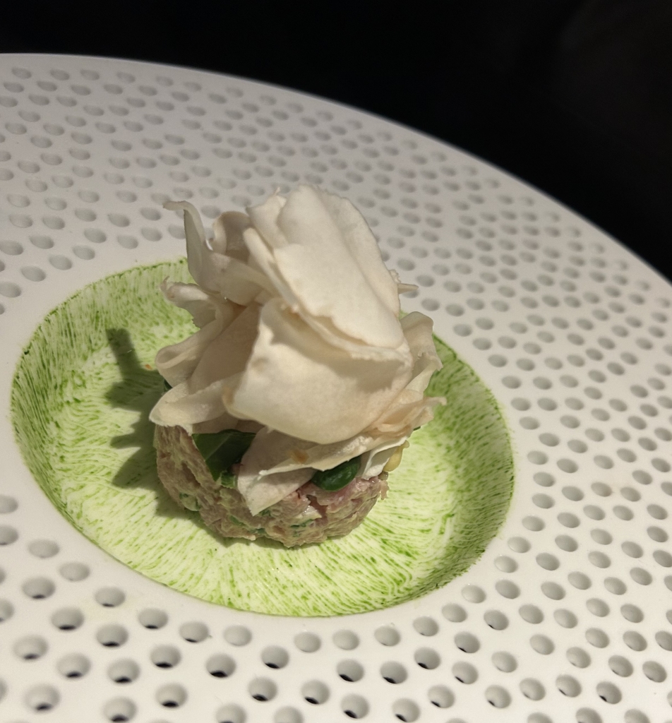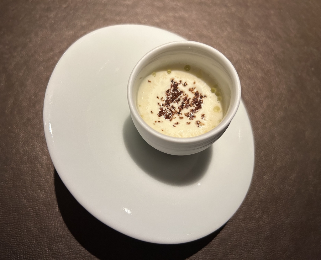 The restaurant is full in the meantime. Some may describe the atmosphere as vibrant, some others maybe simply as noisy. The kitchen noise, the talking guests, phone calls and music in the background contribute to this. Guests were mainly Chinese, three including me looked European. Chinese guests are different from western fine diners. They become impatient if they do not get the next course after 10 minutes. They have no problem with using their telephone at the table. One guest was told by the service to stop phoning several times. It was uncomfortable for the service and they saw that I was dissatisfied with this but they could not help. As a compensation, I got another generously filled glass of the Sancerre.