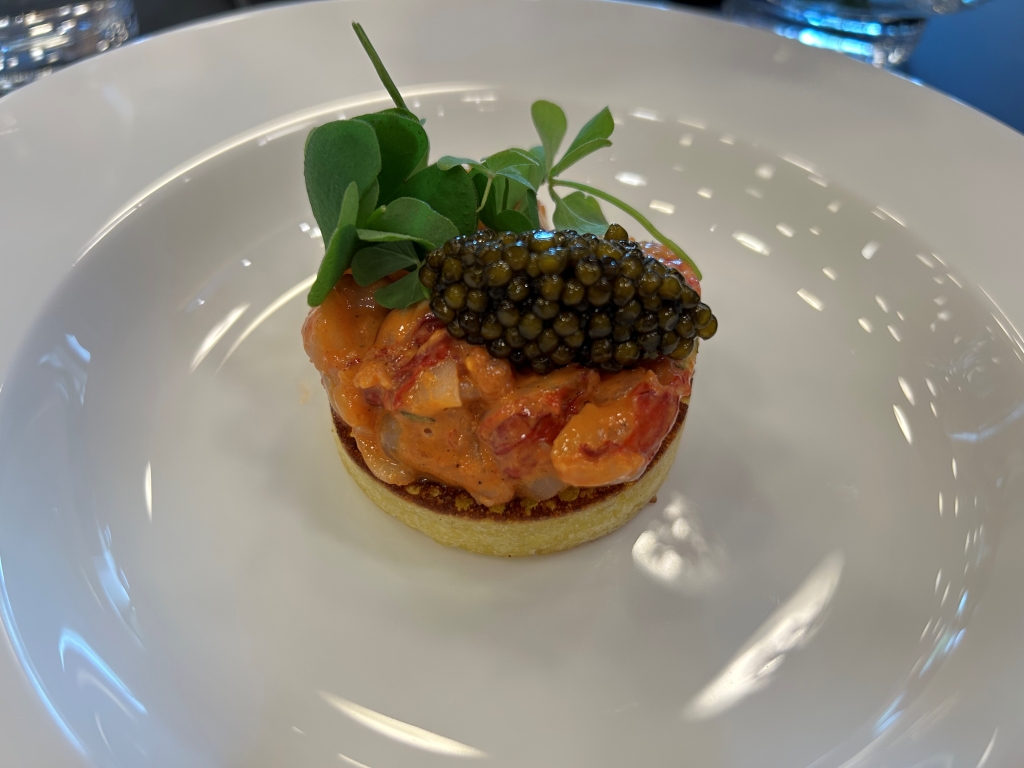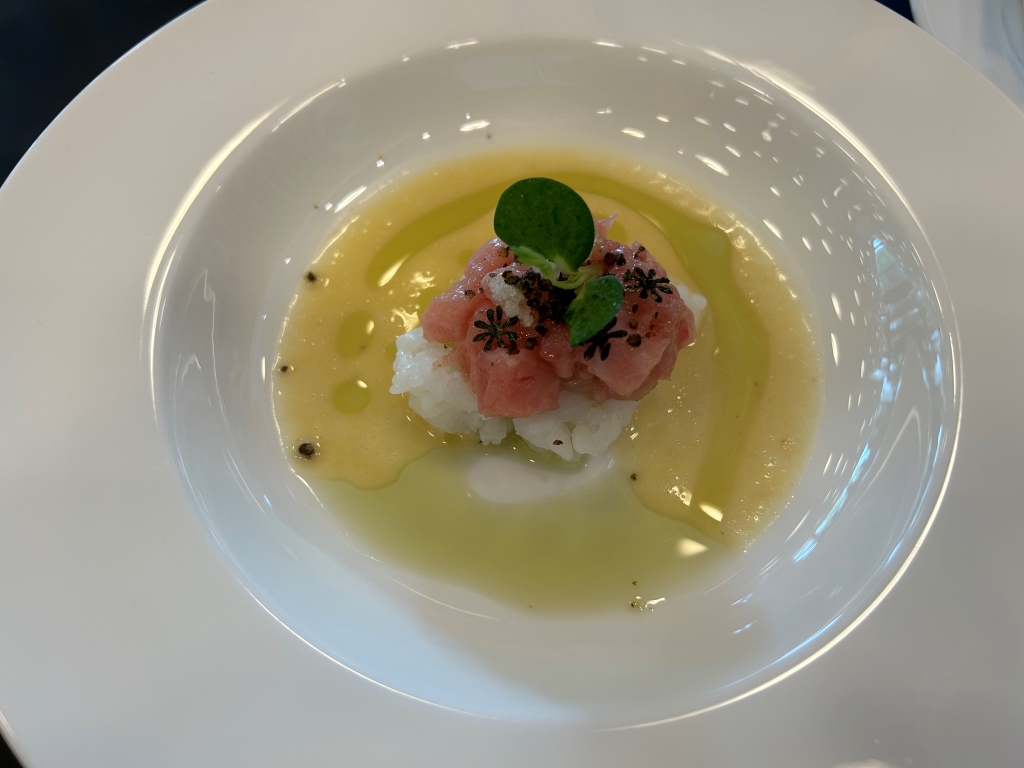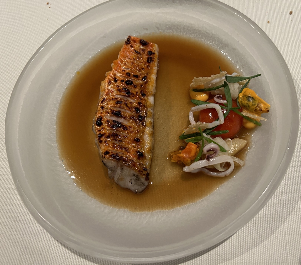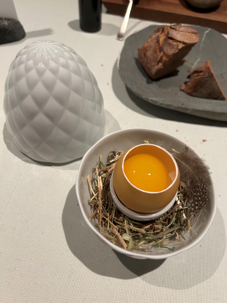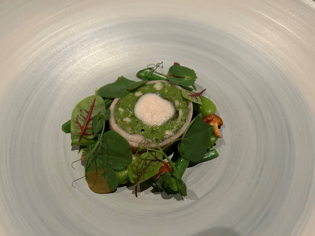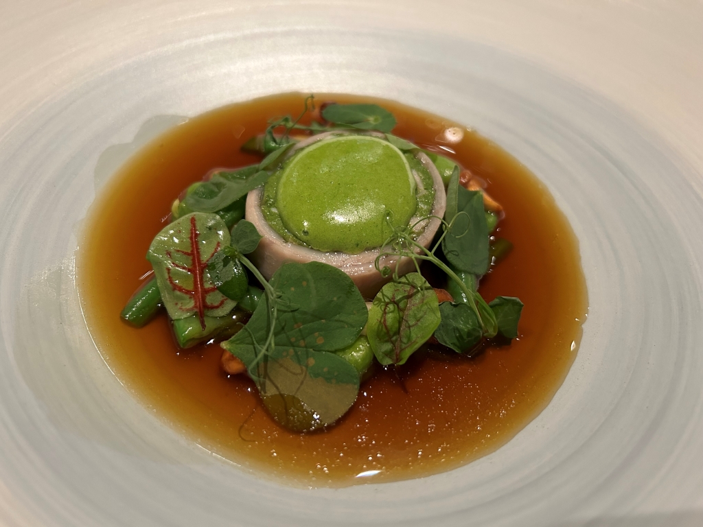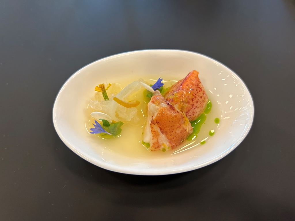 The restaurant is full in the meantime. Some may describe the atmosphere as vibrant, some others maybe simply as noisy. The kitchen noise, the talking guests, phone calls and music in the background contribute to this. Guests were mainly Chinese, three including me looked European. Chinese guests are different from western fine diners. They become impatient if they do not get the next course after 10 minutes. They have no problem with using their telephone at the table. One guest was told by the service to stop phoning several times. It was uncomfortable for the service and they saw that I was dissatisfied with this but they could not help. As a compensation, I got another generously filled glass of the Sancerre.