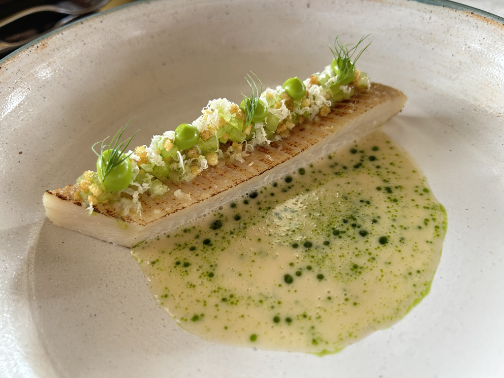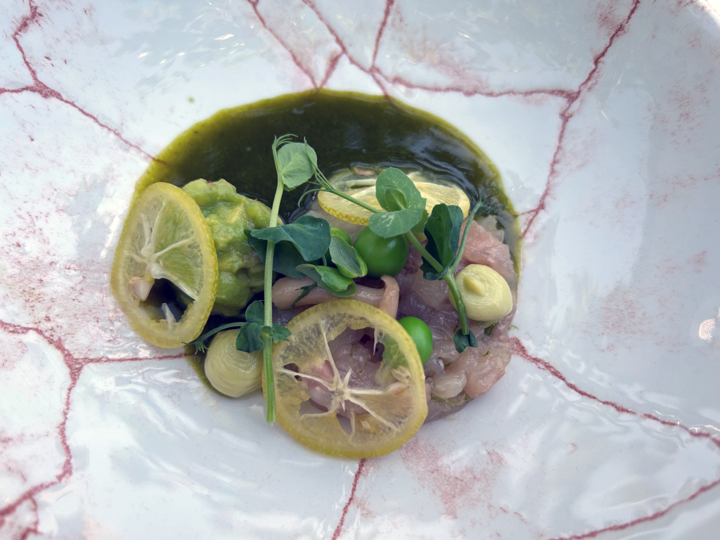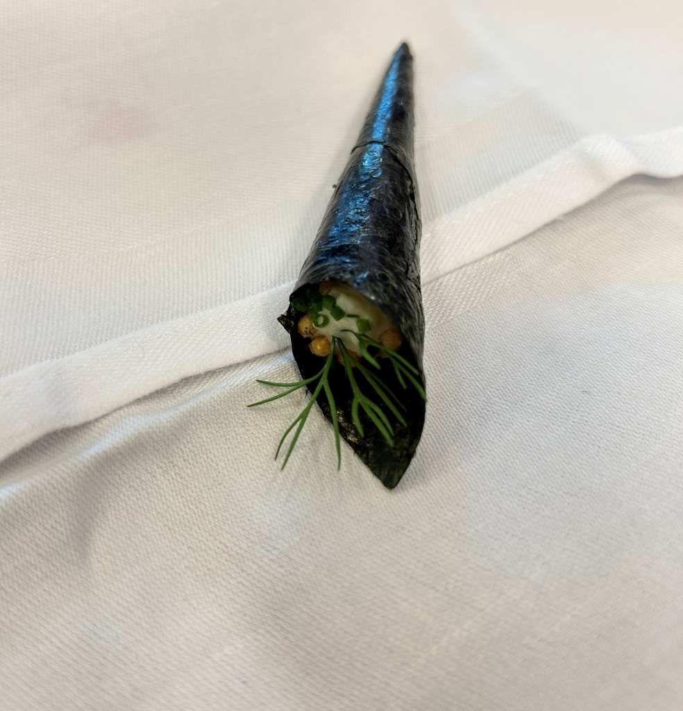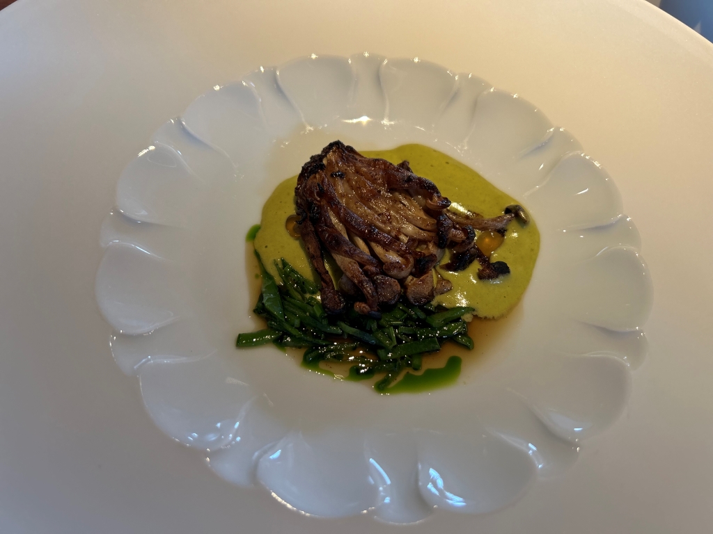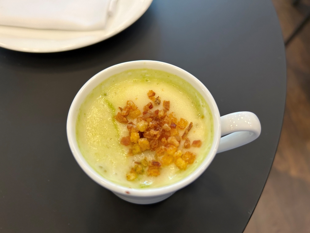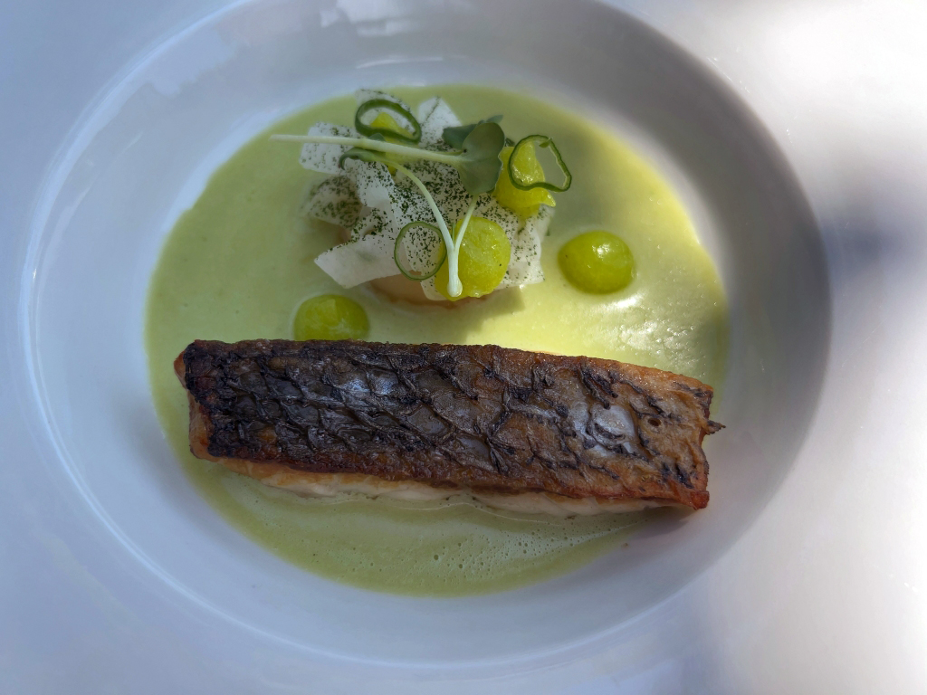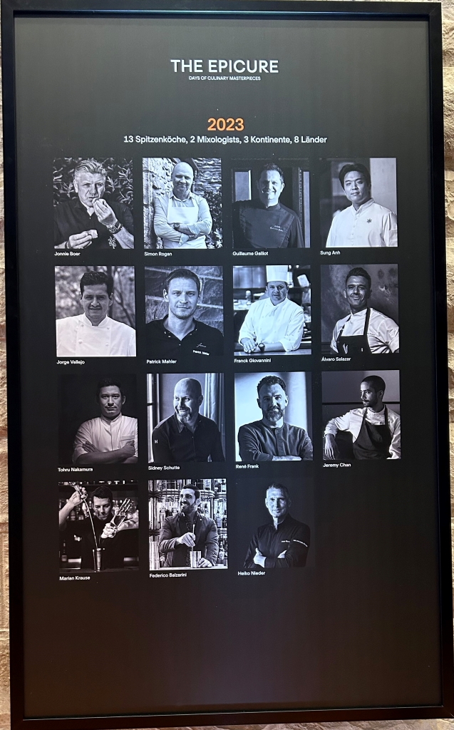 The restaurant is full in the meantime. Some may describe the atmosphere as vibrant, some others maybe simply as noisy. The kitchen noise, the talking guests, phone calls and music in the background contribute to this. Guests were mainly Chinese, three including me looked European. Chinese guests are different from western fine diners. They become impatient if they do not get the next course after 10 minutes. They have no problem with using their telephone at the table. One guest was told by the service to stop phoning several times. It was uncomfortable for the service and they saw that I was dissatisfied with this but they could not help. As a compensation, I got another generously filled glass of the Sancerre.