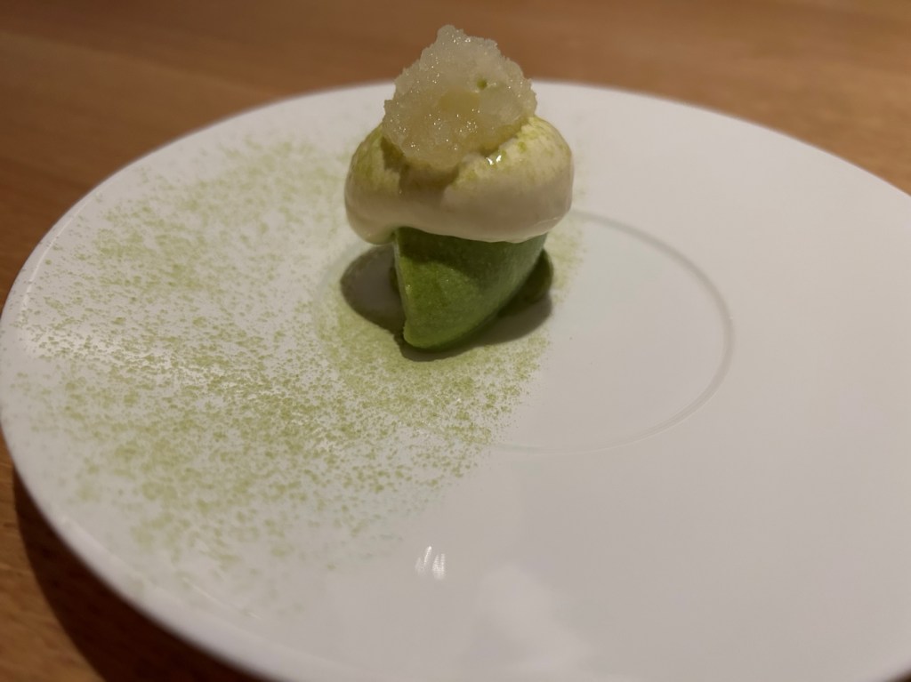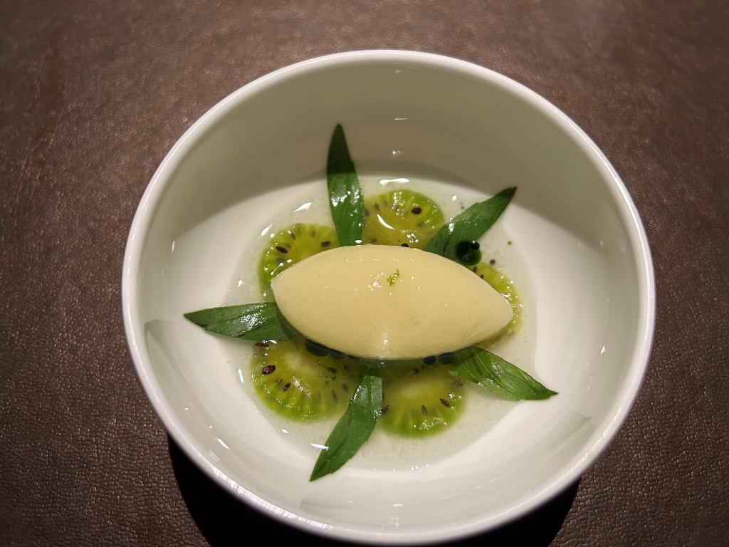 Before main course as a palette neutralizer sorbet and slices of kiwi with Thai basil and Nigori Saki poured at the table was served. In my opinion, this should have been served two courses ago when the transition from fish and crustaceans to meat happened. The content of the cup itself was very good.
