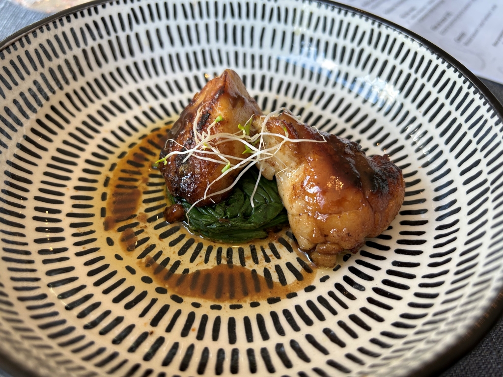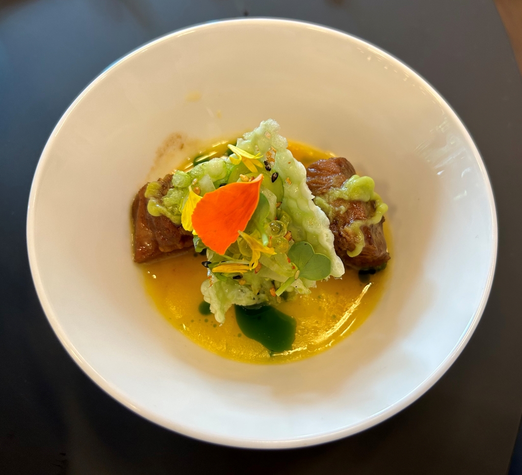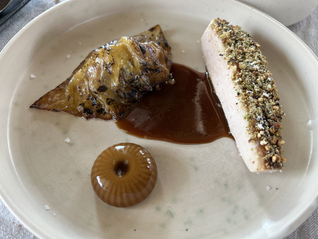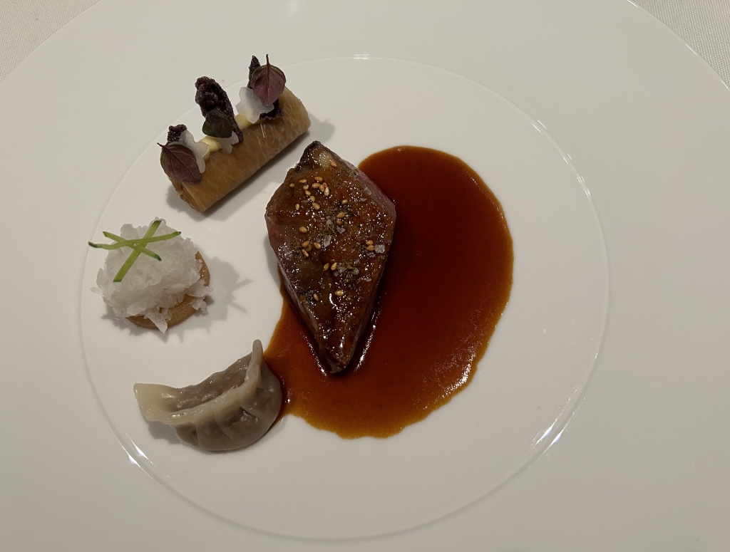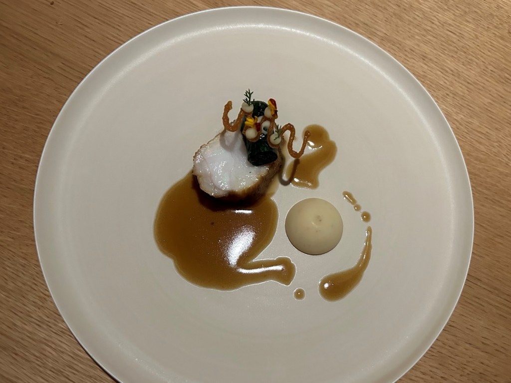 A dressed piece of the yellow croaker with an excellent sauce with Shao Xing Wine (= a traditional Chinese vin jaune), sea buckthorn without adding prominent acidity, dill and keta caviar. Rice pearls on the fish added crispyness. Nasturtium leaves and flowers on top. Star on the plate was clearly the sauce: well balanced with delicate dill aroma, went very well with the fish without overpowering.