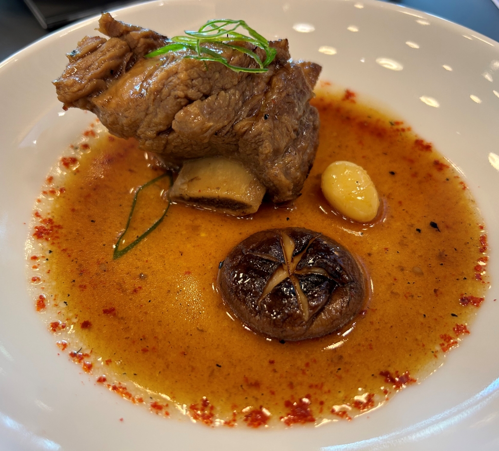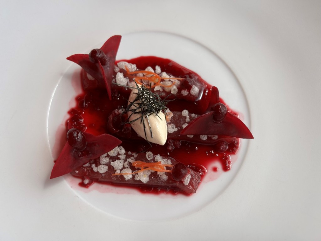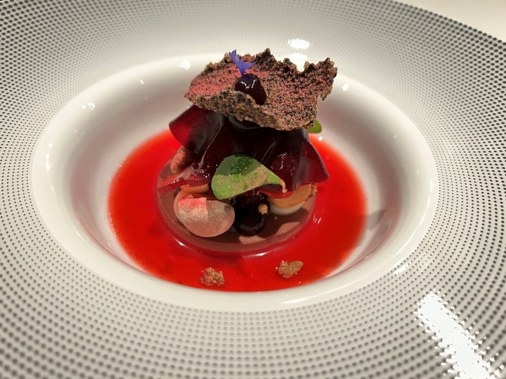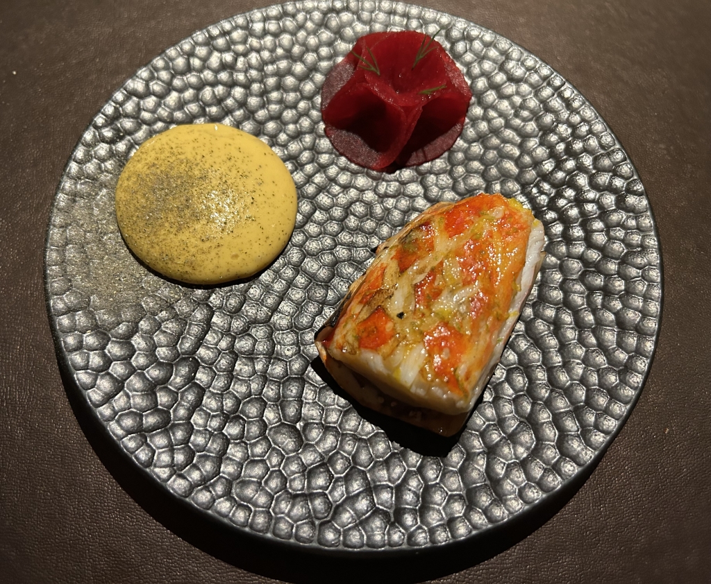 Inserted as an extra course from the Classics section by the chef: leg of grilled king crab (sweet) with nice smoke aromas, miso hollandaise delivering a lot of umami, pickled red beet rose with earthy acidity.