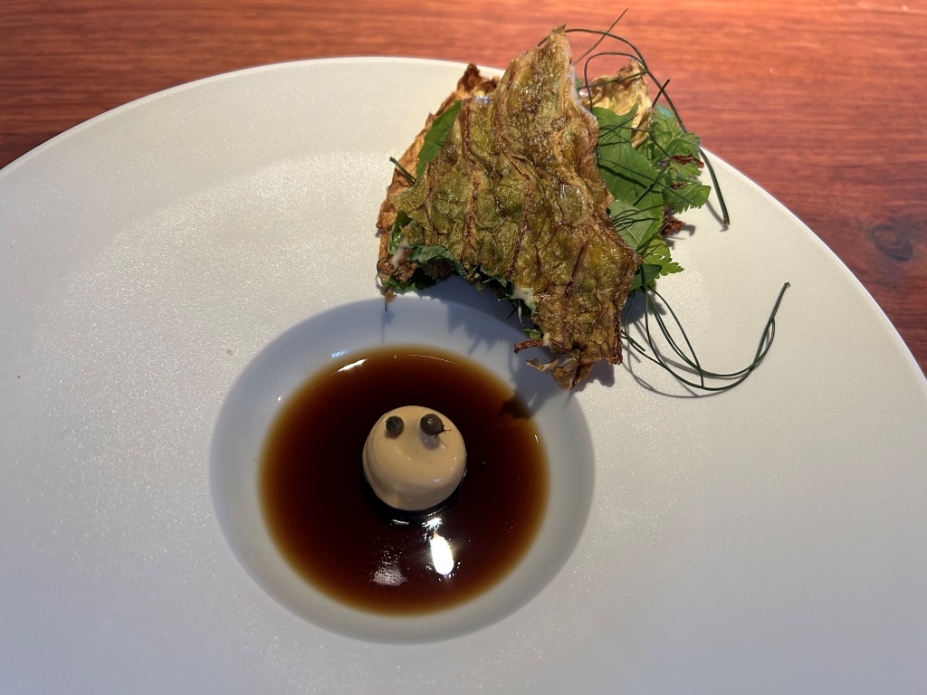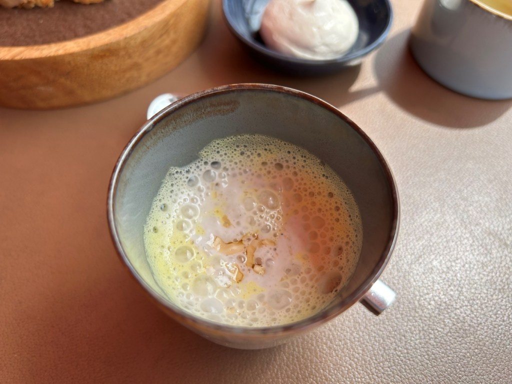 First, a mushroom soup with marinated shiitake mushrooms from Yunan at the bottom, a beurre noisette espuma and nut butter flakes was served. This had an intense umami taste and showed a first glimpse of the excellent cooking craft.