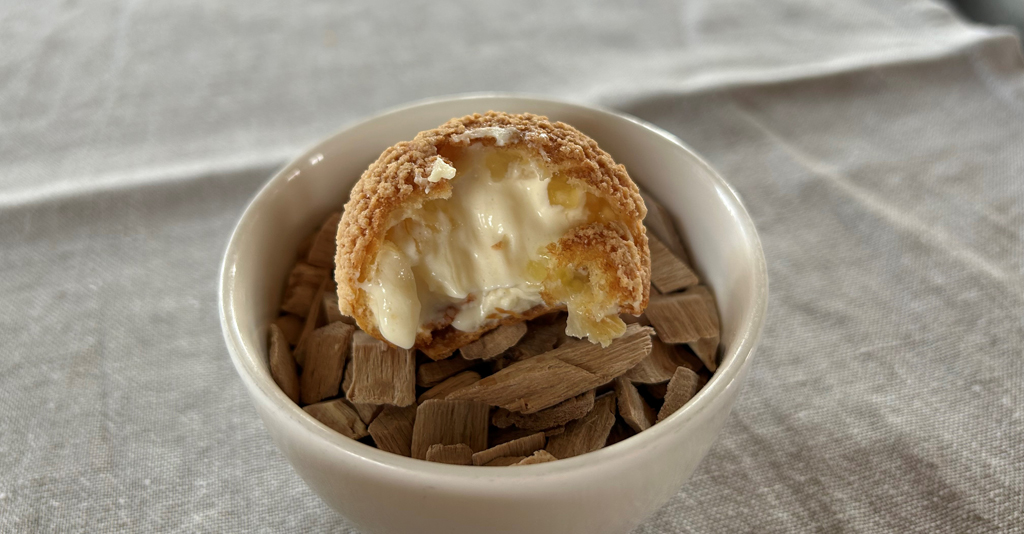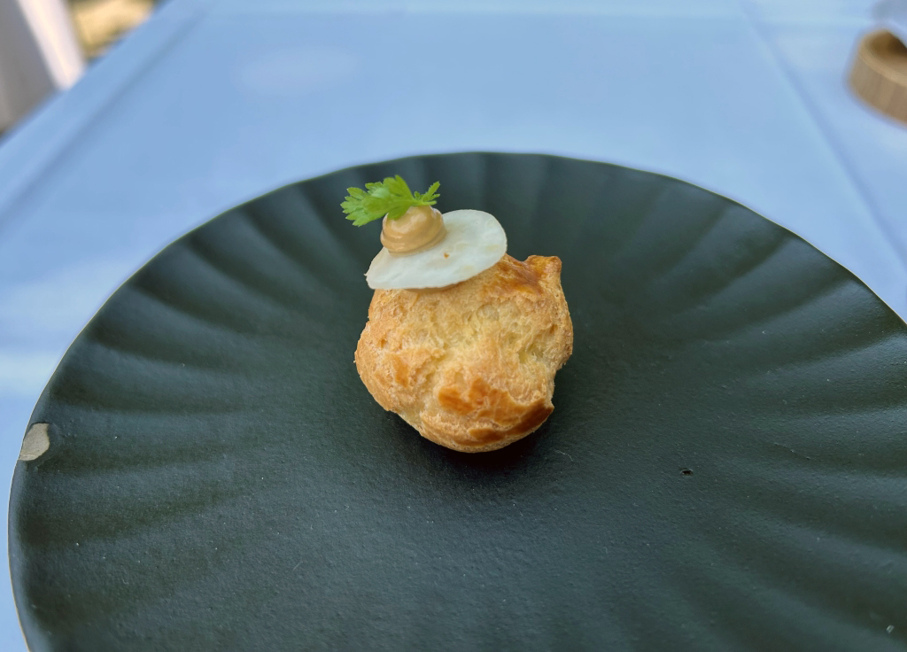 – a puff pastry filled with sardine mousse decorated with a melon disc and flowers, and