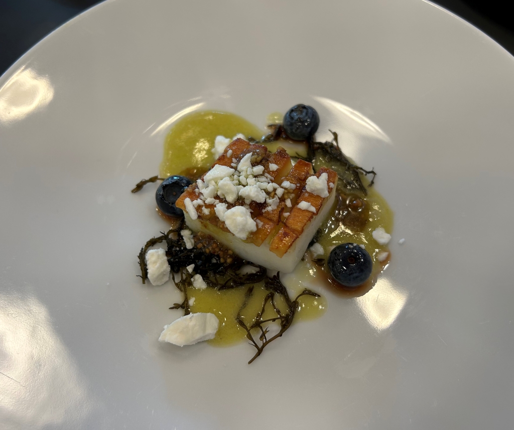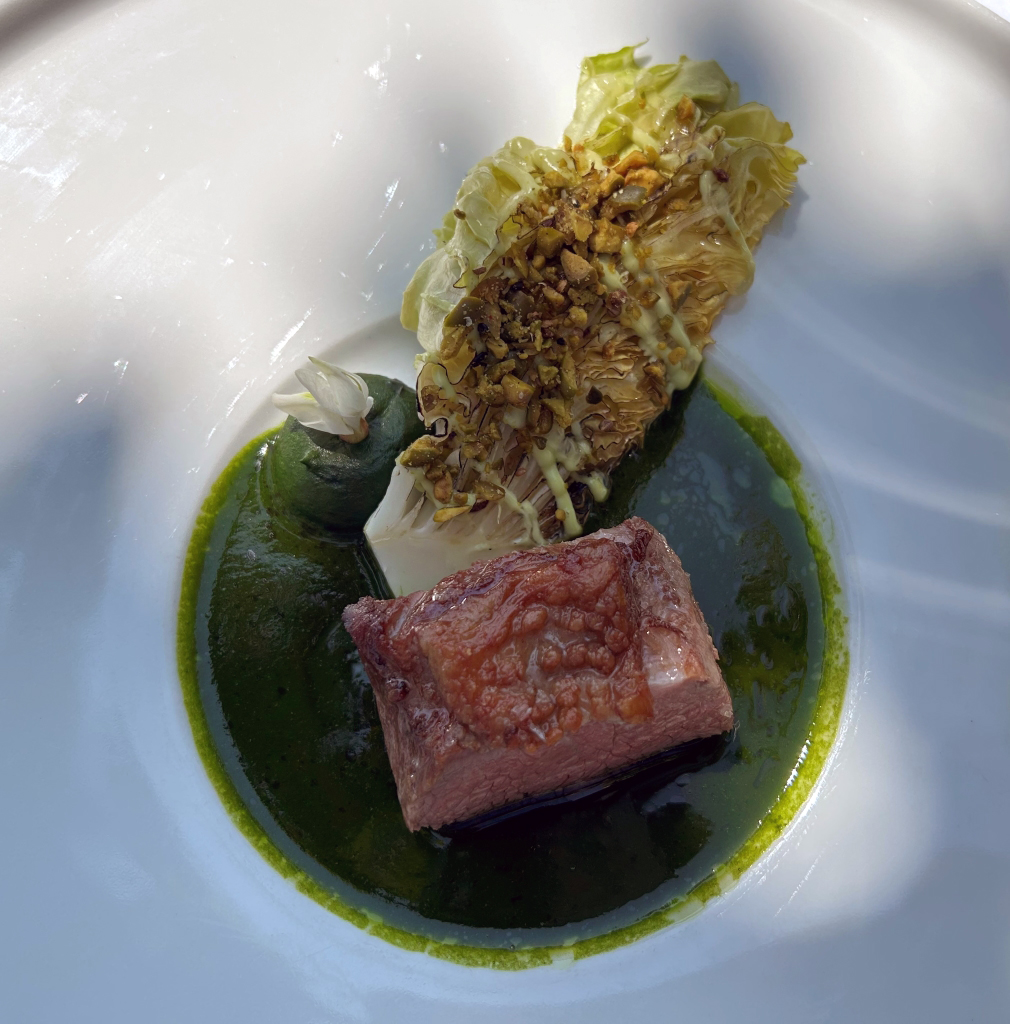 Served by Christiaan: Duck dry-aged for 3 days, de-boned, marinated for 6 to 8 hours, sous- vide pre-cooked. Then layered with dough, Spitzkohl, boudin noir sausage. The loaf is then baked like a filet wellington. The result of this complex preparation is an almost in the mouth melting tender piece of meat. It was served with white onion sauce, pickled onions and powder of the baked onion. A classical duck jus infused with blackberries completes the plate. An intense duck consommé is served aside.