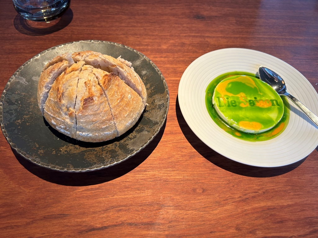 Christiaan served me this course and explained it to me in German. Three days aged Kampachi, two times marinated, the second time with a vinaigrette containing yuzu. Water bamboo slices on top of a jelly, homemade yoghurt and a green rhubarb vinaigrette. A fantastic course with very fresh tasting Kampachi, firm bamboo and well-balanced acidity by the vinaigrette; for me a true three-macaron Michelin course.