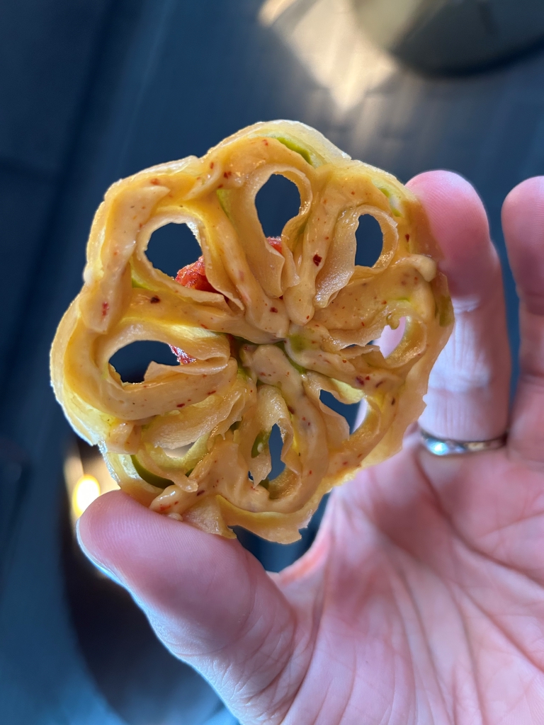 – a tartelette filled with beef tatar, pear, cucumber kimchi made with Korean red chili paste and egg yolk crème.