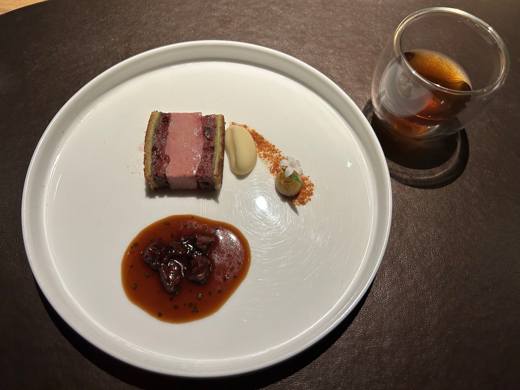 Foie gras terrine with dark chocolate, XO crème and fermented plum, aside brioche backed with XO crème